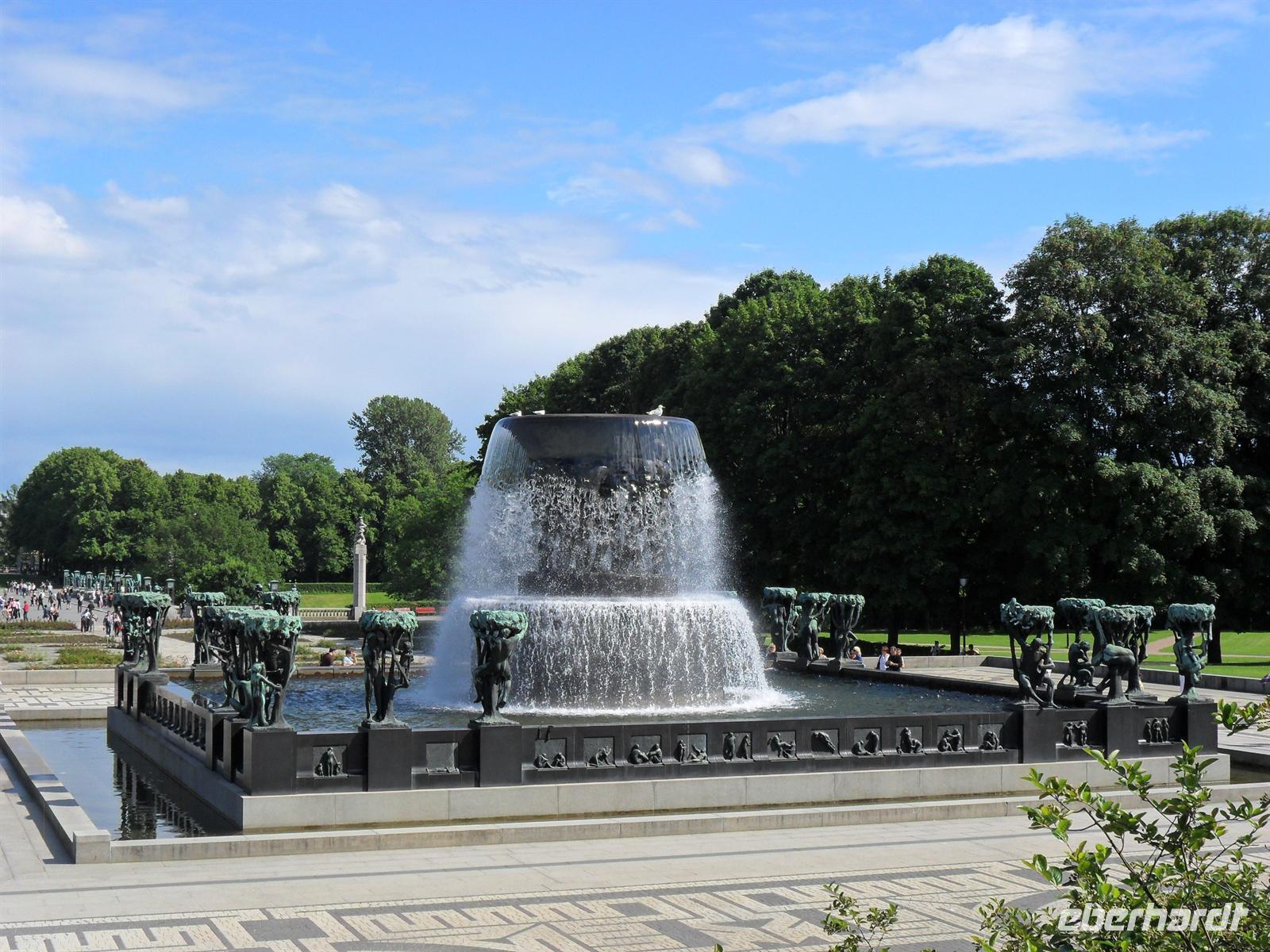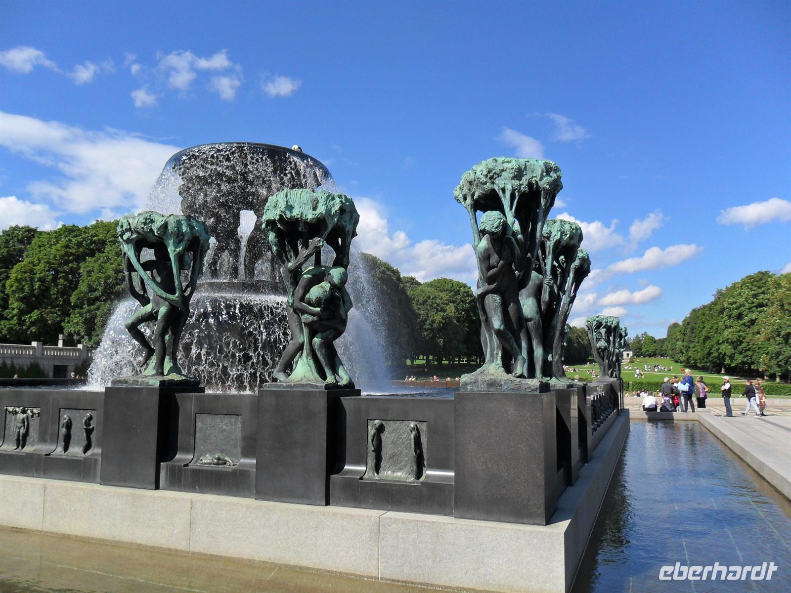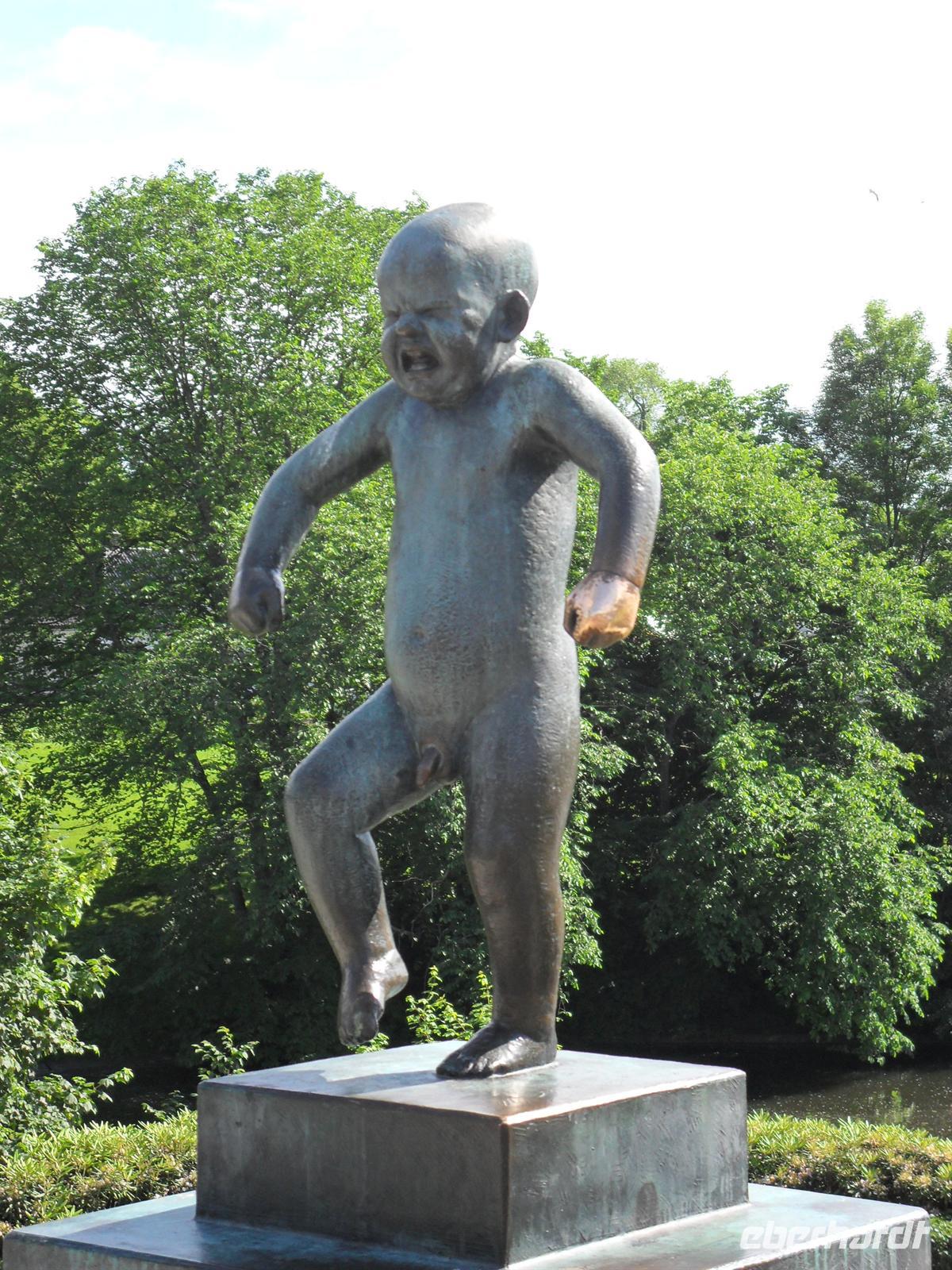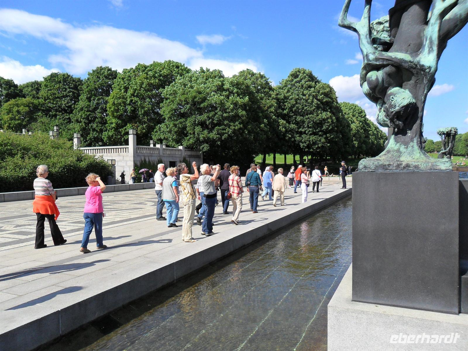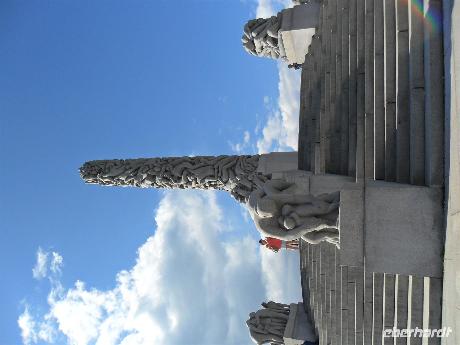 Abschließend folgte dann noch die Hauptattraktion Oslos: der Vigelandpark. Die eigentlich ?Frognerpark" heißende Vigelandanlage ist mit fast 300 Hektar der größte Park des Landes. ER wurde zwischen 1907 und 1942 nach den Ideen und mit Bildwerken nur eines einziges Künstlers gestaltet: Gustav Vigeland (1869 - 1943) gilt als der bedeutendste Bildhauer Norwegens und hinterließ im heute meist nur nach ihm genannten Park mehrere hundert Stein- und Bronzefiguren. Zahlreiche Skulpturen symbolisieren den Kreislauf des menschlichen Lebens. Unter anderem zeigt der sogenannte ?Monolitten" die Entwicklung vom Embryo über das Kleinkind und weiter alle Lebenstadien, die ein Mensch durchlebt. Um den Monolithen aus norwegischen Iddefjord-Granit selbst sind 121 sich umringende Figuren abgebildet.