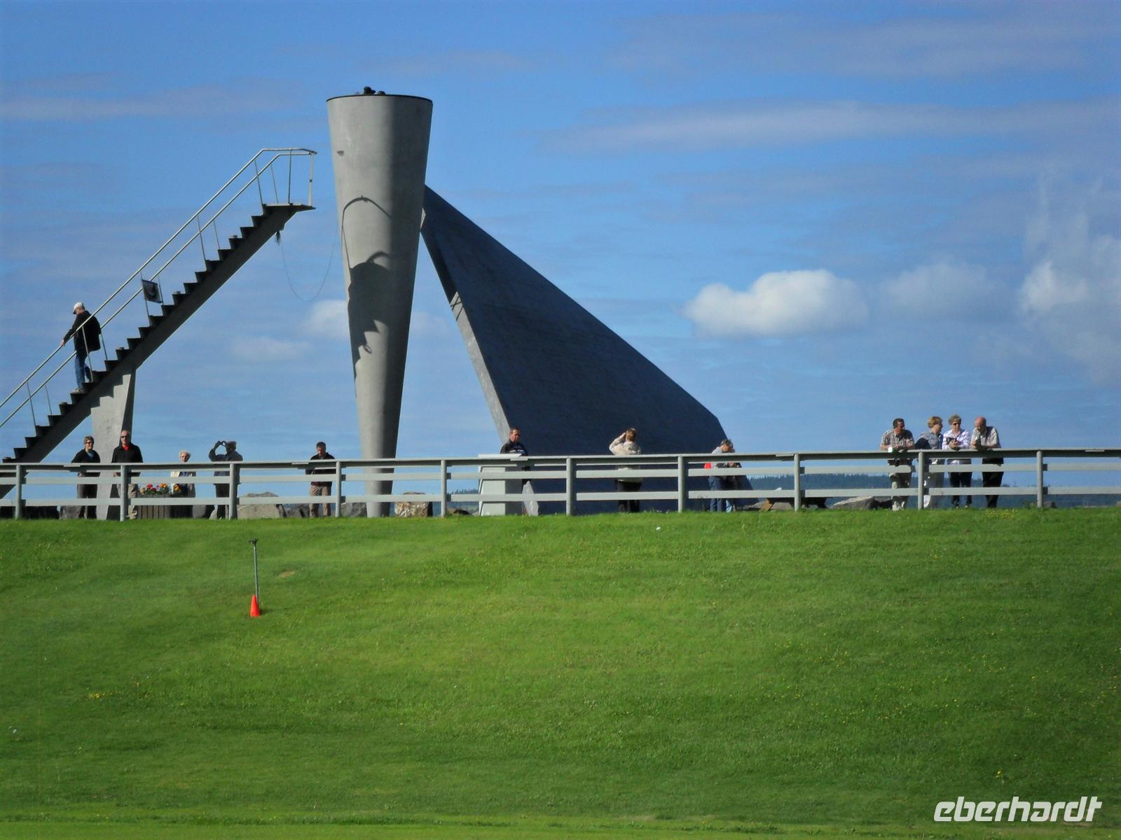 Neben dem großen Hotelparkplatz steht übrigens die Sagasäule, eine über dreißig Meter hohe Granitsäule mit Reliefs, die Geschichte Norwegens illustrieren. Hier haben wir uns nach dem Abendessen noch am Bus getroffen, um mit Käse, Keksen und dem Angebot des Bordservice das gestern gewesene Bergfest der Reise und die gerade vergangene norwegische Mittsommer zu feiern!