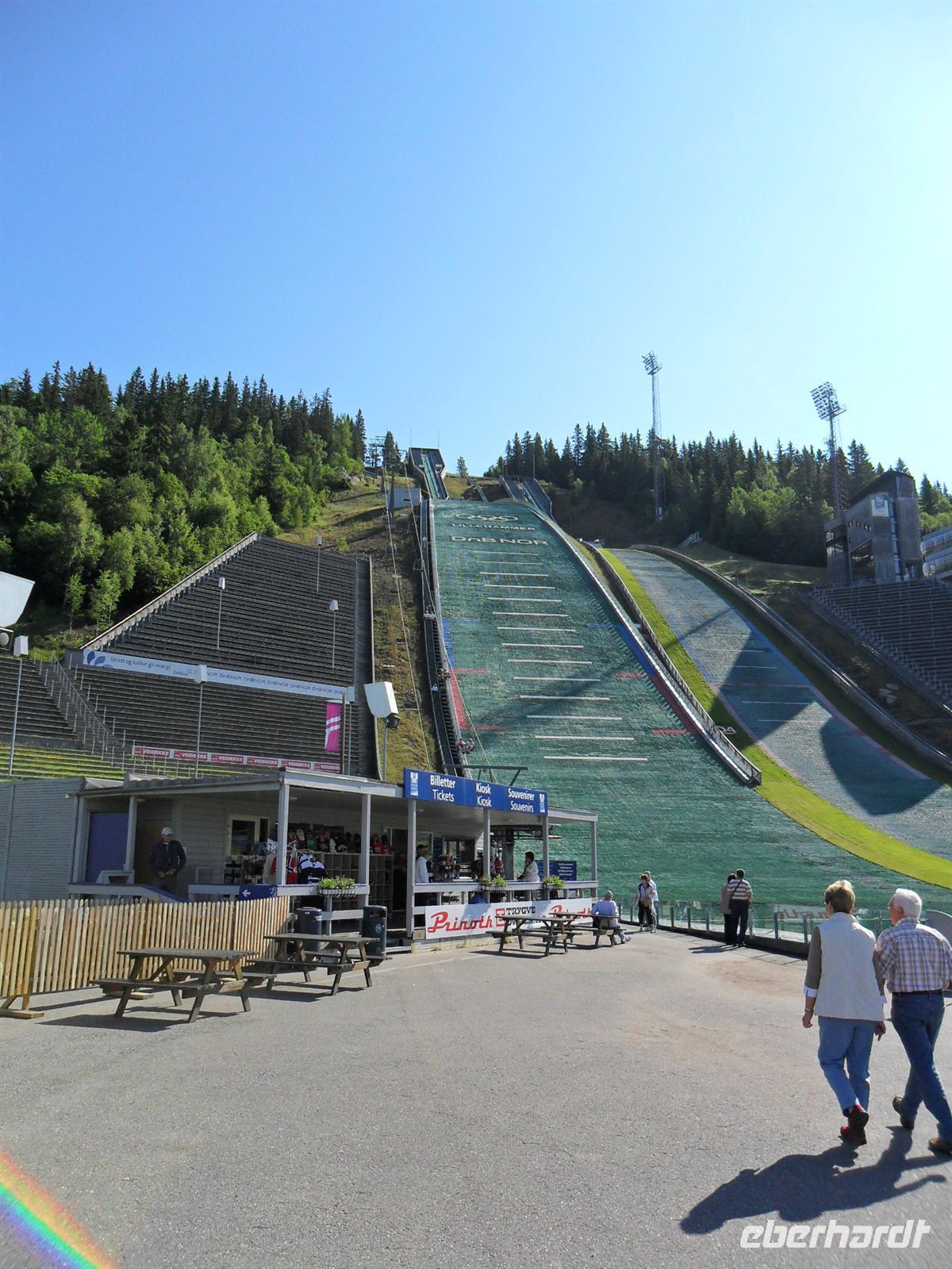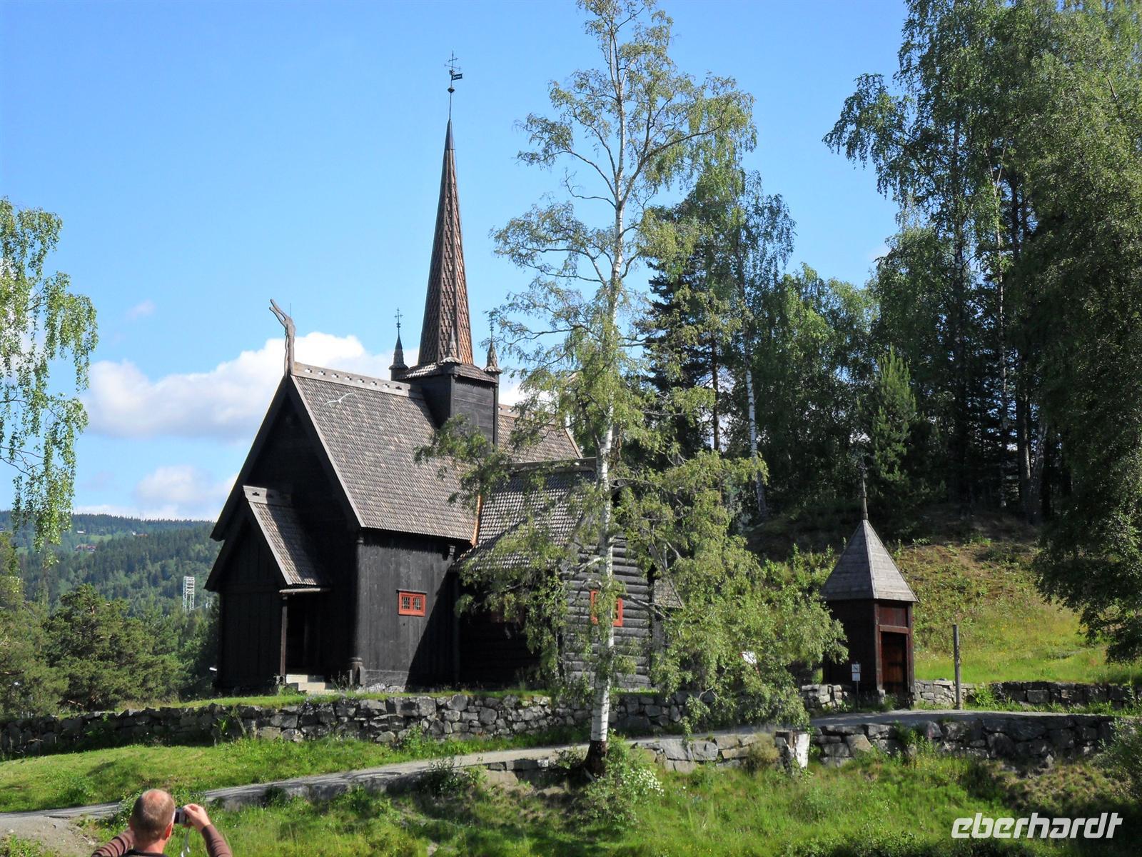 Richtig entspannter war der Anfang heute nach dem Frühstück entlang des Mjösasees nach Lillehammer. Weithin sichtbar sind die beiden für die Olympiade 1994 errichteten Schanzenanlagen. Hier lohnte sich bei herrlichem Wetter ein Fotostop: nicht nur wegen der Schanzen selbst, sondern auch wegen des herrlichen Blickes über den ins Tal eingebetteten Mjösasee. Die nächste Besichtigung galt einem der größten und schönsten Freilichtmuseen Europas. Hier in Maihaugen, das wir bei einer Führung und anschließender Freizeit kennenlernten, wurden mehr als 152 historische und kulturell wertvolle Gebäude aus Südnorwegen zusammengetragen - unter anderem mehrere komplette Bauernhöfe und eine Stabkirche. Diese besondere Art von Holzkirchen gibt es mit zwei Ausnahmen nur in Norwegen. Sie haben ihren Namen von der Bauform, durch die sie ihre Stabilität von vier Masten - norwegisch ?Staver" - erhalten. Da sie immer nur in traditioneller Art mit Hölzpflöcken zusammengehalten wurden und meist noch Schindeln und Planken aufweisen - denn oft sind sie aus alten Schiffen gebaut, gehören Stabkirchen zu den interessanten Bauwerken Norwegens.