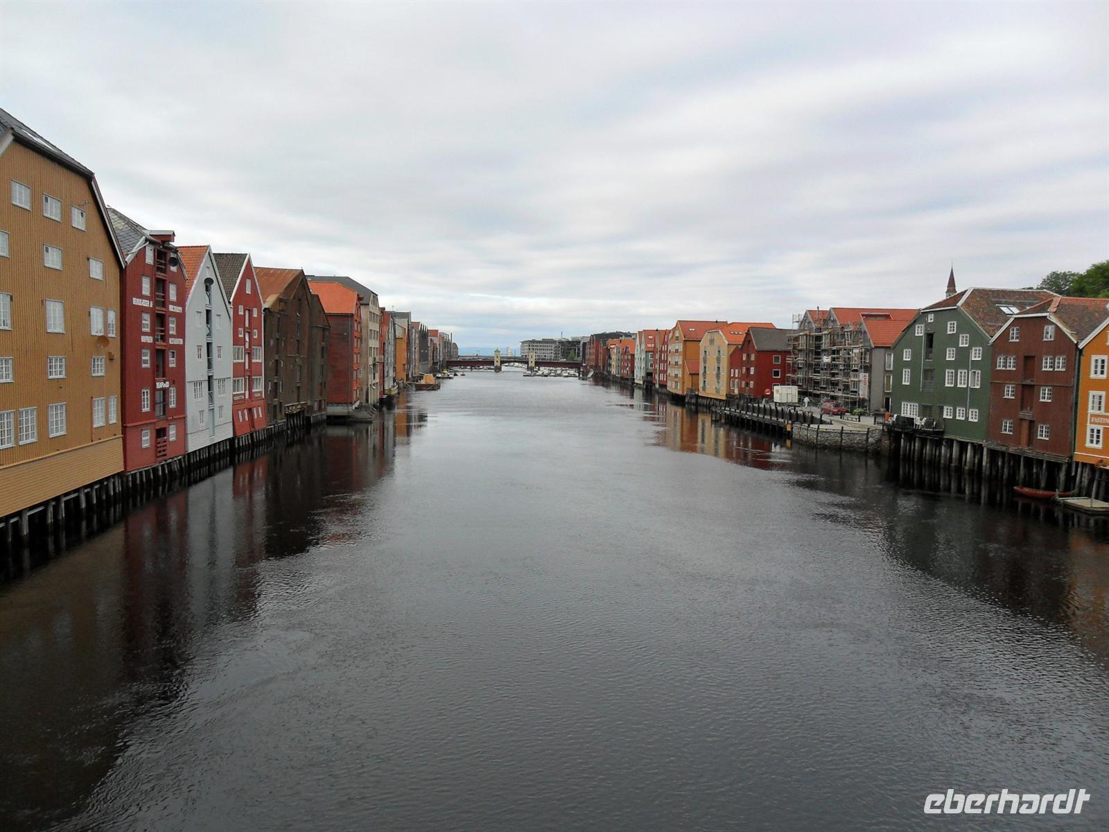 Also kam ich nicht umhin, unsere Gäste vor den Umtrieben der gefährlichen Kobolde zu warnen. Und so erzählte ich von den hinterhältigen, zauberkräftigen und garstigen Trollen, die zwischen fünfzig Zentimetern und zwölf Metern groß sein können und nur sehr selten dem Menschen freundlich gesonnen sind. Ob nun der Troll und seine Frau Tusse oder die Wasserfallgeister oder gar die hübsch aussehenden aber durchtriebenen Huldra - gefährlich sind sie alle! Ich weiß nicht, ob die Gäste sich wirklich ängstigten - aber zumindest etwas Spass hatten wir an den Erklärungen all der Geschichten, Sitten und Gebräuche, die mit den trollen in Norwegen zusammenhängen. Nach einer Mittagspause in Dombås wagten wir uns weiter ins Trollgebiet und überquerten das Dovrefjell, eine wilde und oft unwirtliche Hochfläche. Wir gestatteten uns sogar einen Fotostopp in Dovregubbens Hall, der Unterkunft des gefährlichsten und größten aller Trolle. Er schien aber nicht zu Hause zu sein und so könnten wir auch die historische Brücke neben seinem Hof fotografieren, die früher Bestandteil des historischen Königsweges vom Krönungsort Trondheim nach Bergen, Stavanger und Oslo war. Einen weiteren Fotostopp gönnten wir uns noch an einem Lappencamp, wo neben einer Kota - dem Sommerzelt der Lappen - eine Gamme - seine Winterwohnung - sowie ein einsames Rentier zu bewundern und zu fotografieren waren. Die folgende Toilettenpause bei Oppdalsporten bescherte uns die Möglichkeit, leckere norwegische Waffeln mit Erdbeermarmelade und saurer Sahne zu verkosten, bevor wir unsere Fahrt gen Trondheim bei schlechtem Wetter fortsetzten. Bei der Ankunft in der alten Krönungsstadt hatte der Regen aber aufgehört: so dass wir noch eine kleine Brückenbesichtigung der historischen Altstadtbro machen konnten, mit Blick auf die UNESCO-Welterbespeicher am Nidelven. Unweit von hier lagen das Stadtzentrum, aber auch unser Hotel Scandic Solsiden, in das wir eincheckten und wo wir nach dem Abendessen übernachteten.