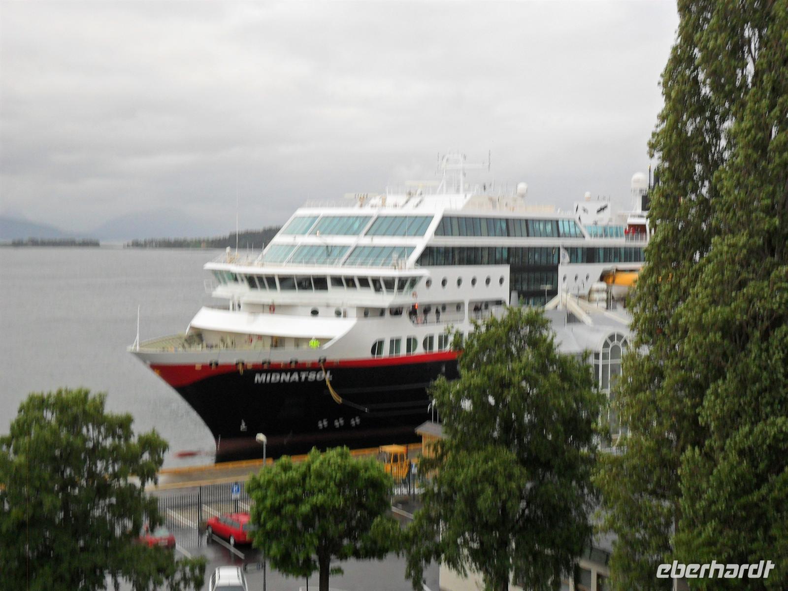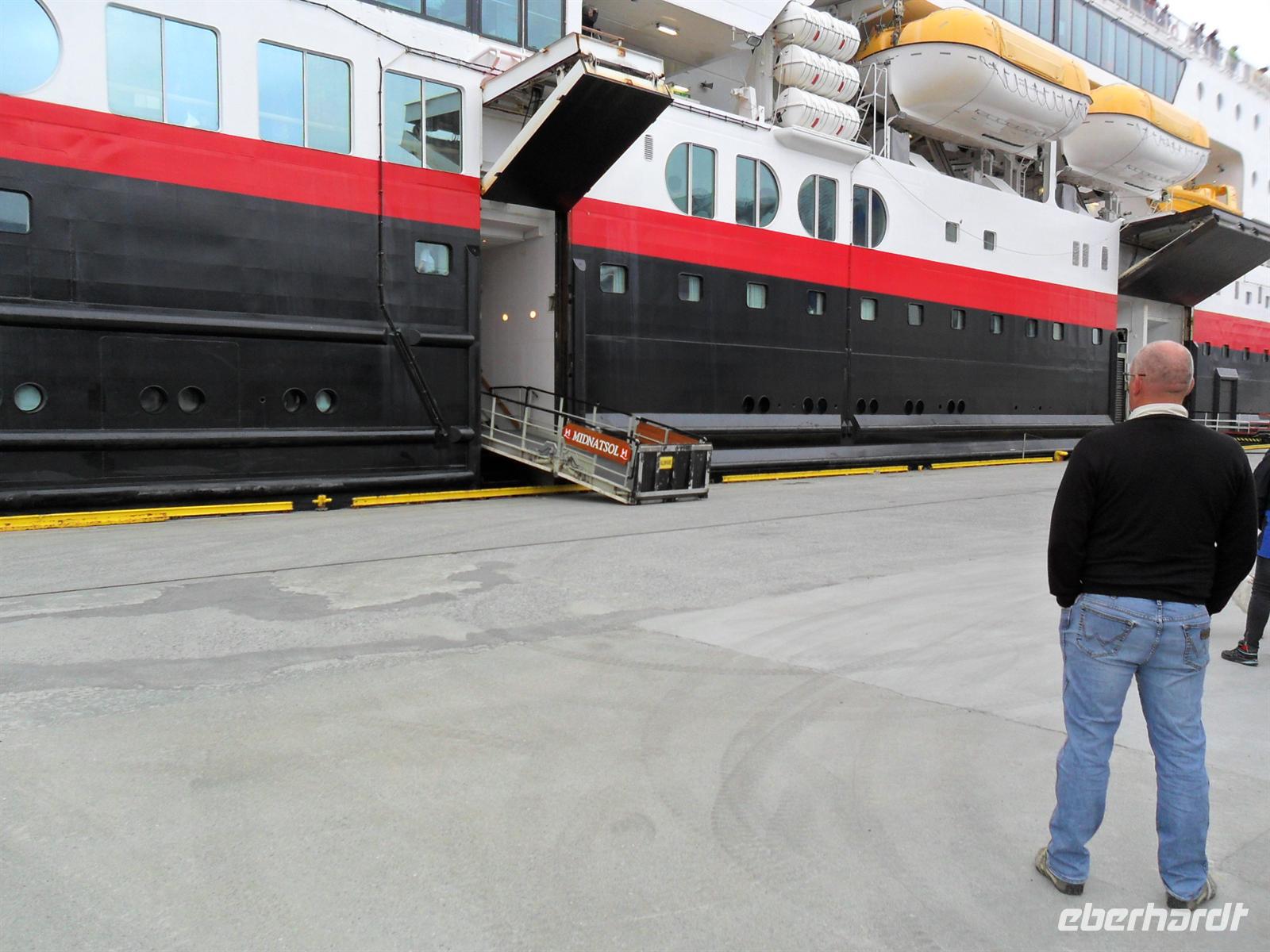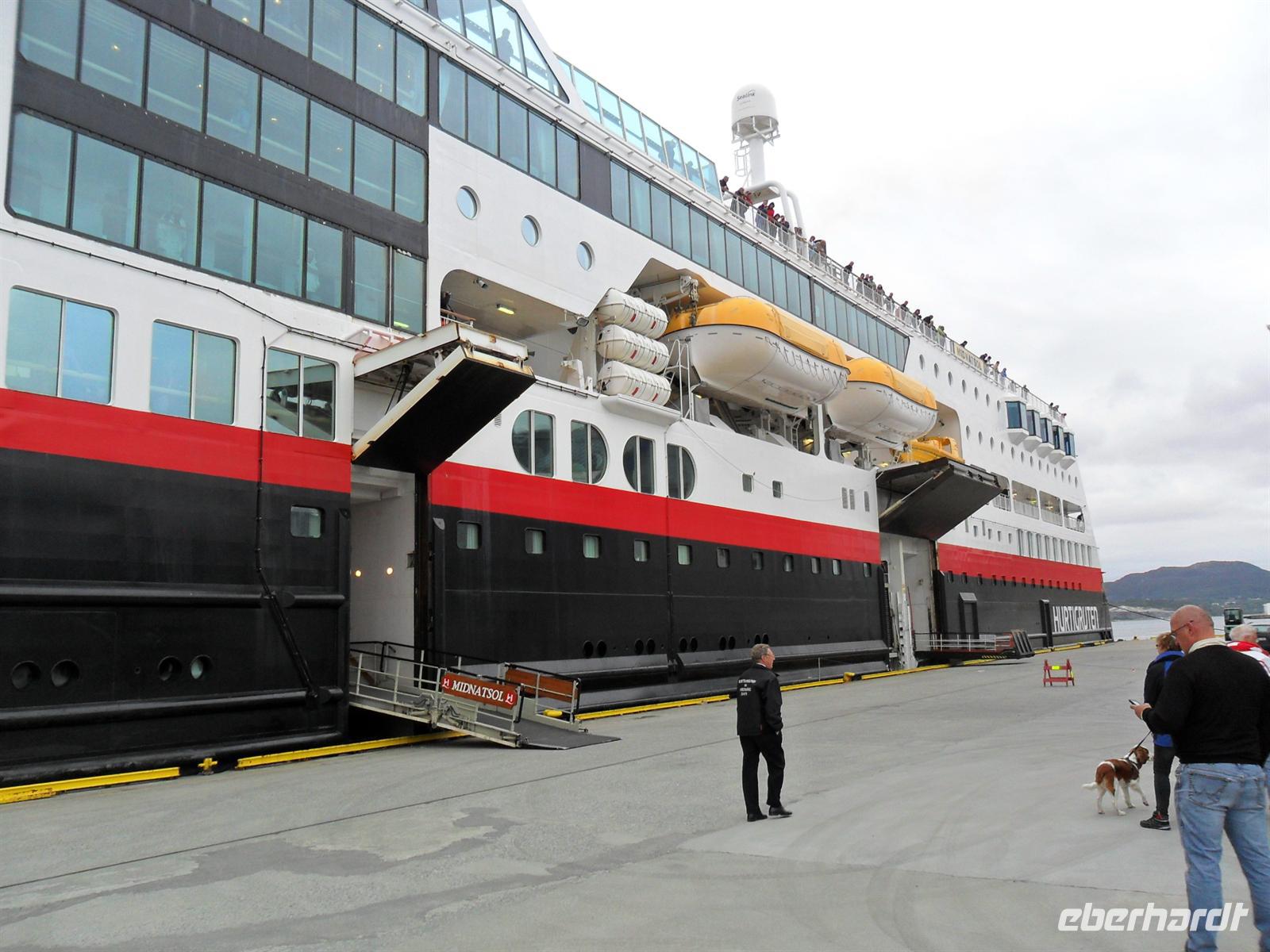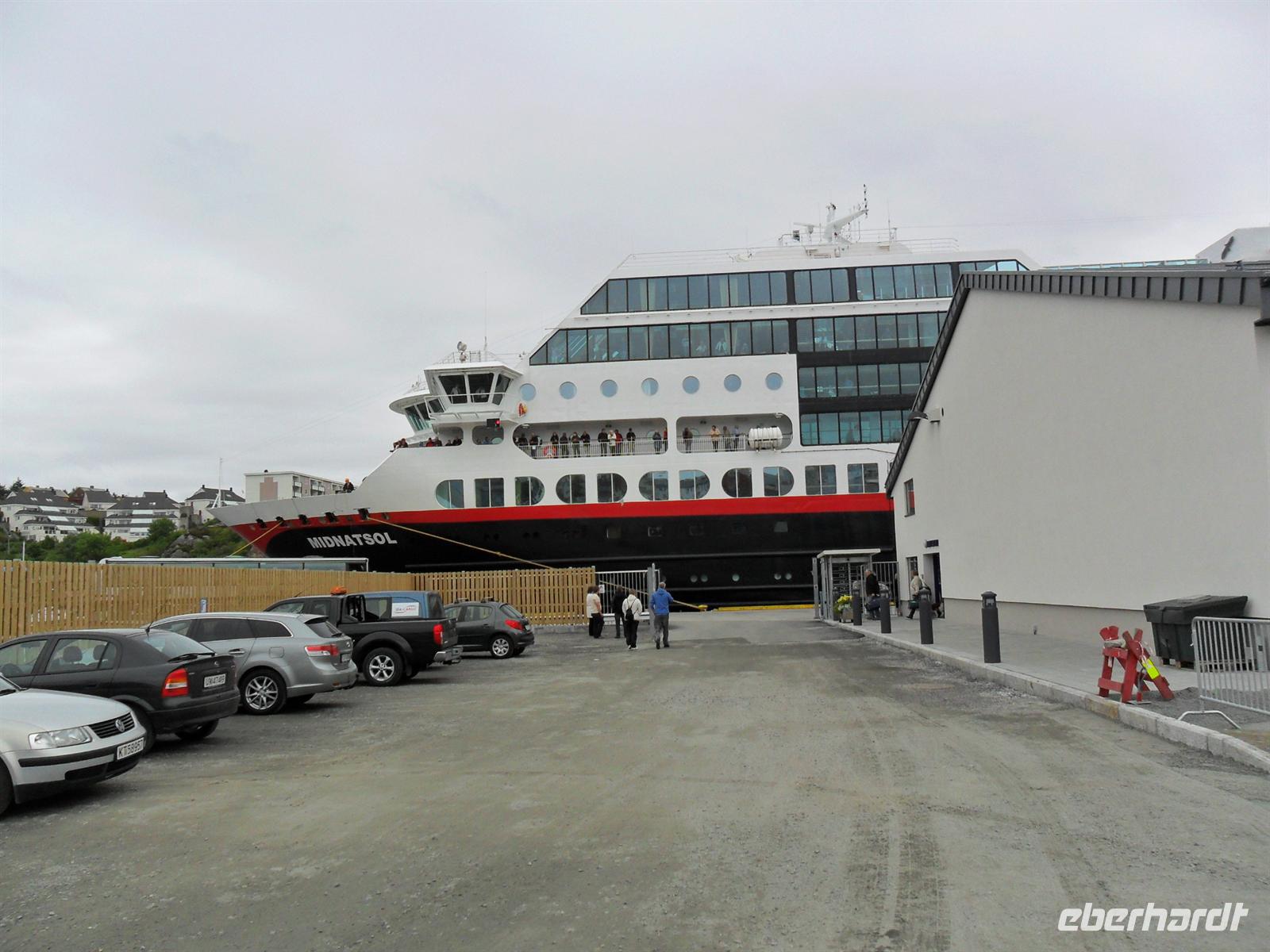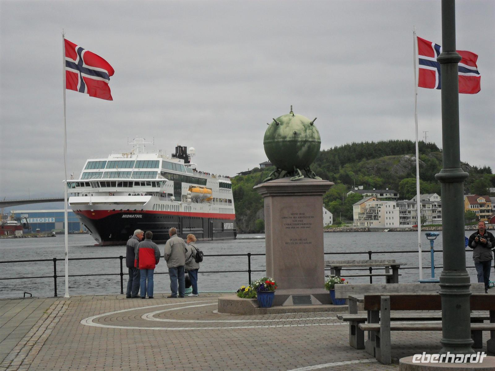 Dann mussten wir uns beeilen, denn um 10.00 Uhr ging das Schiff der Hurtigruten, auf dem wir zur Tagesfahrt angemeldet waren. ?Hurtigbåten" ist seit 1893 in Norwegen ein Symbol für Zuverlässigkeit und Regelmäßigkeit. Damals hatten die ersten Schiffe einen regelmäßigen Post- und Passagierdienst zwischen Nord- und Südnorwegen aufgenommen. Und das es damals keine durchgehende Straße im Landesinneren gab, nennt man die Hurtigrute bis heute ?Reichsstraße Nr. 1". Die Schiffe heute sind sehr komfortabel, bequem und luxuriös. Man kann mit ihnen täglich sowohl in nördlicher als auch in südlicher Richtung fahren und dabei auf der kompletten Strecke 34 Häfen anlaufen. Wir waren auf die Strecke Trondheim zum südlich liegenden Kristiansund gebucht. Für sechseinhalb Stunden konnten die Gäste sich als Deckspassagiere an Bord - auf Deck oder in einer der Lounges - entspannen und dabei die grandiose Küstenszenerie Norwegens an sich vorbeiziehen lassen.