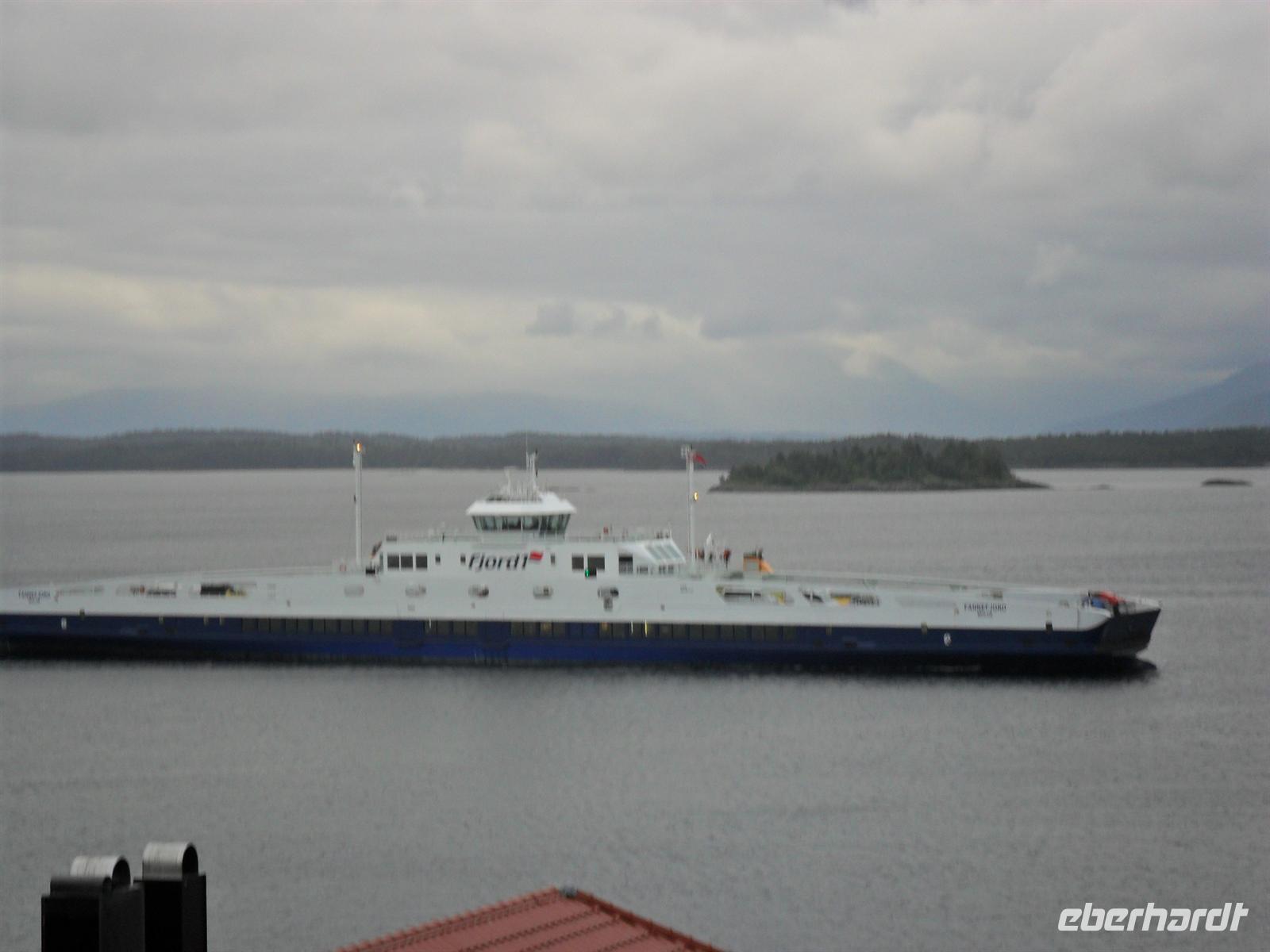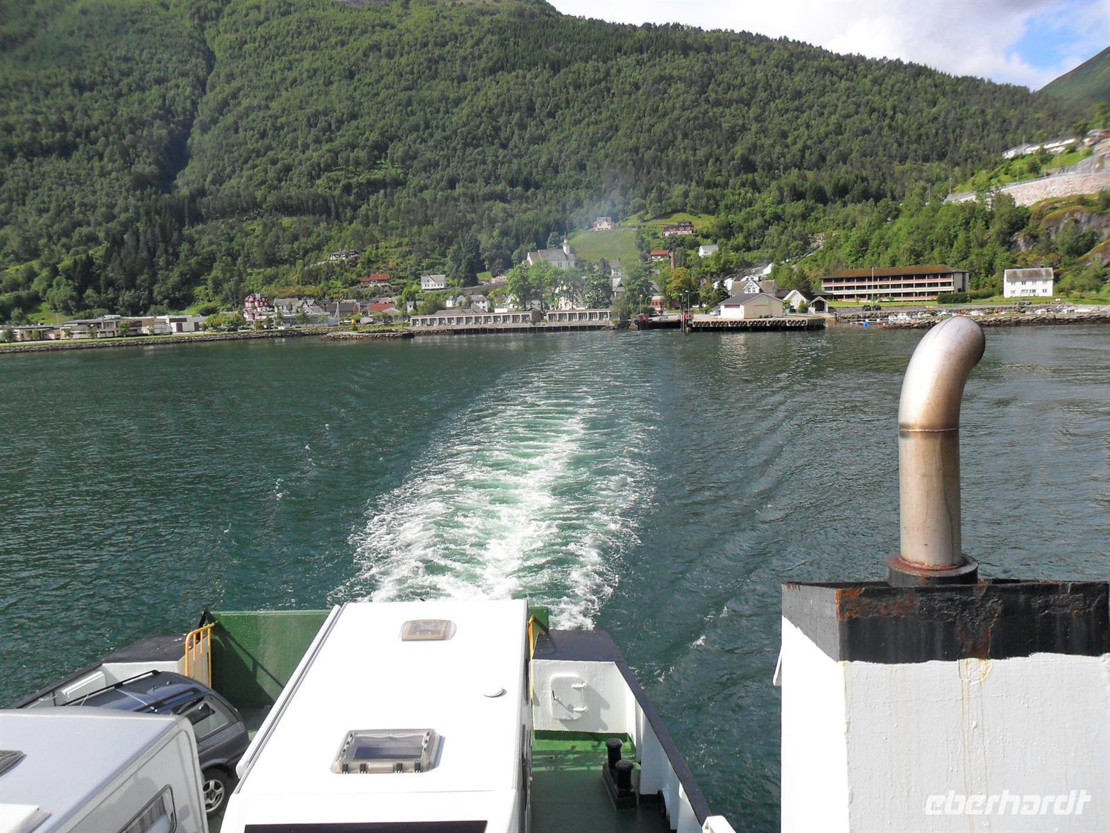 Die Weiterfahrt von hier führt an einem interessanten Berghotel in Turtagro und einsamen Bauernhöfen vorbei wieder ins Tal, bis man Kaupanger erreicht, einen Ort, der auch eine interessante Stabkirche aufweist. Für die bleibt aber keine Zeit, denn schon muß man sich an der Fähre anstellen. Gegen Mittag begann mit dieser Fähre unsere längste Fjordfahrt: fast zweieinhalb Stunden dauert es, bis der kleine Ort Gudvangen mitten in den Bergen erreicht ist. Er liegt am Ende des Naeroyfjords, des engsten aller Fjorde Norwegens. Imposant und von Bord des Fährschiffes gut zu genießen ist es schon, wie die Felskanten der steile Berge immer näher kommen und man gewahr wird, dass es hier Stellen gibt, an die das ganze Jahr die Sonne nicht hinkommt.