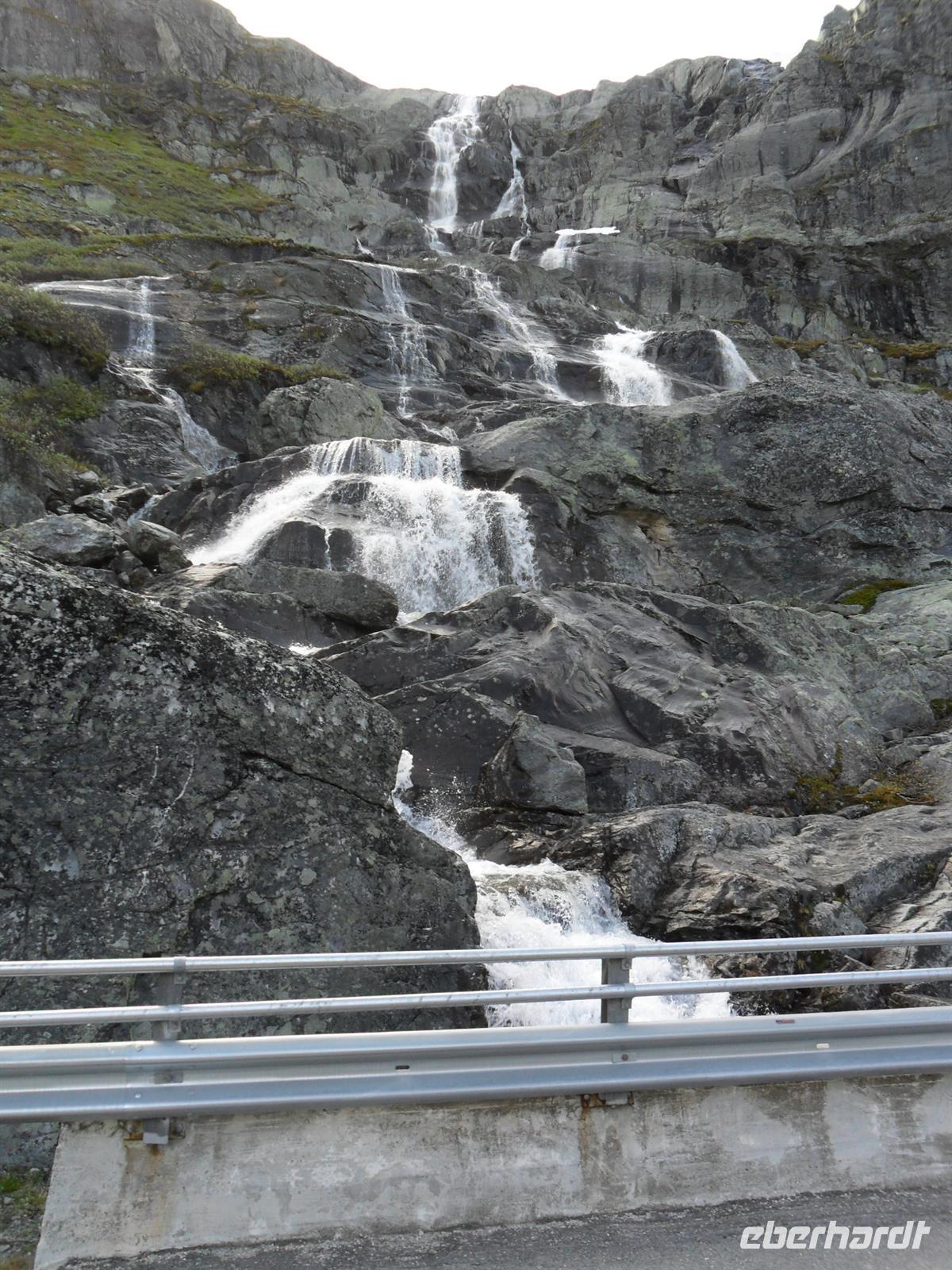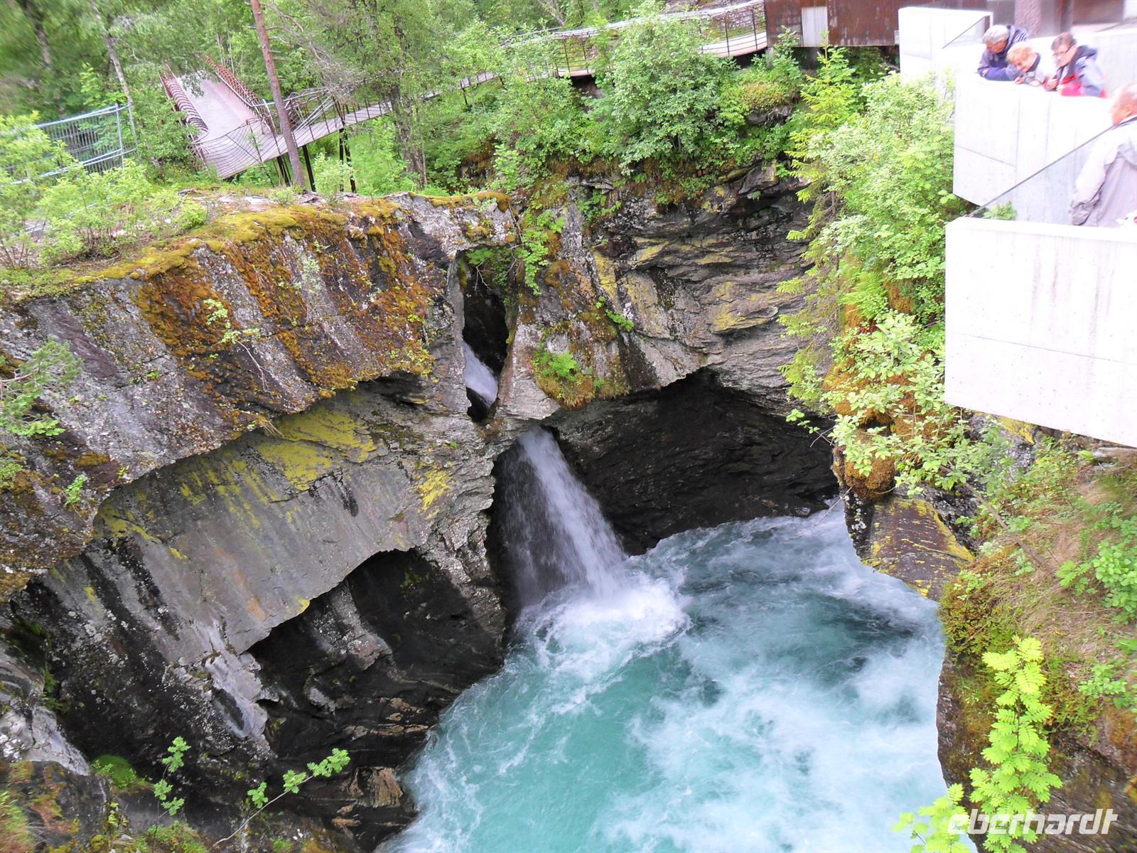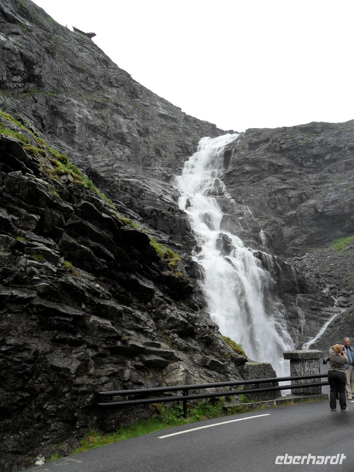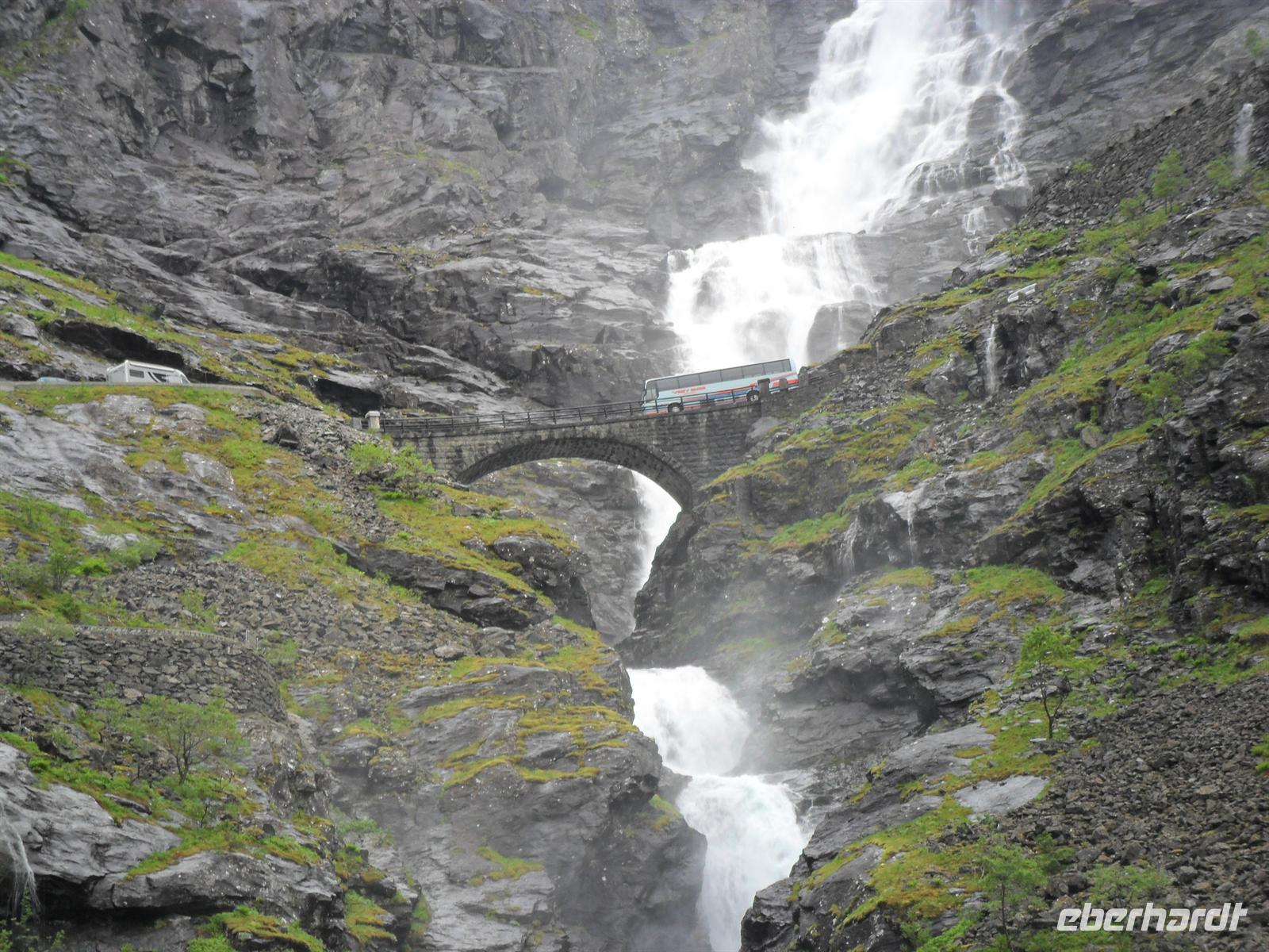 Die Mittagspause legten wir an einem der interessantes und wasserreichsten Wasserfälle Norwegens ein, am Steindalsfoss. Das Besondere an ihm ist nicht etwa seine Ergiebigkeit oder seine Höhe von ca. 50 m. Bei diesem Wasserfall führt ein Weg hinter ihn, so dass Besucher zwischen Felswand und Wasser gelangen können.