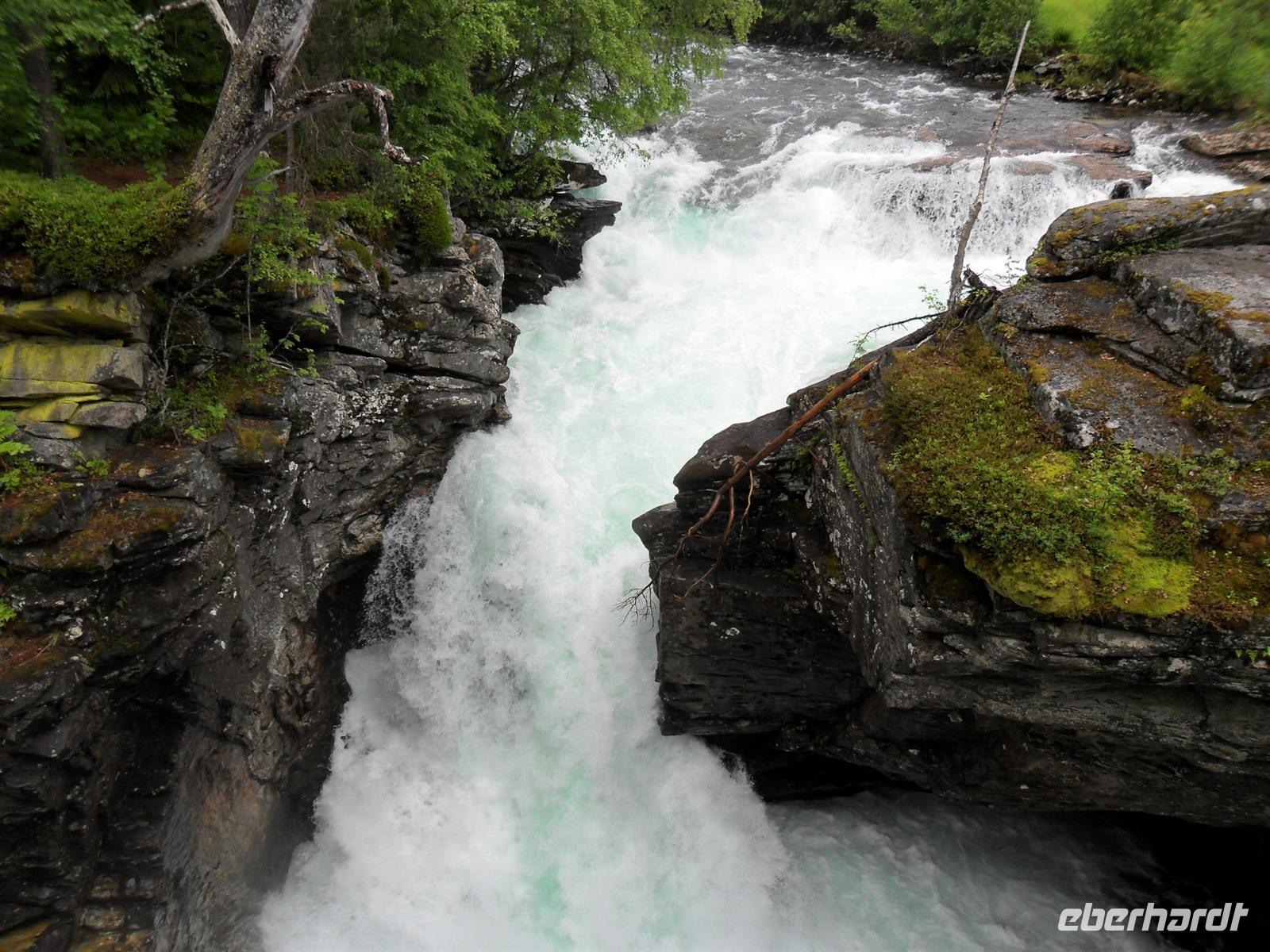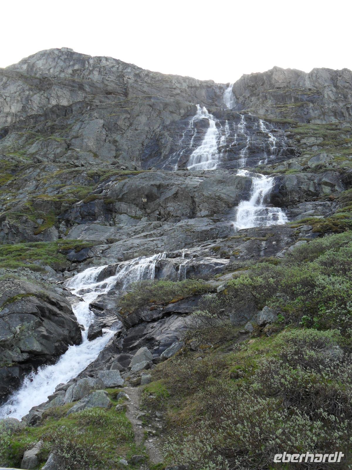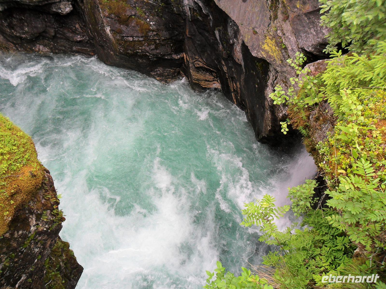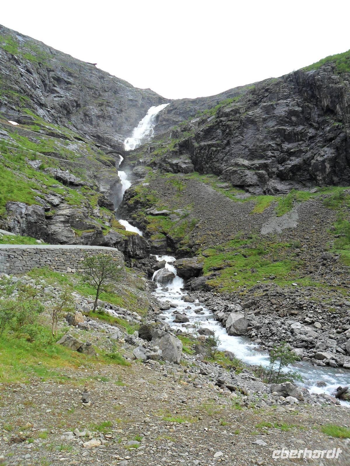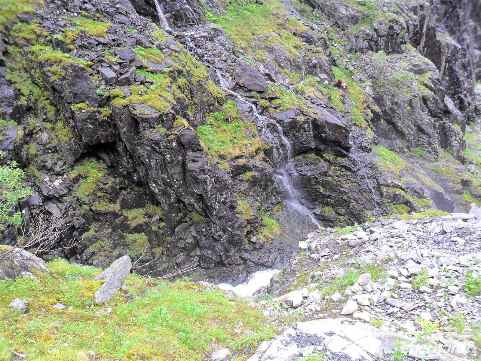 Die Mittagspause legten wir an einem der interessantes und wasserreichsten Wasserfälle Norwegens ein, am Steindalsfoss. Das Besondere an ihm ist nicht etwa seine Ergiebigkeit oder seine Höhe von ca. 50 m. Bei diesem Wasserfall führt ein Weg hinter ihn, so dass Besucher zwischen Felswand und Wasser gelangen können.