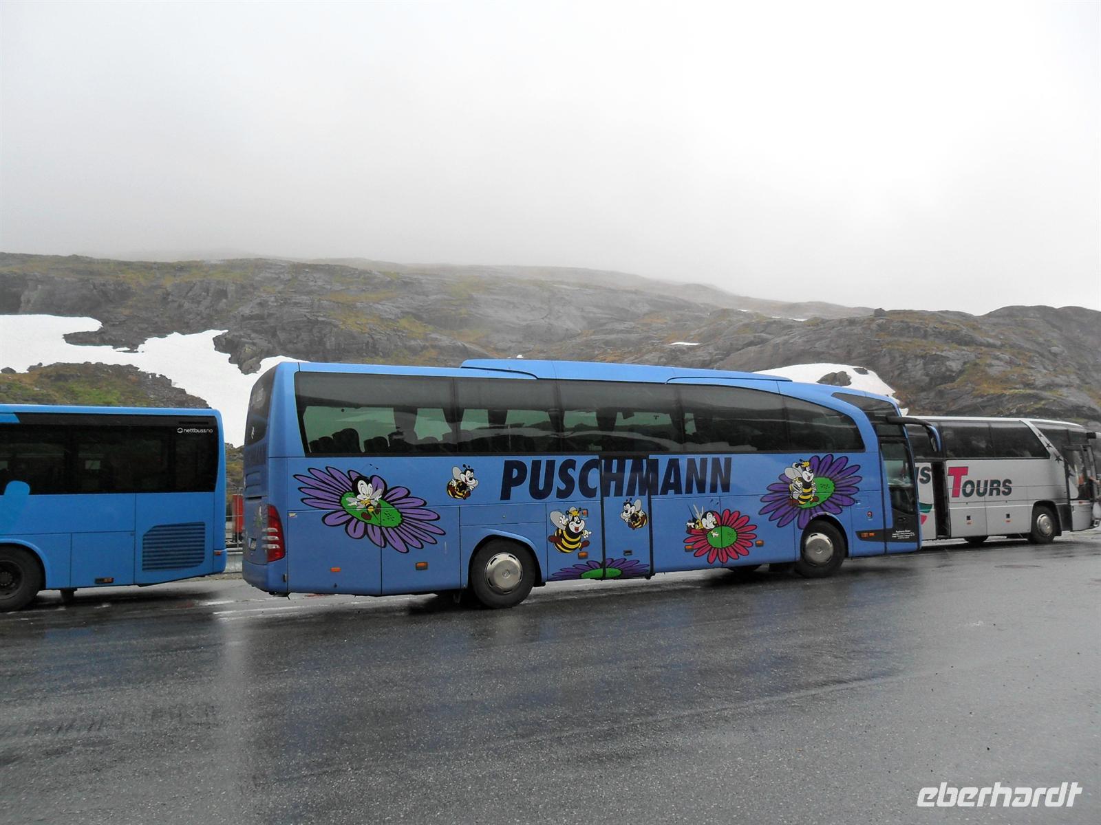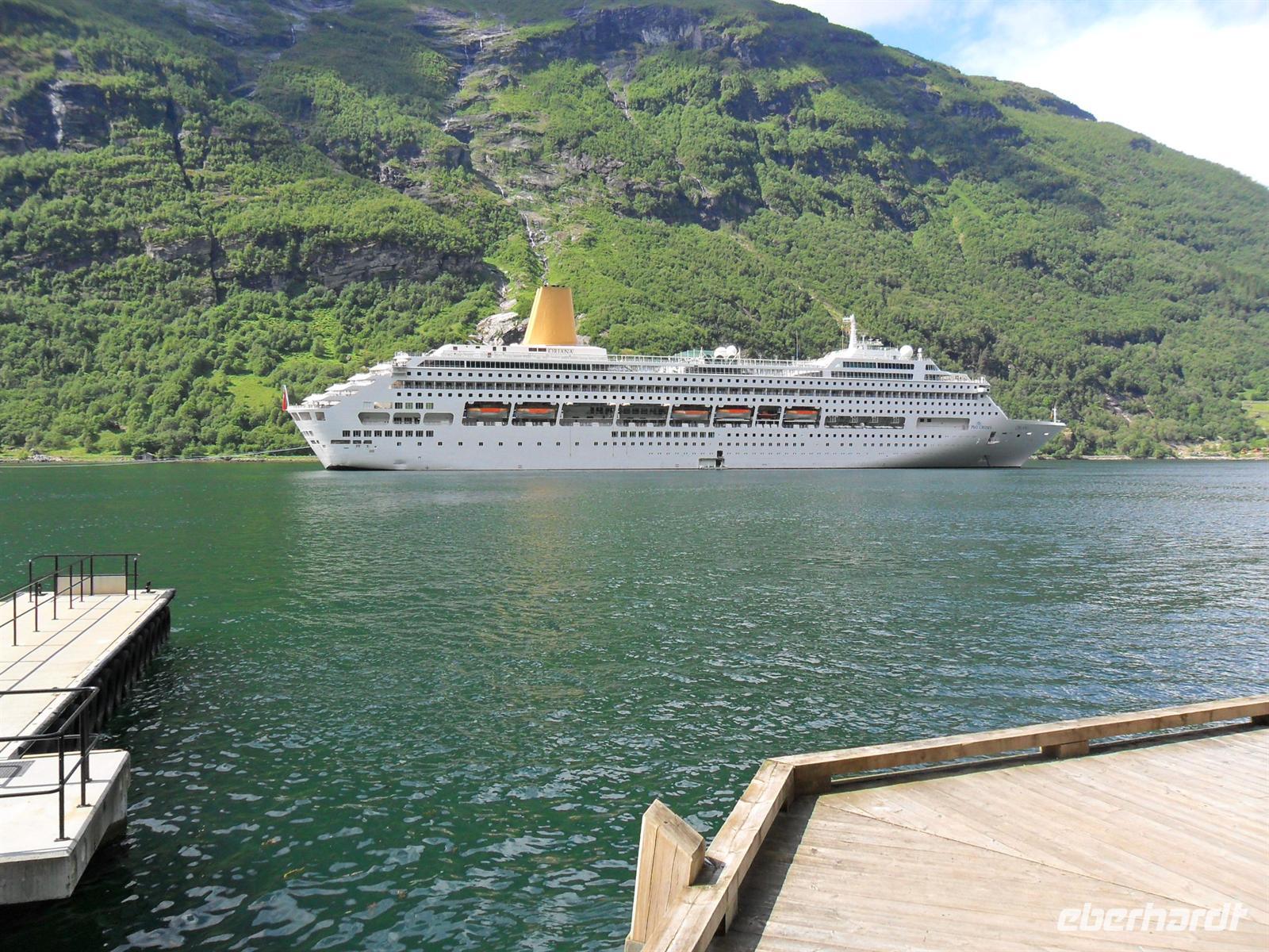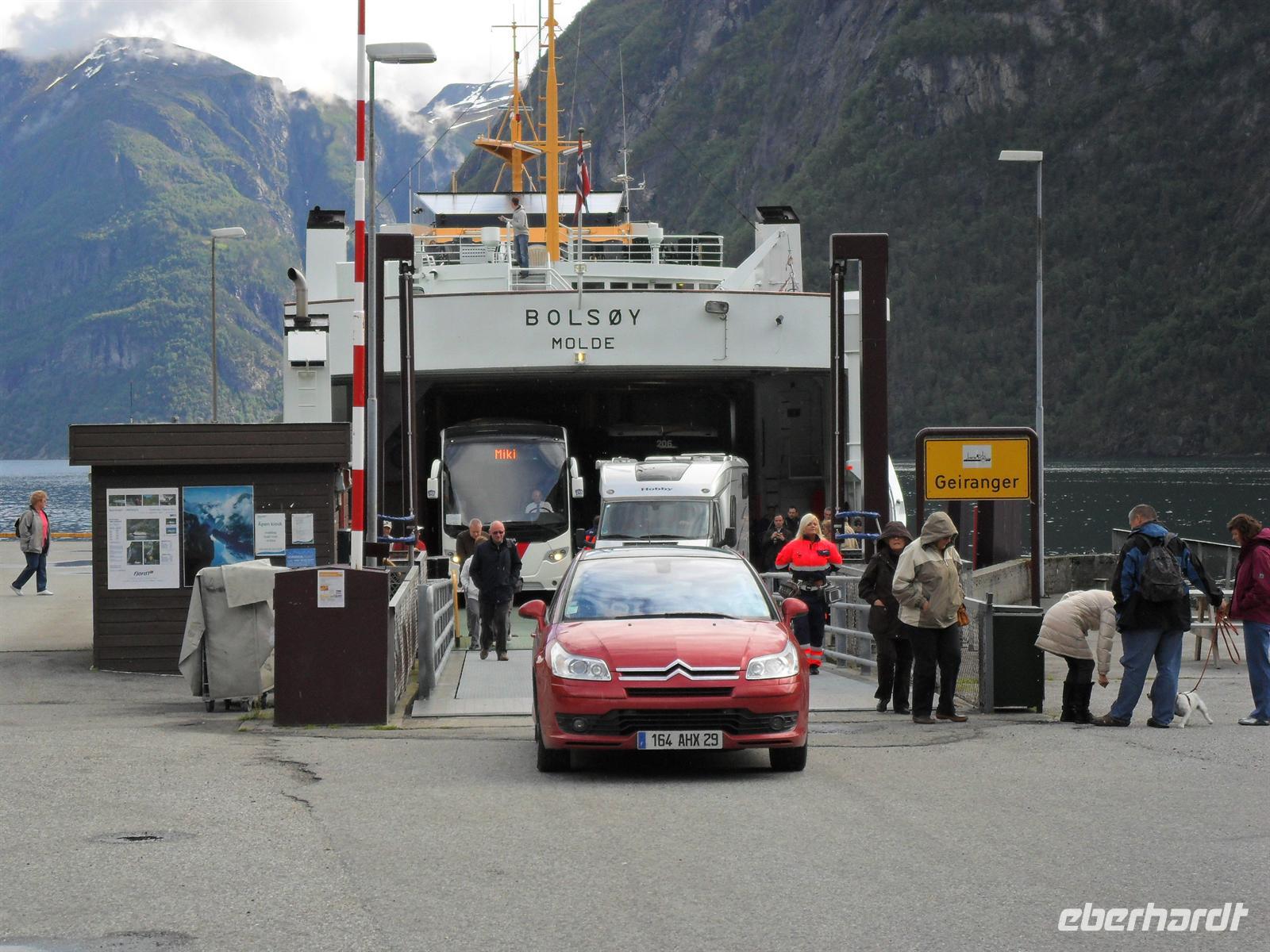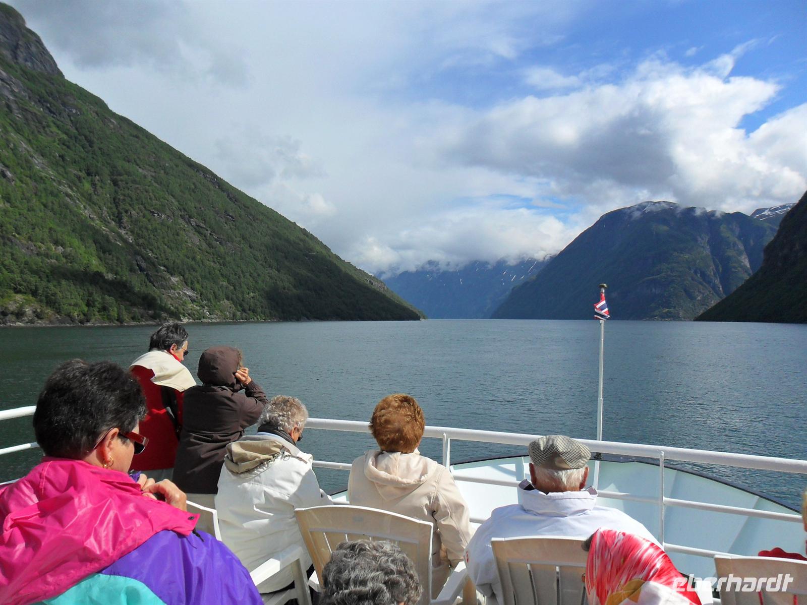 Auch dieser Tag ist meiner Fjord- und Berglandschaft stets ein weiterer Höhepunkt gewesen. Auch heute war das Wetter wieder sehr gut, aber die Fahrt begann recht früh. Wir mussten überall pünktlich sein, denn es war wichtig, die 11-Uhr-Fähre im Ort Hellesylt zu erreichen. Deren Fahrt ist recht spektakulär, denn sie Fahrt - vom Synnylfsfjord kommend, die gesamte Länge des Geiranger Fjordes ab. Wie immer haben die Gäste diese Geiranger-Fahrt im Fjord der unter UNESCO-Weltnaturerbeschutz steht, sehr genossen. Man fährt an den steil aufstrebenden Berghängen mit vielen imposanten Wasserfällen vorbei, zu denen auch der berühmte der ?Sieben Schwestern" gehört.