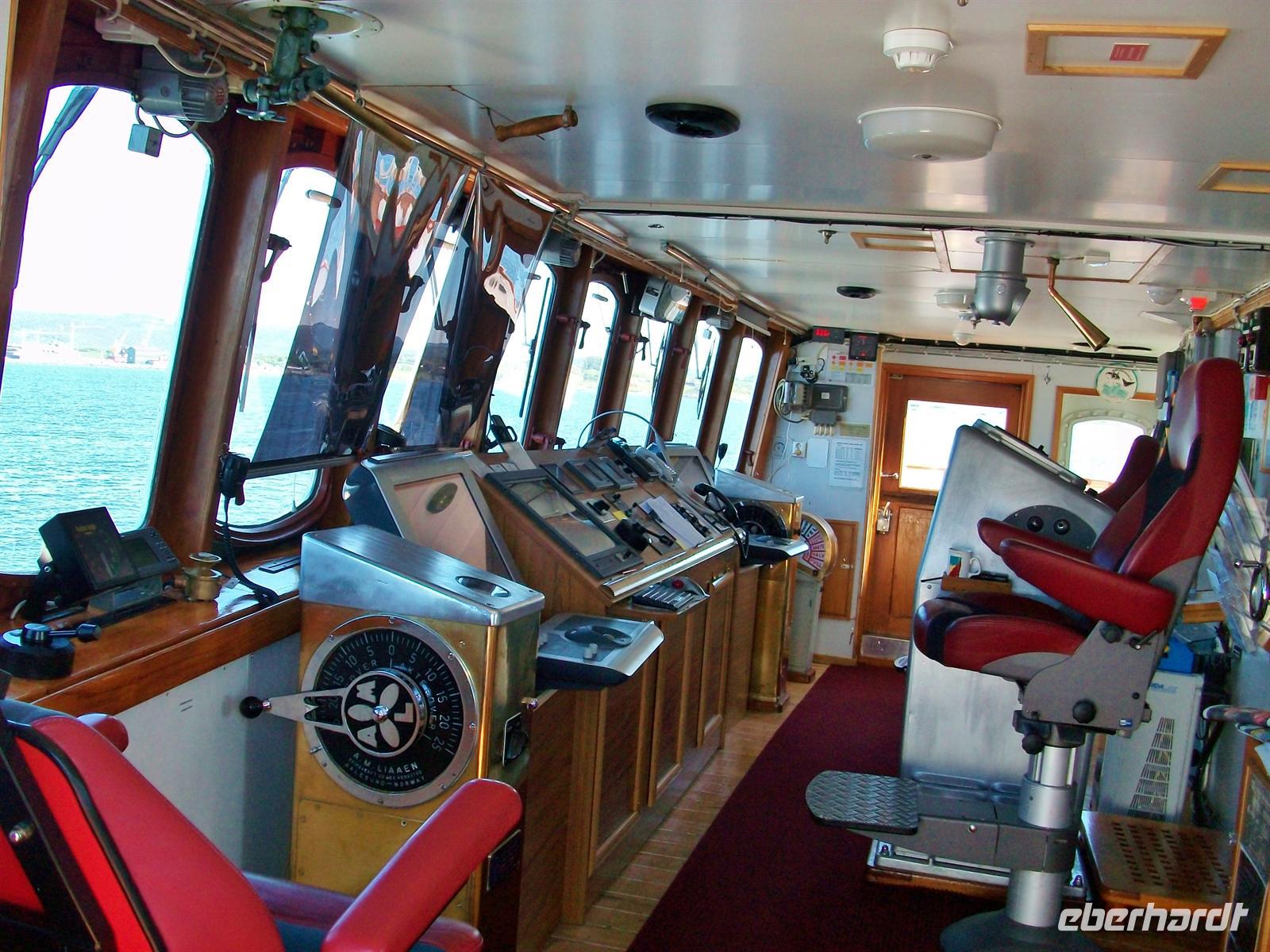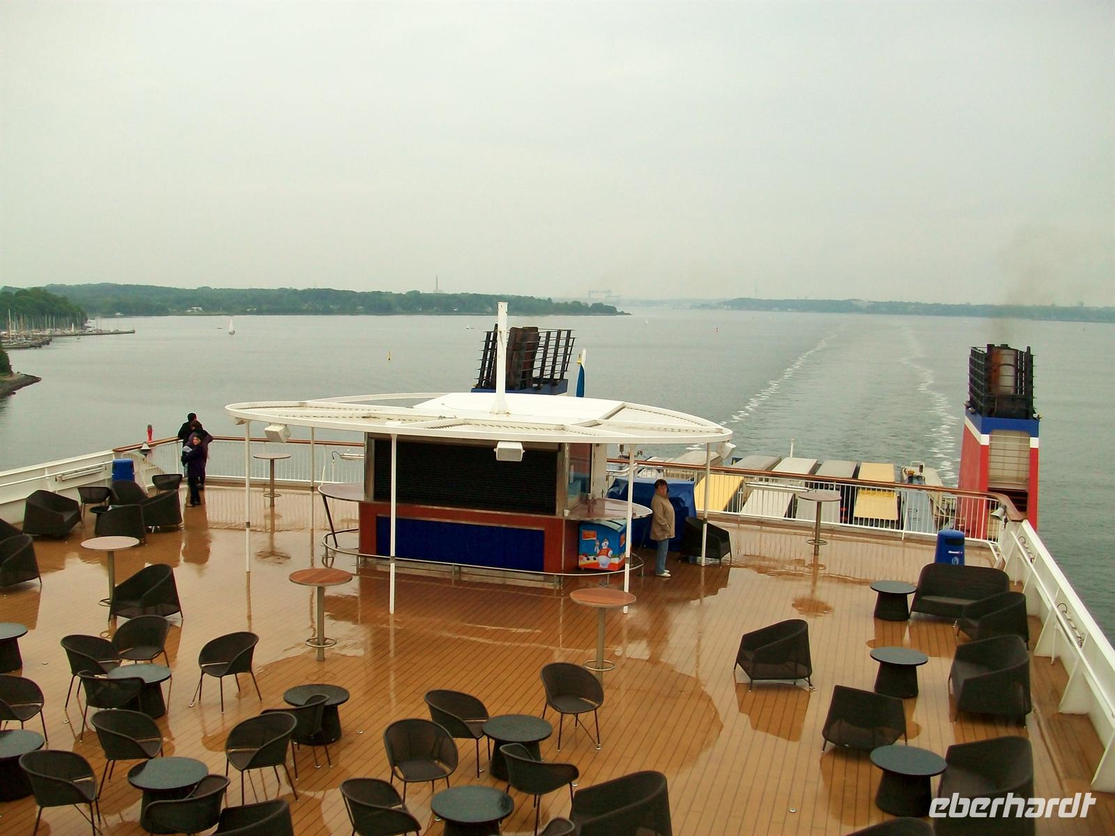 Etwas später gehe ich noch hinauf auf das Oberdeck; ein frischer Wind bläst mir entgegen. Wir verlassen langsam die Kieler Förde und fahren hinaus in das offene Meer der Ostsee.