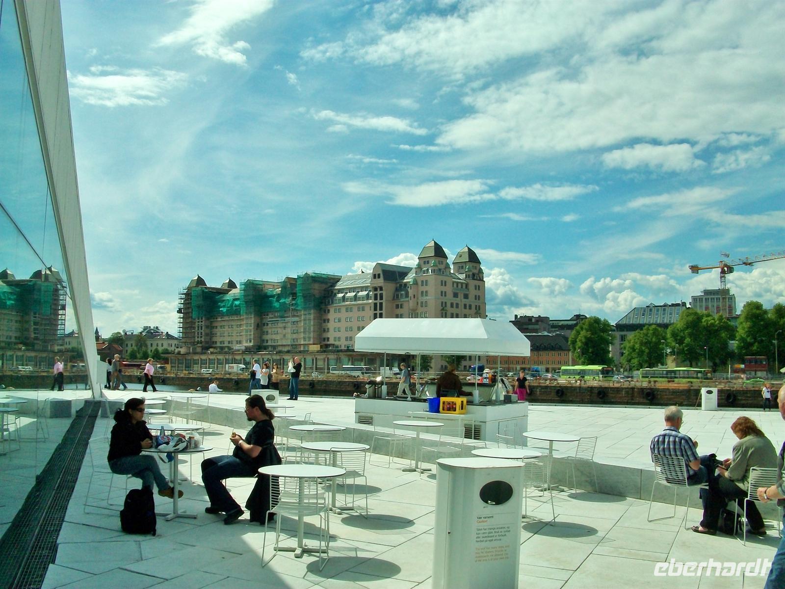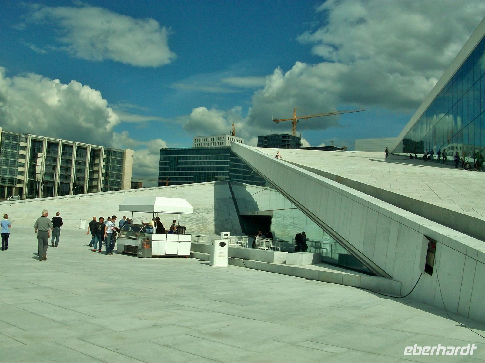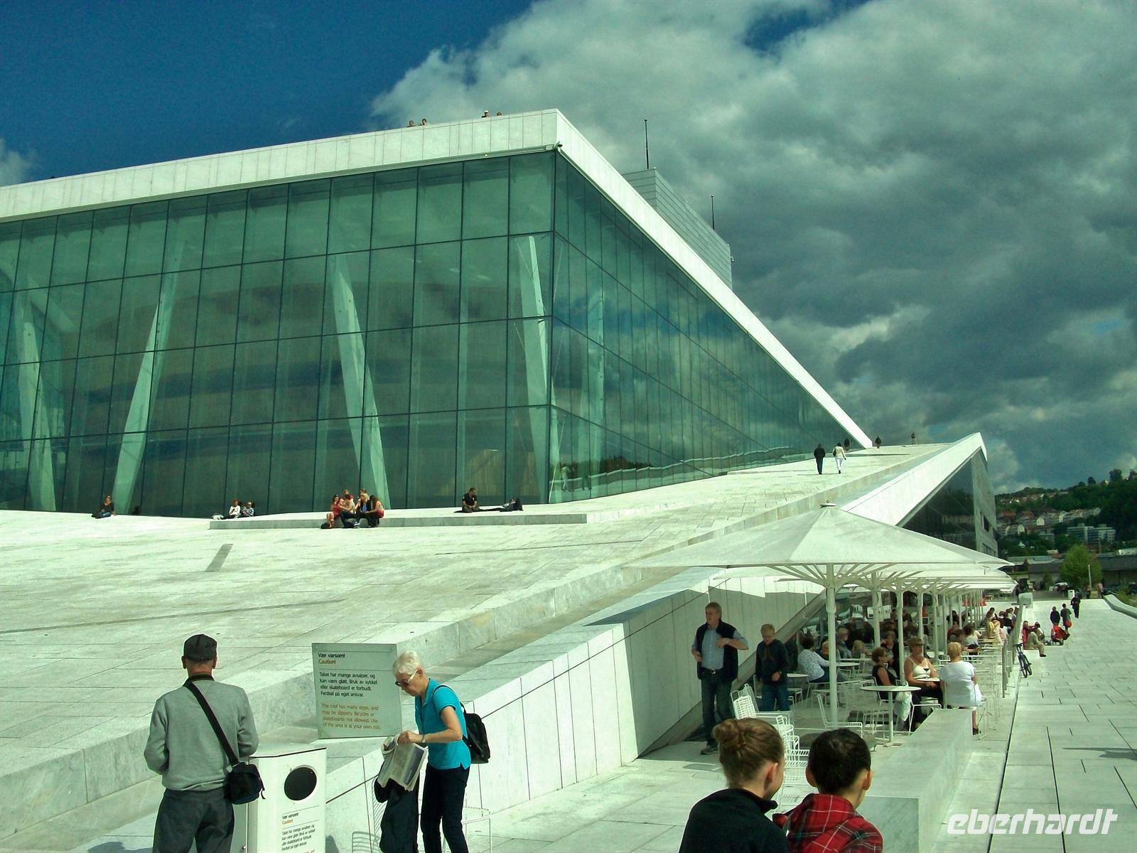 Von hier sind es dann noch gut 100 Kilometer bis nach Oslo. Gesäumt von den zahlreichen Granitfelsen und durch eine liebliche Landschaft kommen wir gegen drei im Gedränge der Norwegischen Hauptstadt an. Nur zähflüssig geht es voran, doch bald ist das blendend helle Gebäude der Neuen Oper auszumachen. Sehr futuristisch ist diese Architektur, die Aufgänge die außen hinaufführen sind Skipisten nachgeahmt, kein Wunder, sind wir doch in einem Land in dem der Wintersport eine große Rolle spielt.