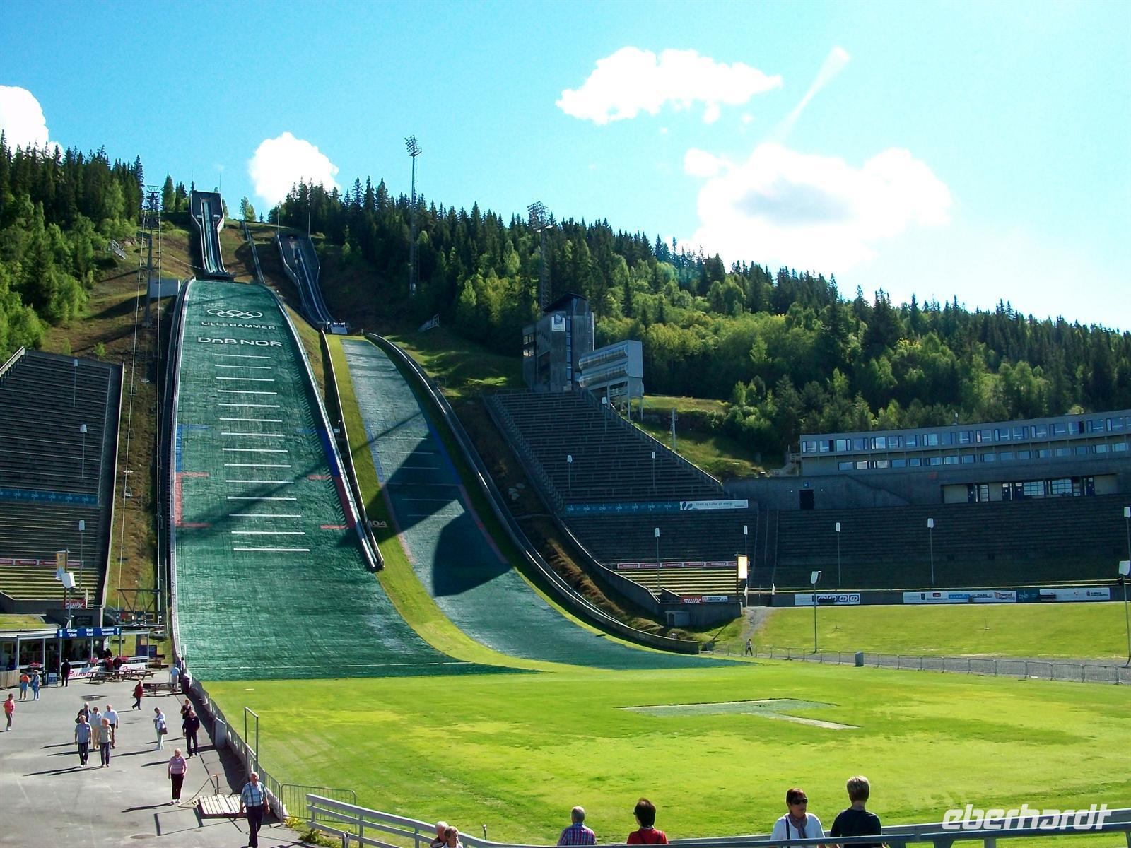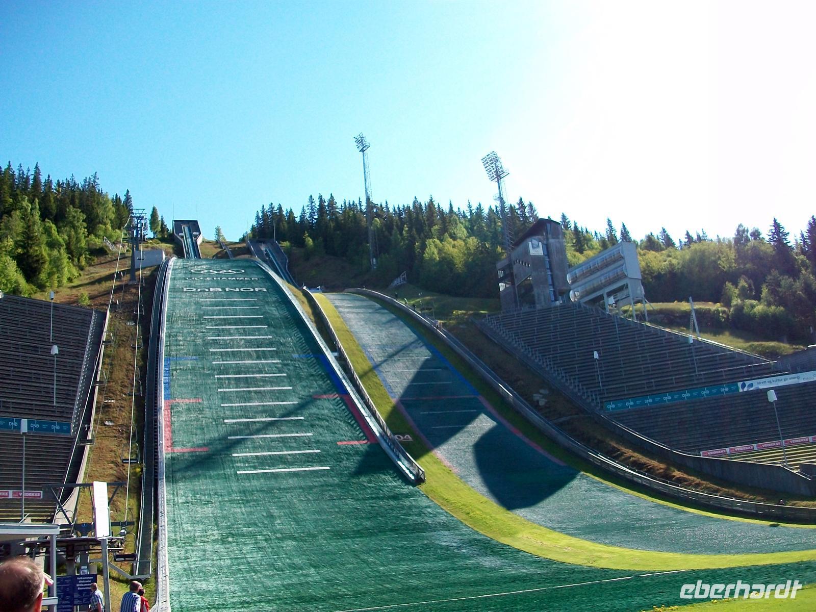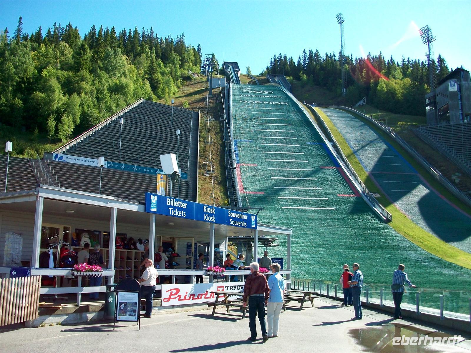 Zeitig geht sie in diesen Breiten wieder auf und als wir gegen 8.15 Uhr in Richtung Lillehammer unterwegs sind, lacht sie uns von einem strahlend blauen Himmel an. Romantisch ist die Fahrt entlang des Mjøsasees in dessen klaren Fluten sich Sonne und Wolken widerspiegeln. Bald kommen die Olympiaschanzen in unser Blickfeld, es ist das erste Ziel des heutigen Tages. Langsam steigen wir mit unserem Bus empor und unterhalb des Schanzentisches stehen wir nun im Stadion. Es ist immer faszinierend die Orte die man nur vom Fernsehen kennt original zu sehen. Ein glücklicher Umstand ist es, einige norwegische Skispringer beim „Trockentraining“ zu sehen; Sportfreunde erkennen sofort den Norweger Tom Hilde der sich eben mit Lockerungsübungen warm macht.