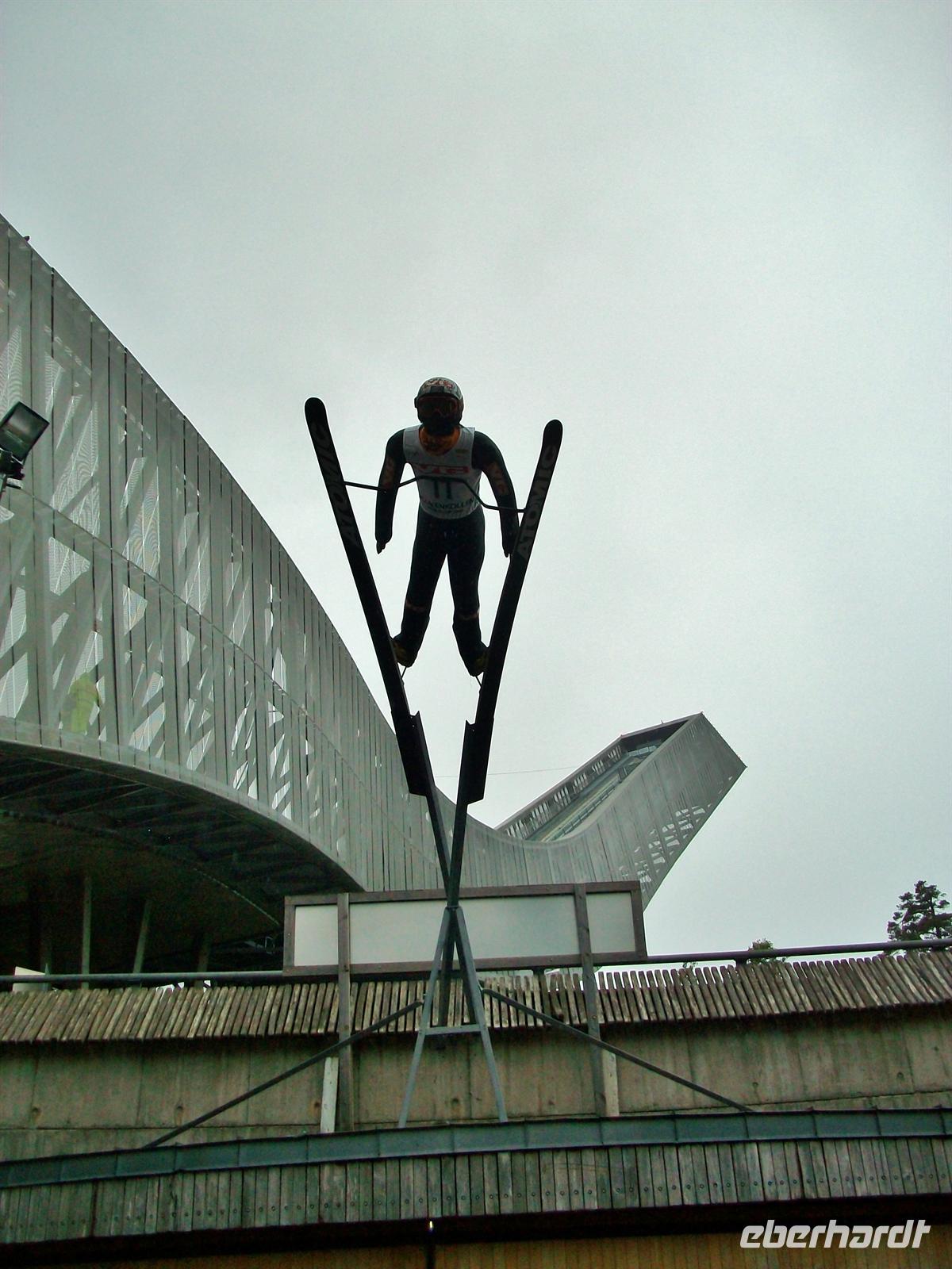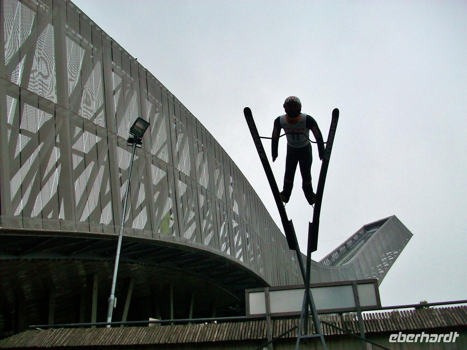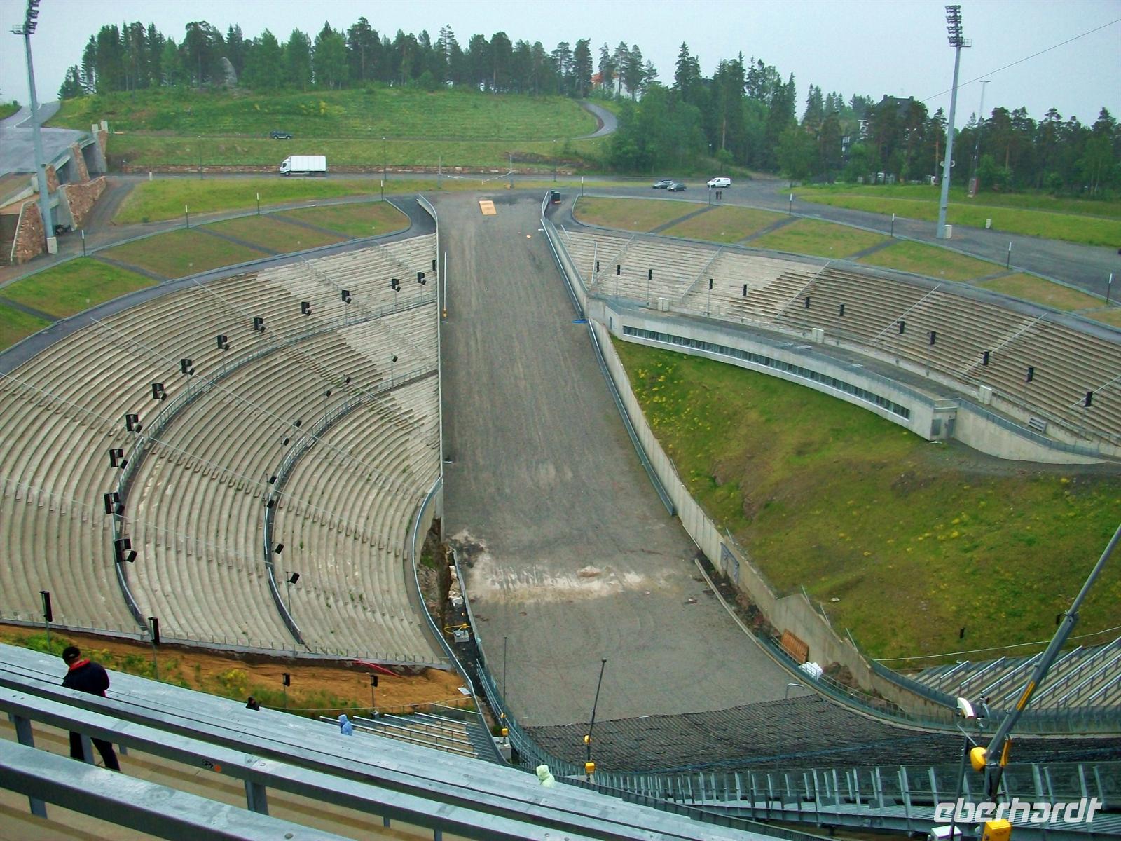 Zeitig geht sie in diesen Breiten wieder auf und als wir gegen 8.15 Uhr in Richtung Lillehammer unterwegs sind, lacht sie uns von einem strahlend blauen Himmel an. Romantisch ist die Fahrt entlang des Mjøsasees in dessen klaren Fluten sich Sonne und Wolken widerspiegeln. Bald kommen die Olympiaschanzen in unser Blickfeld, es ist das erste Ziel des heutigen Tages. Langsam steigen wir mit unserem Bus empor und unterhalb des Schanzentisches stehen wir nun im Stadion. Es ist immer faszinierend die Orte die man nur vom Fernsehen kennt original zu sehen. Ein glücklicher Umstand ist es, einige norwegische Skispringer beim „Trockentraining“ zu sehen; Sportfreunde erkennen sofort den Norweger Tom Hilde der sich eben mit Lockerungsübungen warm macht.