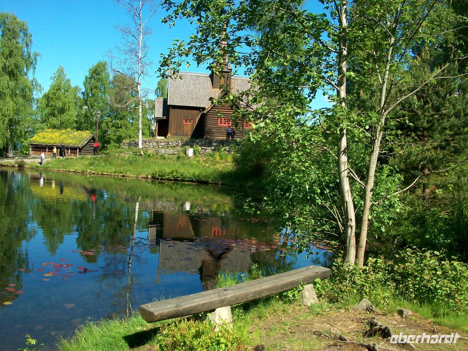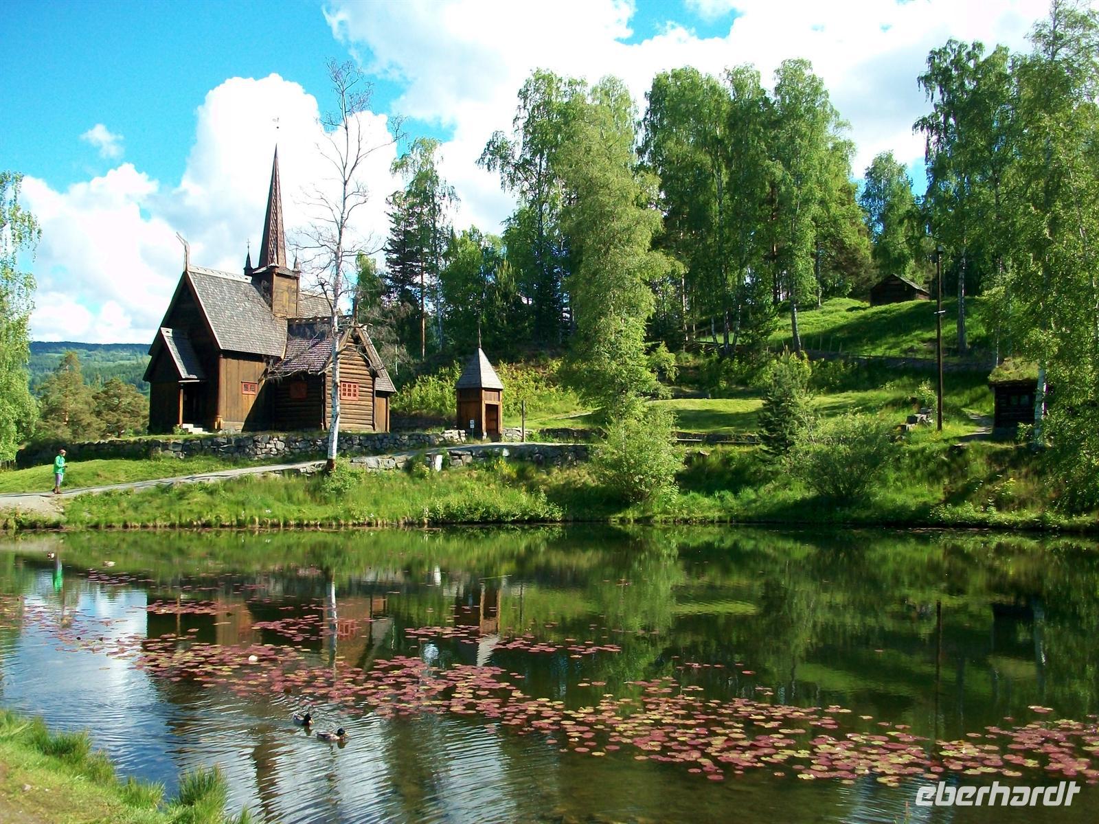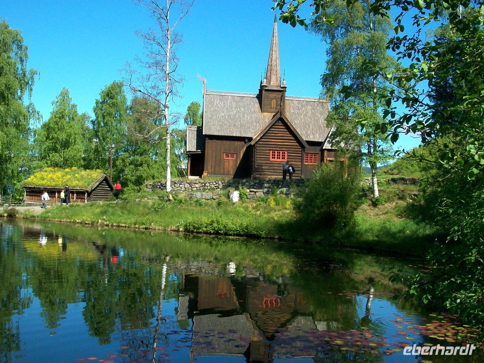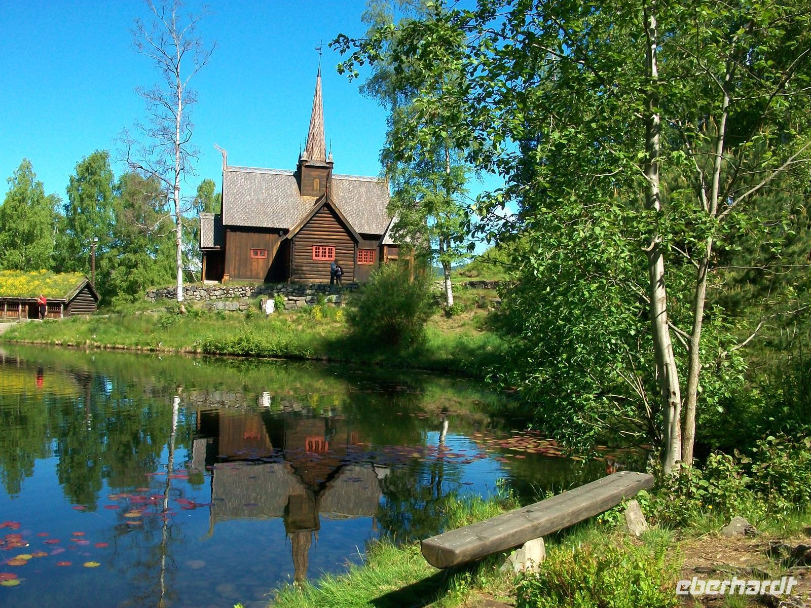 Dann führt uns der Weg zur Stabkirche die sich sehr pittoresk im Wasser des kleinen Sees widerspiegelt. Im Hintergrund der blaue Himmel und die weißen Haufenwolken machen diese romantische Impression perfekt. In der Kirche selbst erfahren wir viel über diese eigenartigen Kirchenbauten die vom Schiffsbau inspiriert wurden und die es fast ausschließlich nur in Norwegen gibt. Wissenswert sind auch die Erklärungen zur Religionsausübung selbst und nach dieser schönen Führung tauchen wir wieder im Jetzt auf und setzen nach einer Freizeit im Museum unsere Reise durch das Traumland Norwegen fort.