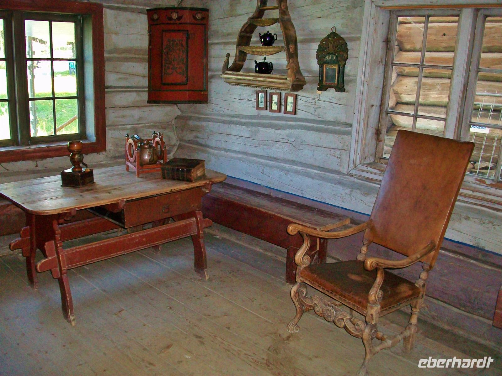 Zuerst schauen wir uns ein Gehöft an, exotisch erscheinen uns die Alltagsgegenstände dieser Zeit, sachkundig werden wir aber von alldem unterrichtet, nachdem wir in der Guten Stube des Bauern Platz genommen haben. Hier ist alles etwas niedrig und die kleinen Fenster lassen kaum Licht hinein. Um die Ecke herum befindet sich die Küche, rußgeschwärzt vom offenen Feuer was