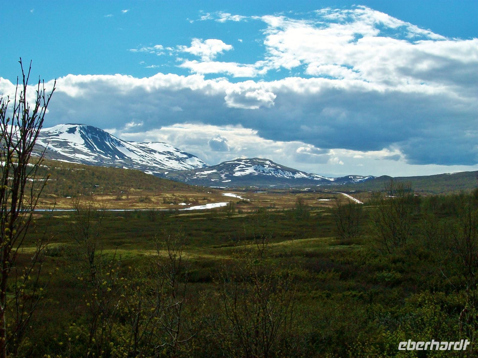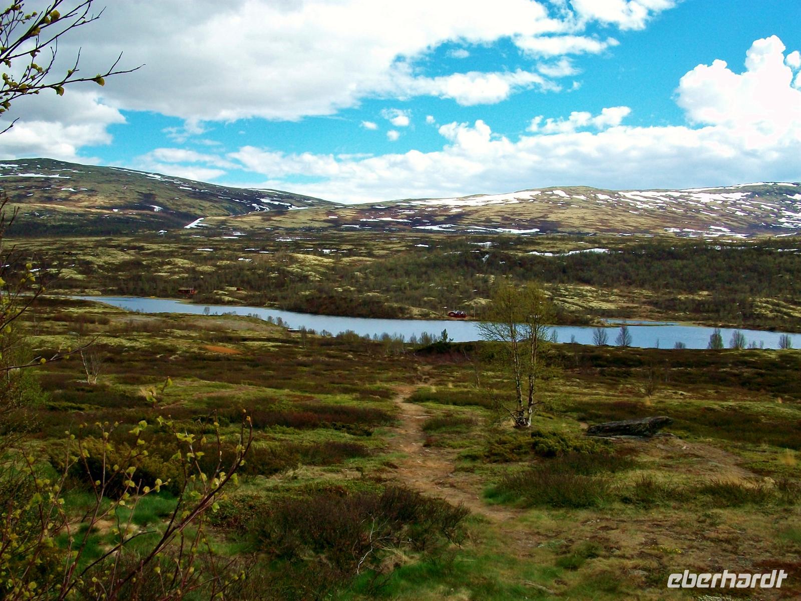 Dann schwenken wir ein in Richtung Dovrefjell, die Straße führt uns nach oben und bald ändert sich das Landschaftsbild grundlegend. Hier sind wir nun knapp an die Baumgrenze herangefahren, es gibt nur niedrige Sträucher, alpine Matten mit Blumen die aber nur klein und unscheinbar sind. Faszinierend sind die kleinen Bäche die sich schlängelnd ihren Weg suchen; kleinere Seen und auch Feuchtbiotobe wechseln sich mit einer Hochmoorlandschaft ab. Über allem sind die fast vegetationslosen Berge zu sehen, die noch Schneereste tragen und sich in den Gewässern widerspiegeln. Hier oben schlägt das Herz des Naturfreundes schneller, die intakte Natur inspiriert zum Träumen.