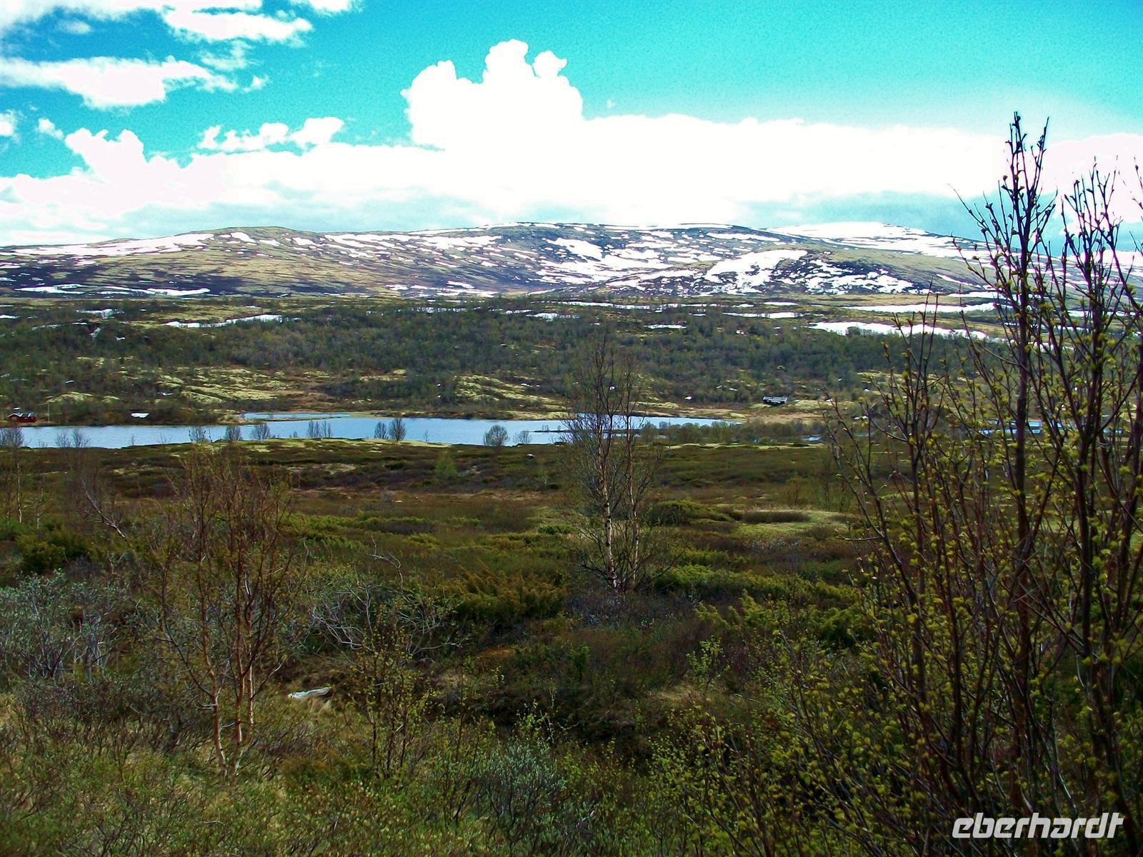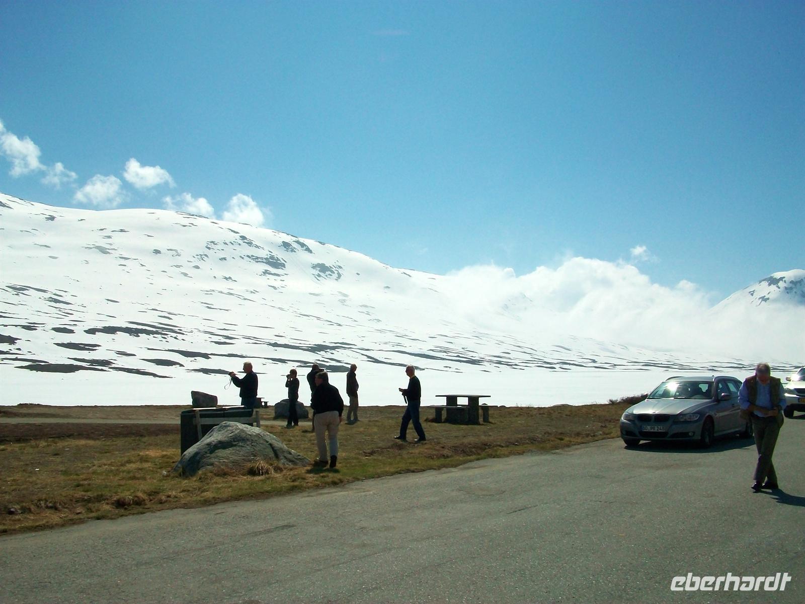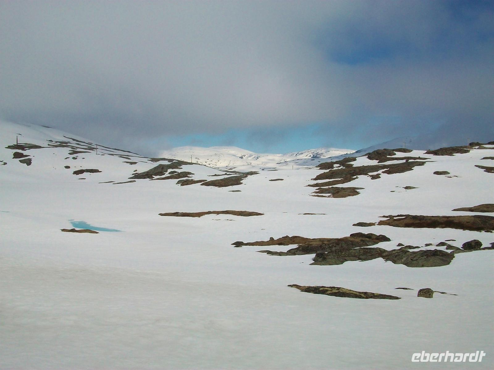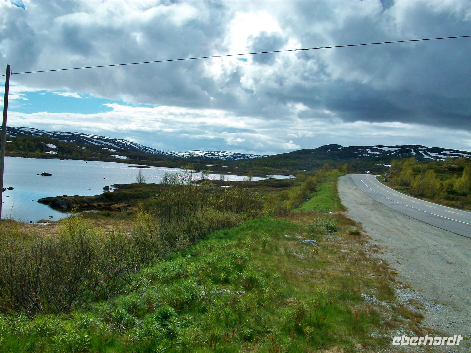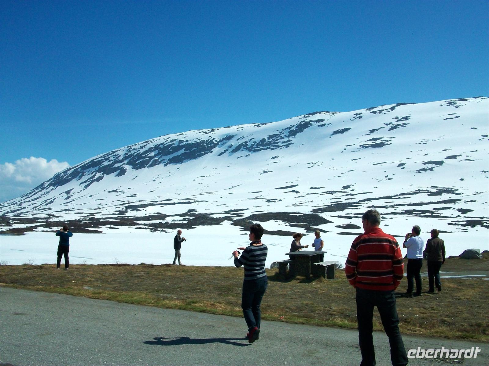 Das war nun der beeindruckendste Wasserfall dieser Tour, die Impression wirkt noch lange nach, auch als wir schon in einer weiteren schönen Landschaft unterwegs sind in der typischen Hochebene einer weiteren Fjelllandschaft, es ist das Hardangervidda. Wir sehen auch hier wieder eine unberührte Natur mit der eigenartigen Flora der Tundra. In kleineren Seen spiegelt sich der blaue Himmel, ringsum kontrastieren weiße Schneeflächen mit der grün braunen Farbe dieses Gebietes- es ist einfach wunderbar.