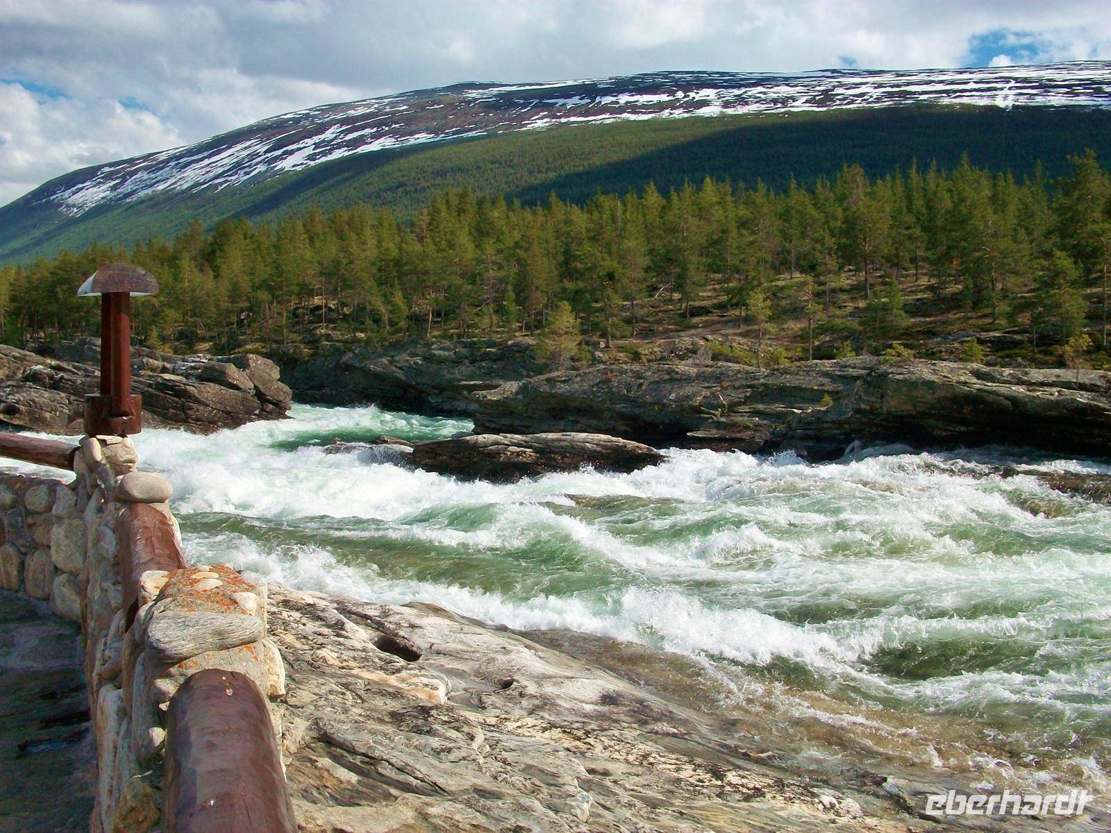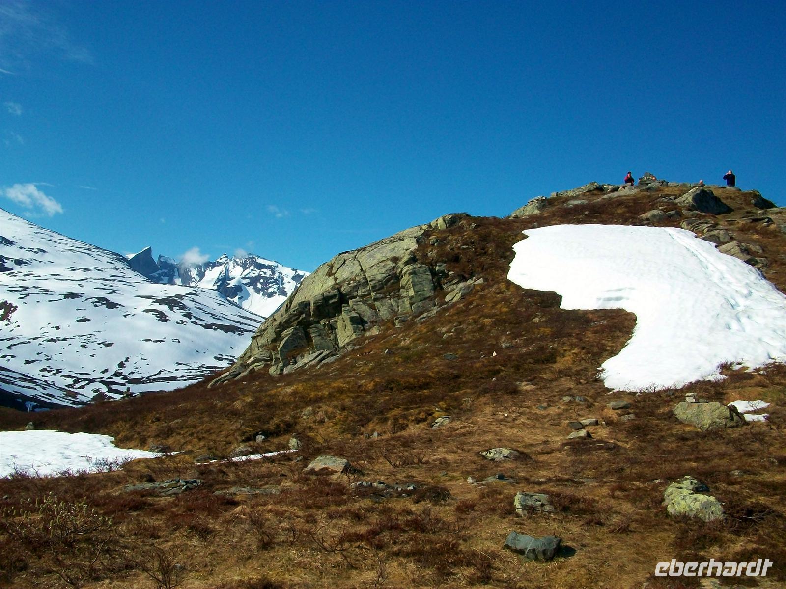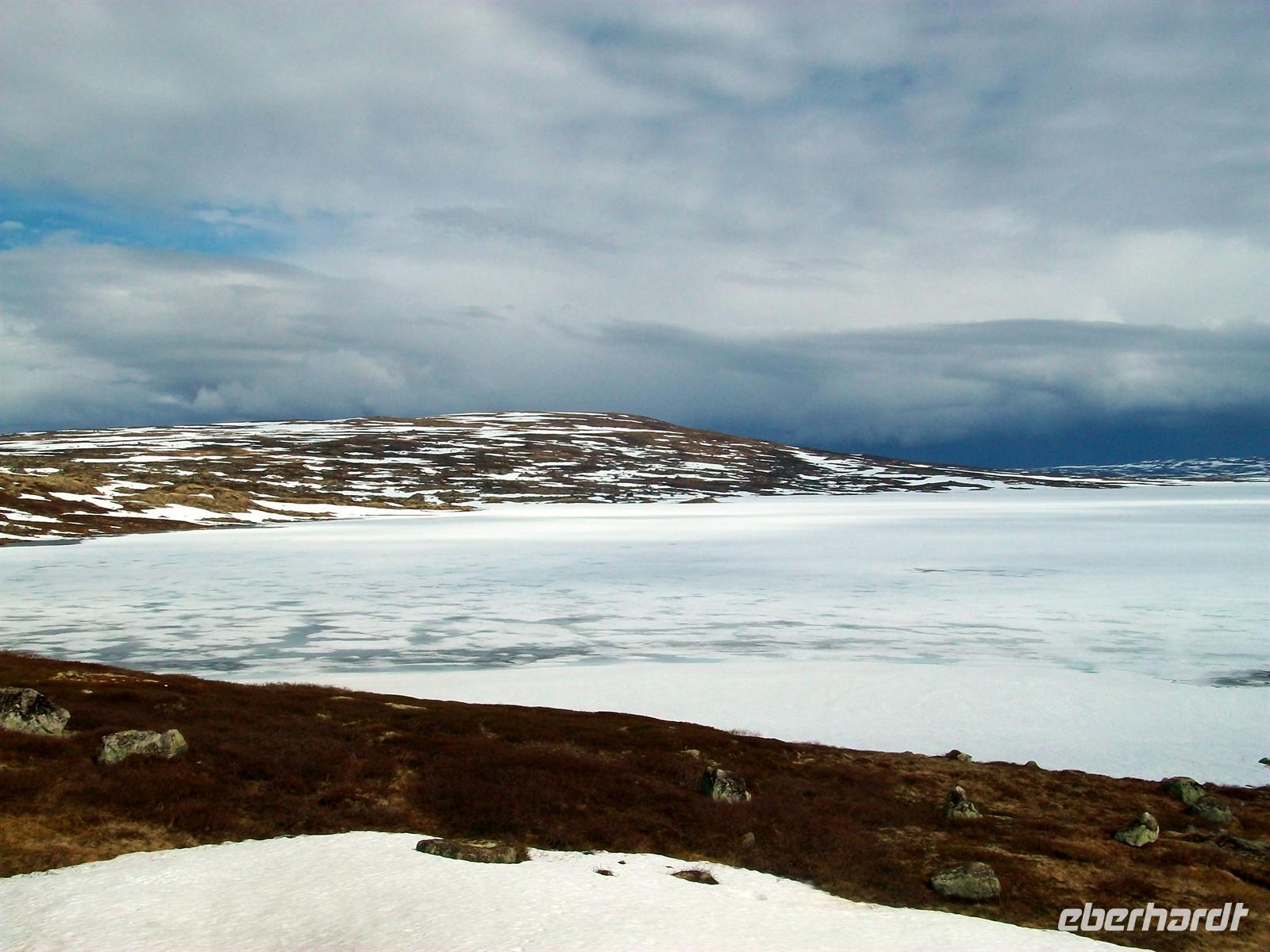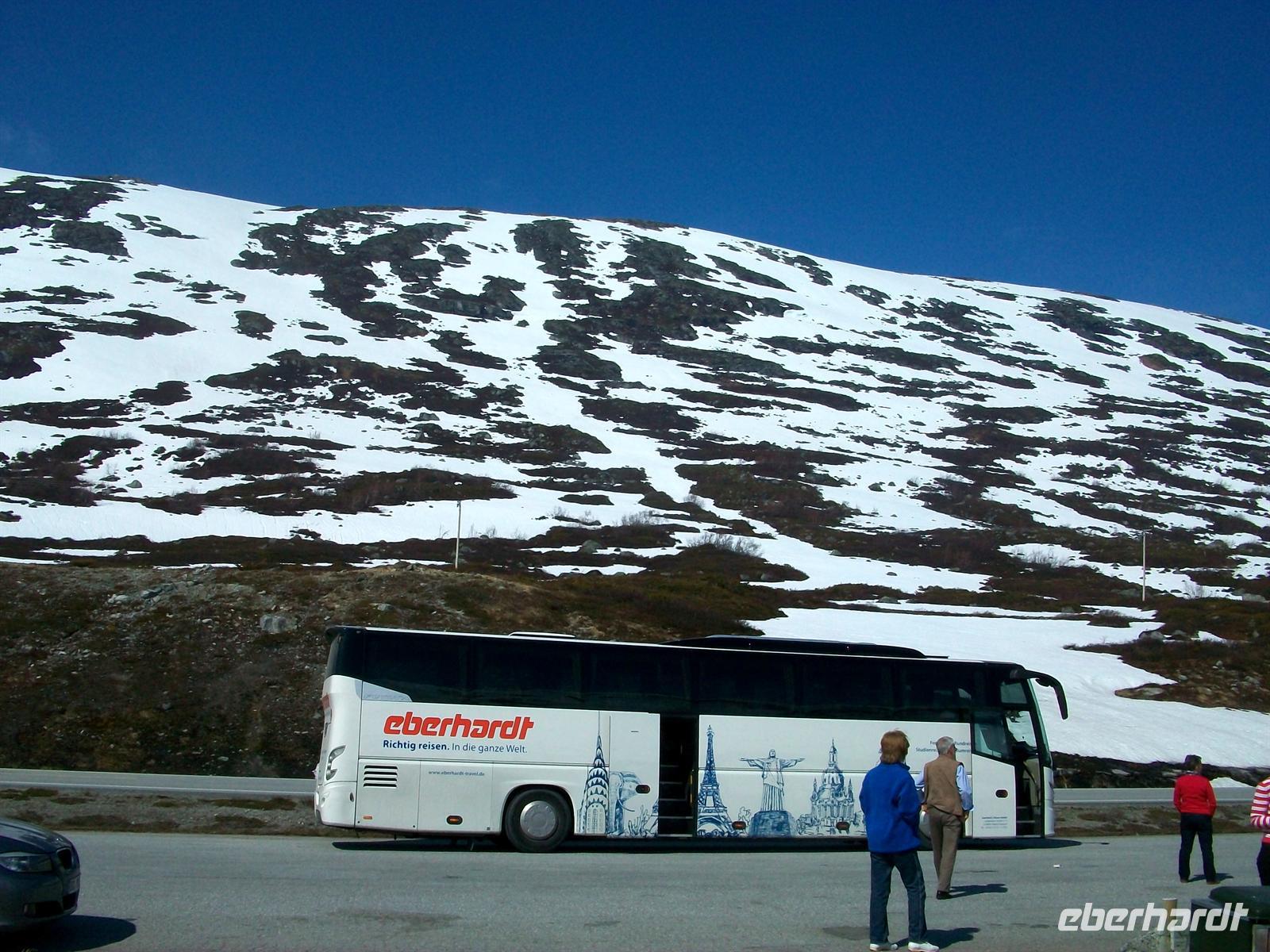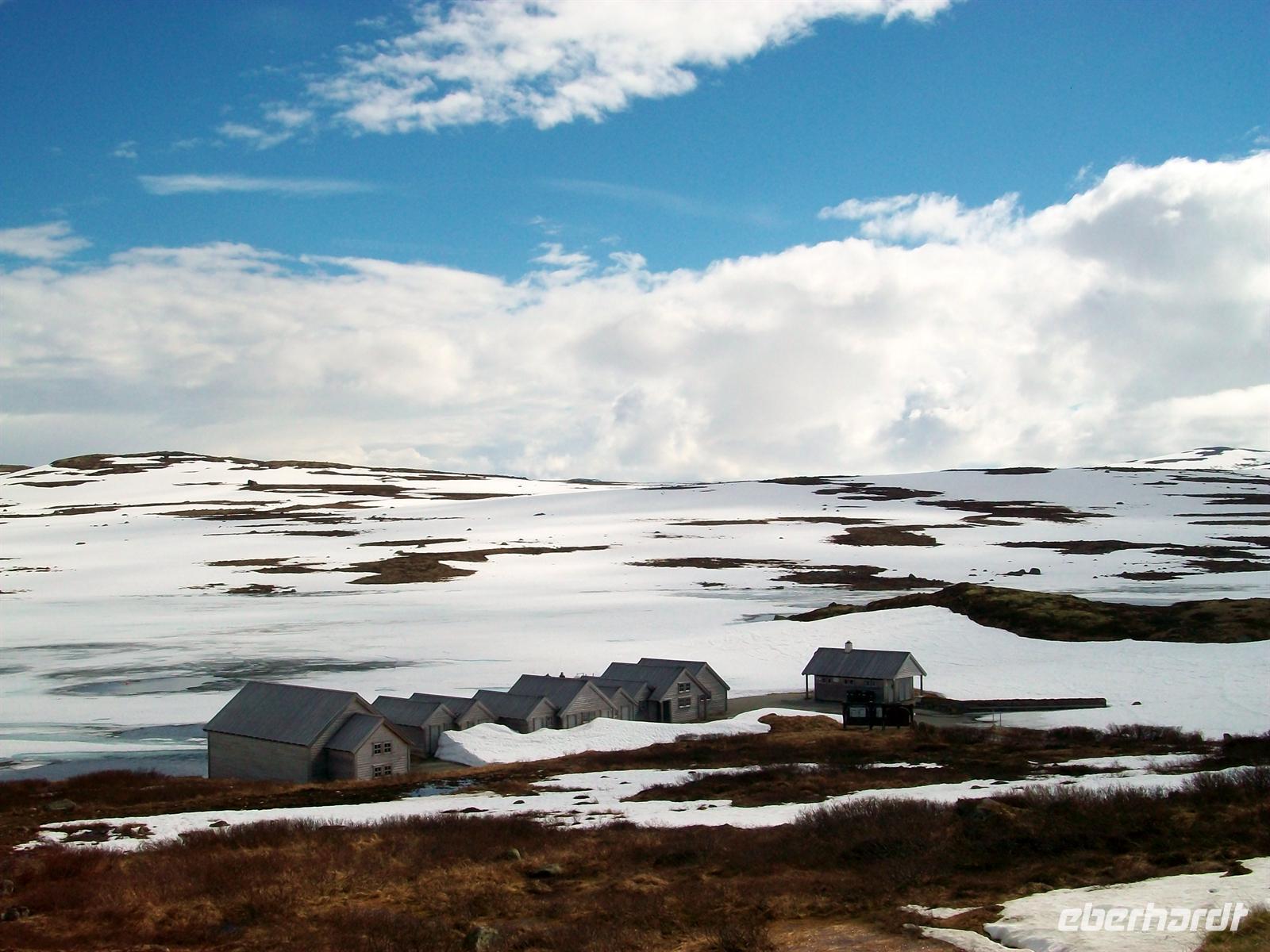 Das war nun der beeindruckendste Wasserfall dieser Tour, die Impression wirkt noch lange nach, auch als wir schon in einer weiteren schönen Landschaft unterwegs sind in der typischen Hochebene einer weiteren Fjelllandschaft, es ist das Hardangervidda. Wir sehen auch hier wieder eine unberührte Natur mit der eigenartigen Flora der Tundra. In kleineren Seen spiegelt sich der blaue Himmel, ringsum kontrastieren weiße Schneeflächen mit der grün braunen Farbe dieses Gebietes- es ist einfach wunderbar.