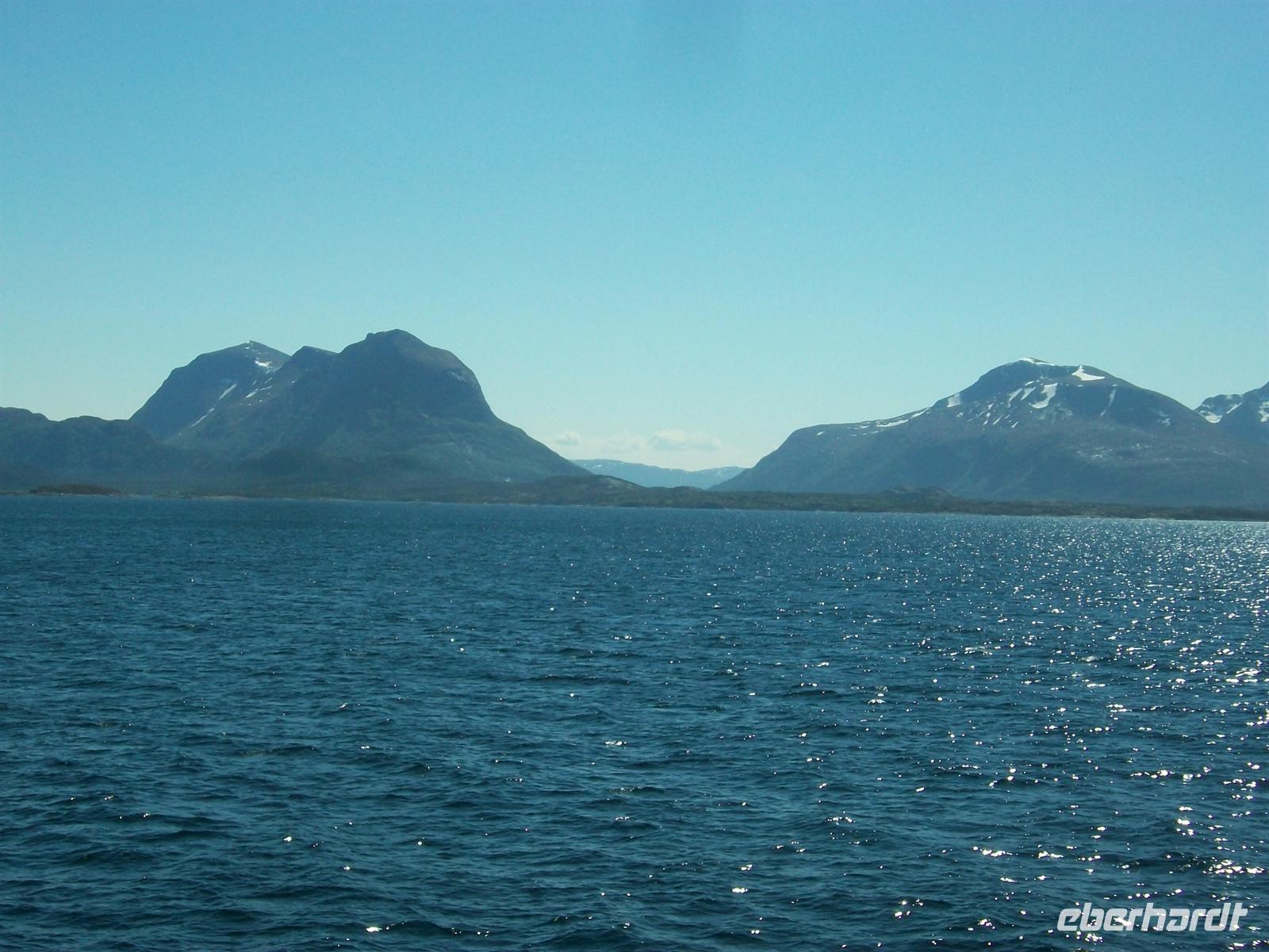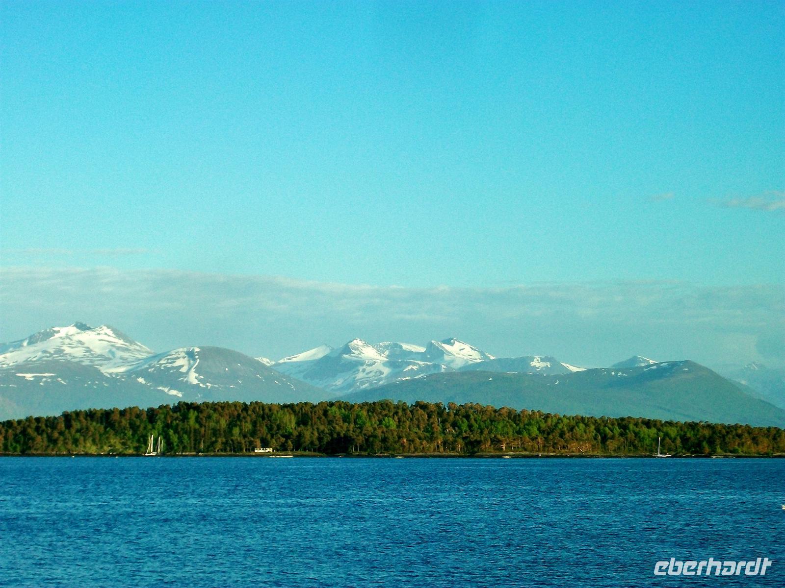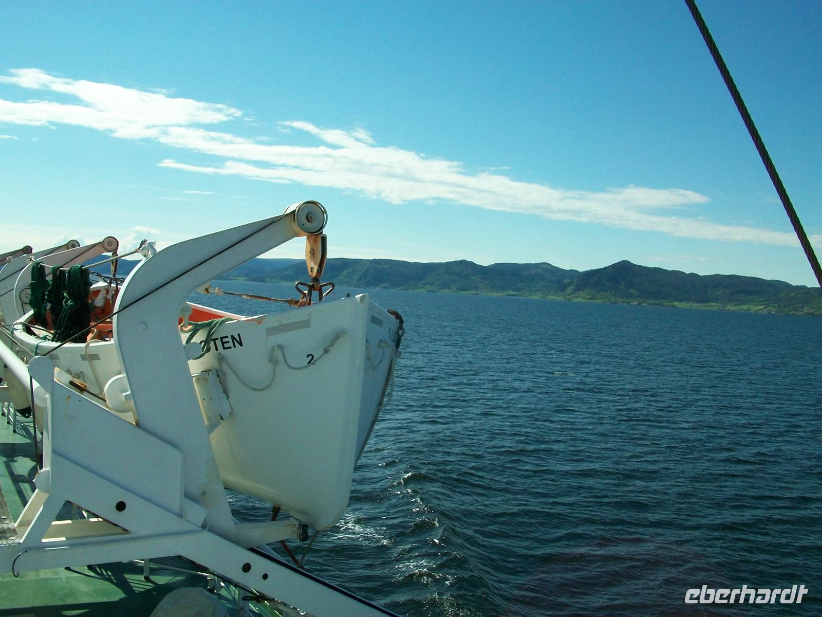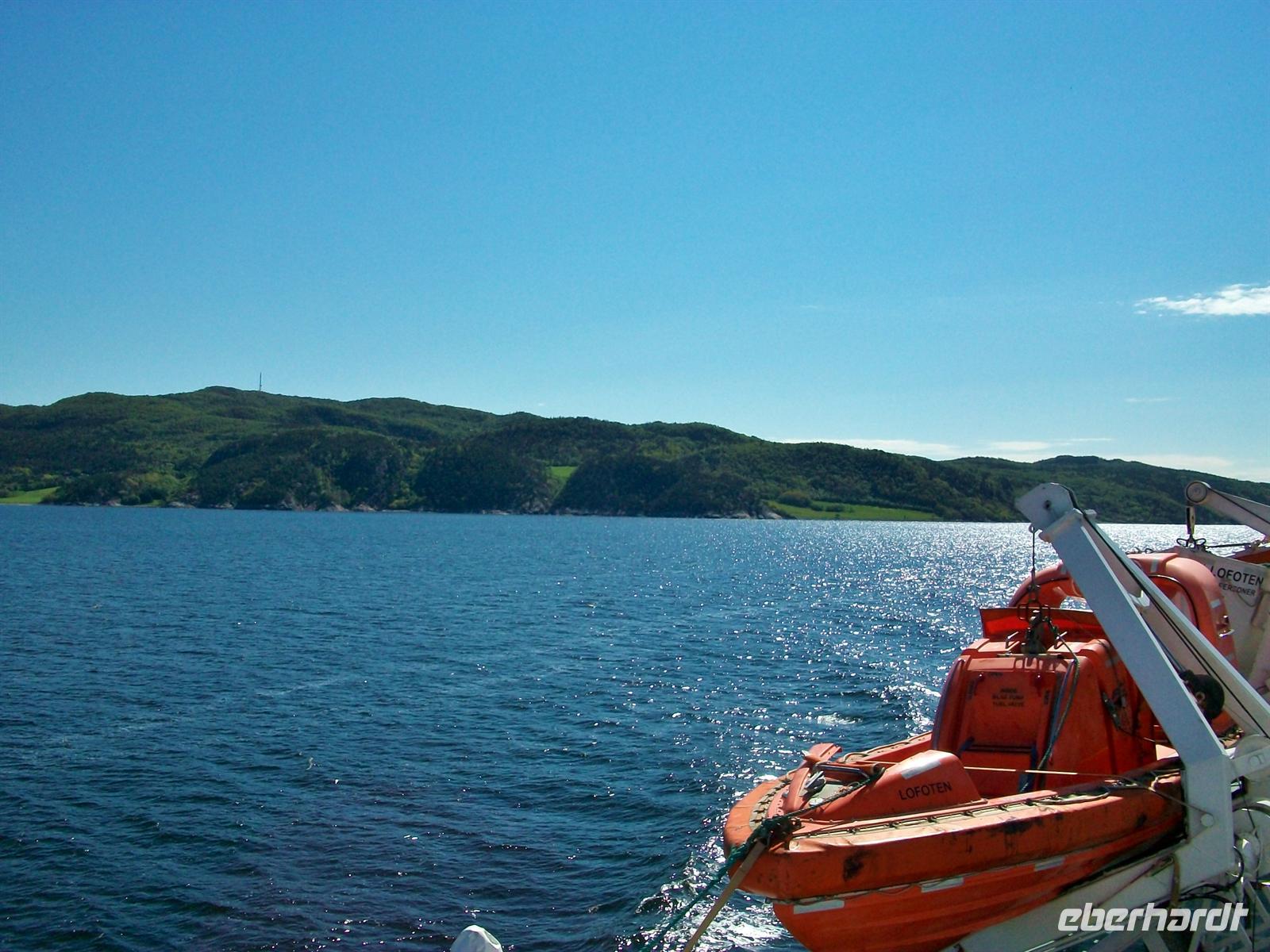 10.00 Uhr. Laute Hupsignale vom Schiff kündigen die Abfahrt an, unsere Gäste haben sich schöne Plätze gesucht. Langsam setzt sich das Schiff in Bewegung und die Häuser von Trondheim ziehen an den Fenstern des Schiffes vorbei. Gemächlich durchfahren wir Teile des Trondheimfjords; nachdem wir die Stadt verlassen haben säumen sanfte Höhen unsere Bahn, dazwischen manch kleines Dorf welches mit den roten, holzverkleideten Häusern schöne Farbtupfer setzt. Und dazwischen auch immer wieder saftig grüne Wiesen, die Fahrt kann schöner nicht beginnen.