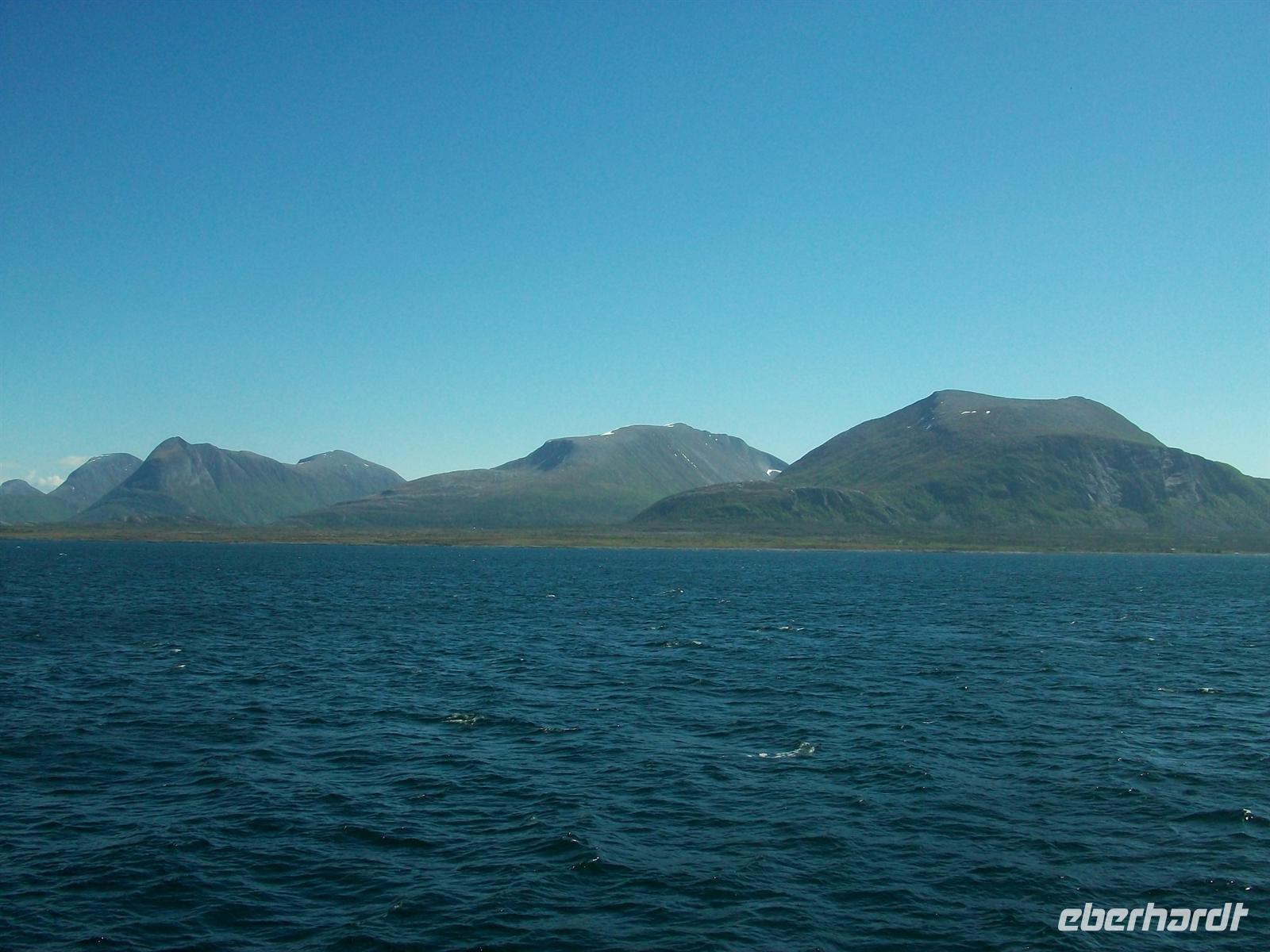 Zum Mittagessen lockt das Restaurant mit einem leckeren Speisenangebot und für den Nachmittag steht Kaffee und Kuchen zur Verfügung. Die Stunden plätschern dahin, es ist ein ruhiger Punkt unserer Reise, die vorhergehenden Tage waren doch etwas anstrengend und so genießt jeder unserer Gäste einen geruhsamen Tag an Bord. Die See ist glatt, es gibt kaum Wellen nur hin und wieder zeugt ein leichtes Auf und Ab des Schiffes davon, dass wir auf dem Meer sind. Viele Passagiere haben es sich außen bequem gemacht und genießen die Sonnenstrahlen auf dem Deck obgleich es doch einen recht kühlen Wind gibt; die Erhebungen die sich vom Land her zeigen tragen auch noch Schneereste.