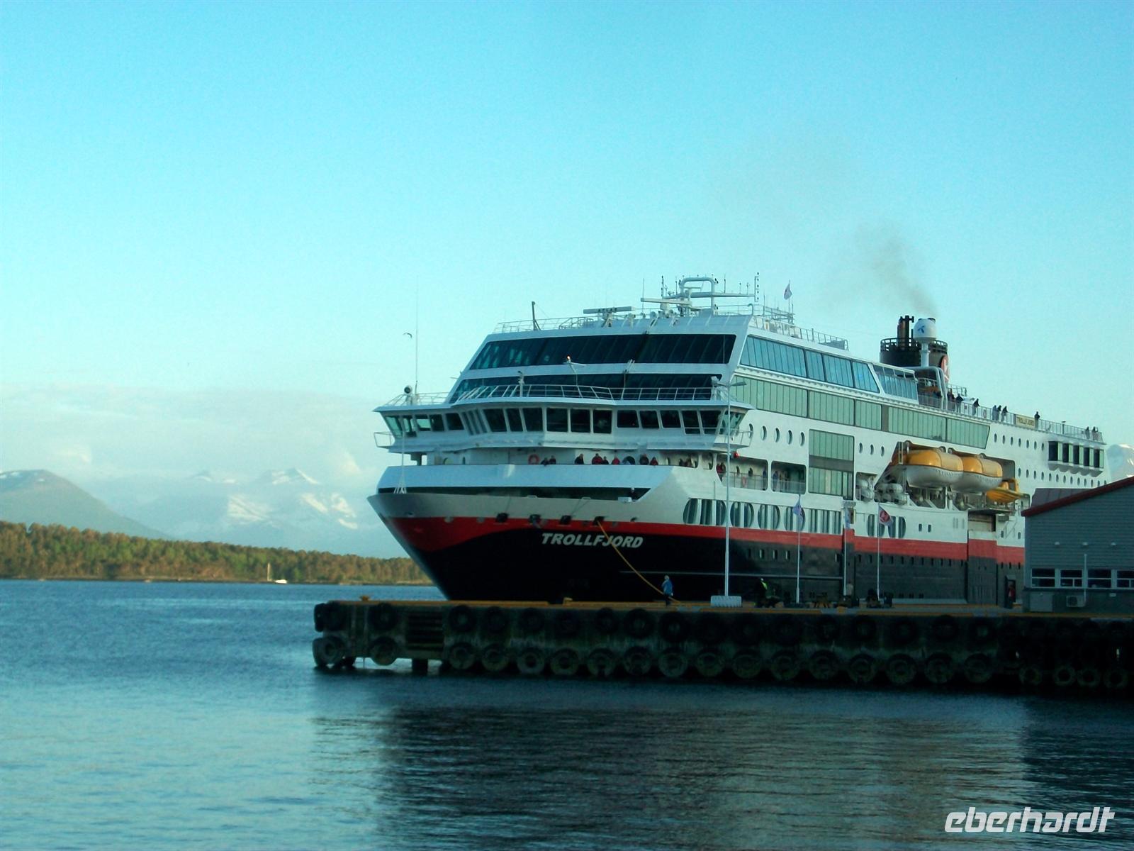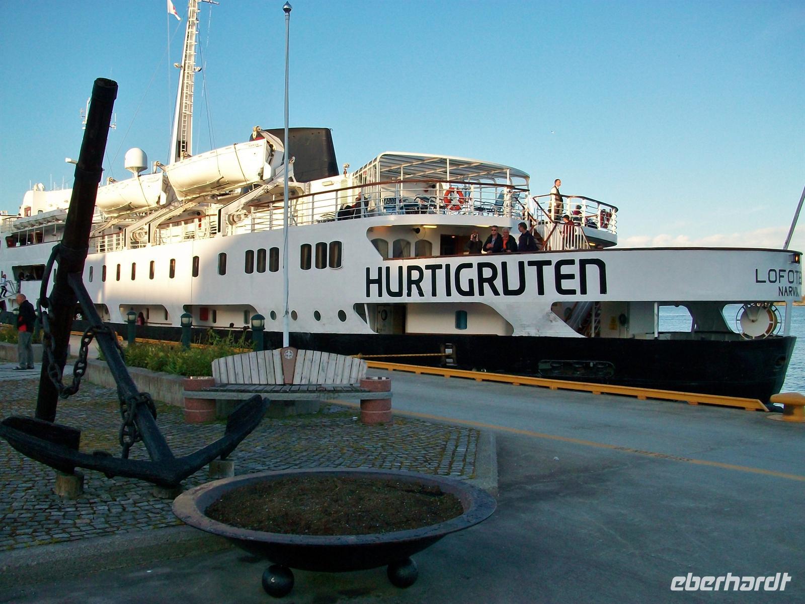 Gegen halb zehn kommen wir am Anleger an wo schon die „MS Lofoten“ festgemacht hat und auf die Gäste wartet. Es ist ein Schiff aus der Gründerzeit der Hurtigroute und besticht durch das besondere Ambiente der 60-er Jahre des 20. Jahrhunderts. Auch die Innengestaltung trägt die Spuren der Zeit als die Beatles eben ihre Weltkariere starteten.