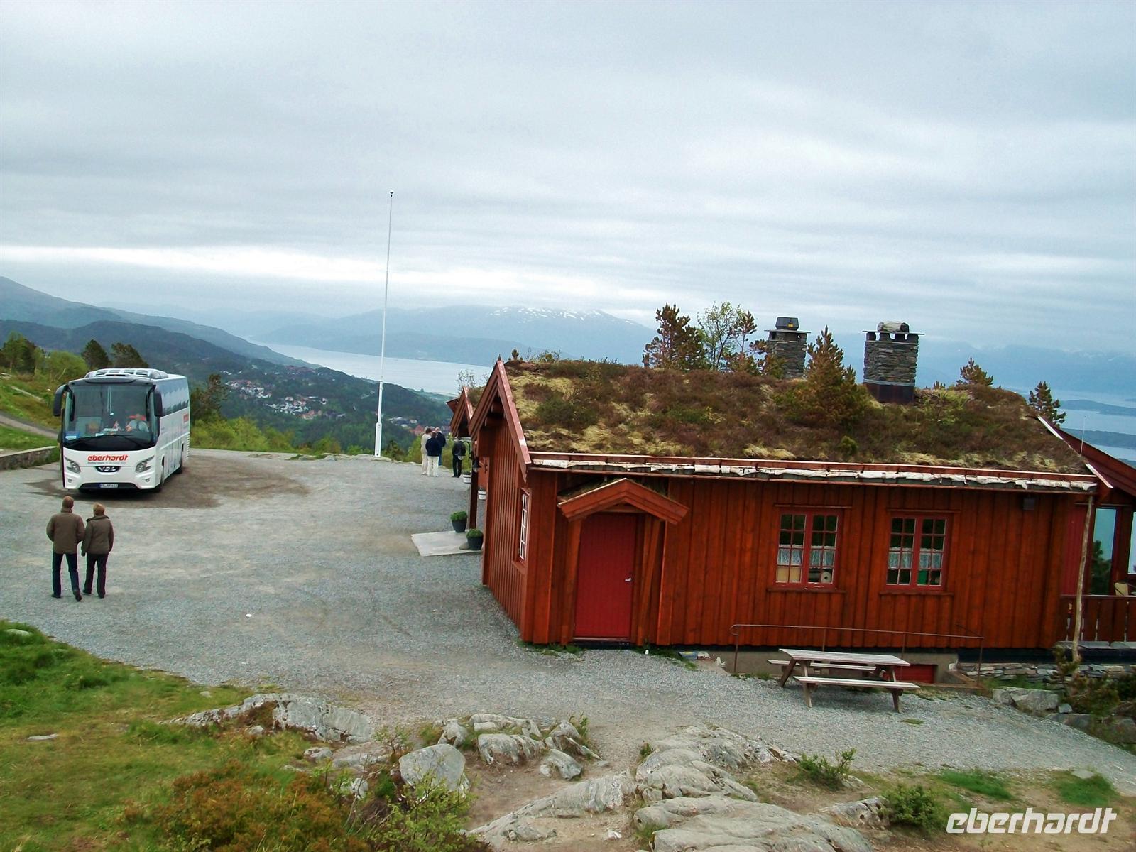 10.6.2012. Beim Erwachen geht mein erster Blick hinaus zu den Bergen und ich bin etwas enttäuscht als ich diese in den Wolken finde. Der Tag beginnt grau und neblig, das lässt unseren Tatendrang aber nicht ruhen; kurz nach neun sind wir schon unterwegs mit unserem Bus den Hausberg von Molde, den Varden zu erklimmen.