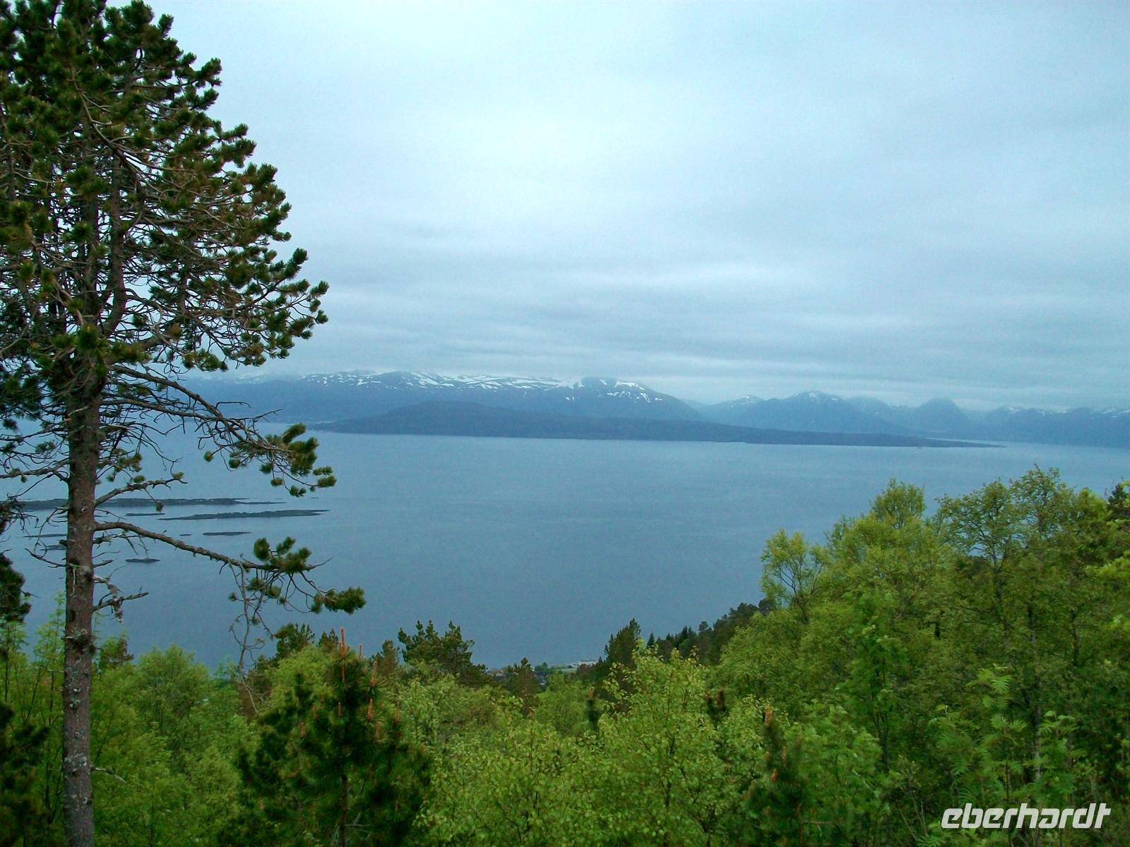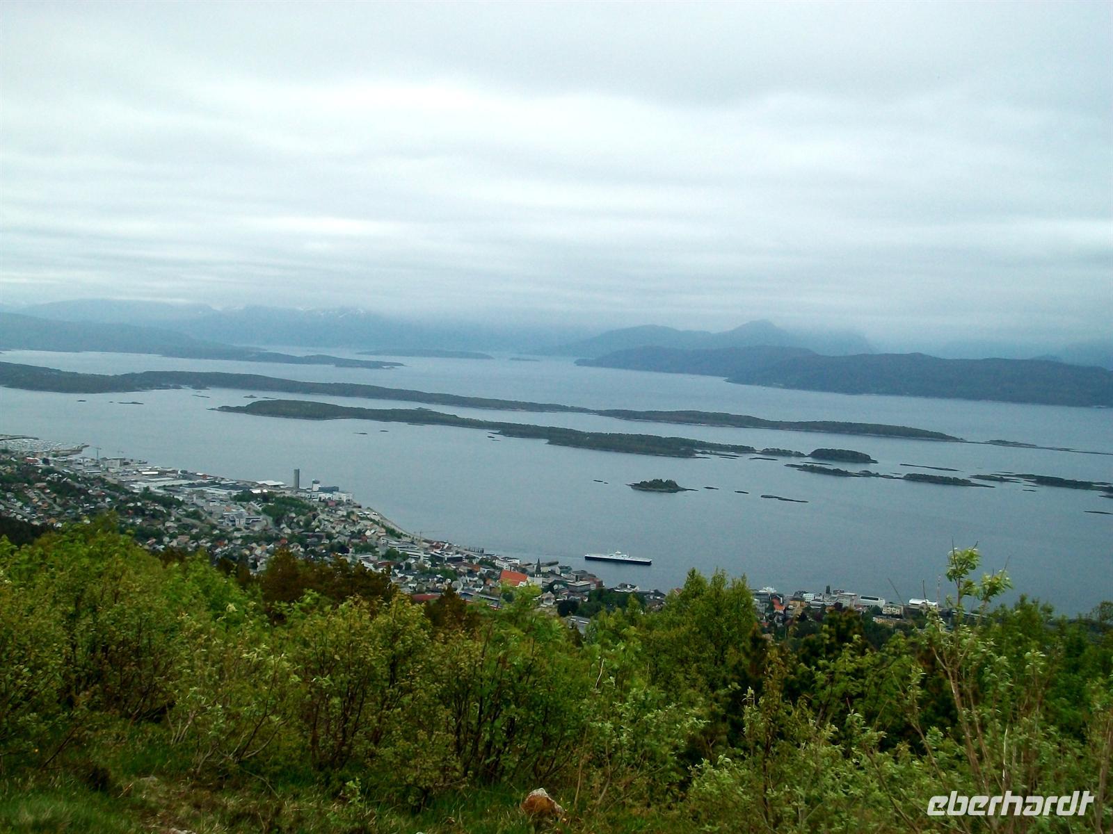 Es ist nieslig und etwas kühl, bleigraue Wolken ziehen über unseren Köpfen dahin aber der Blick hinunter zur Stadt ist einmalig. Eng an das Wasser des Fjordes geschmiegt liegt Molde zu unseren Füßen und der Blick schweift auf der anderen Seite in Richtung Meer.