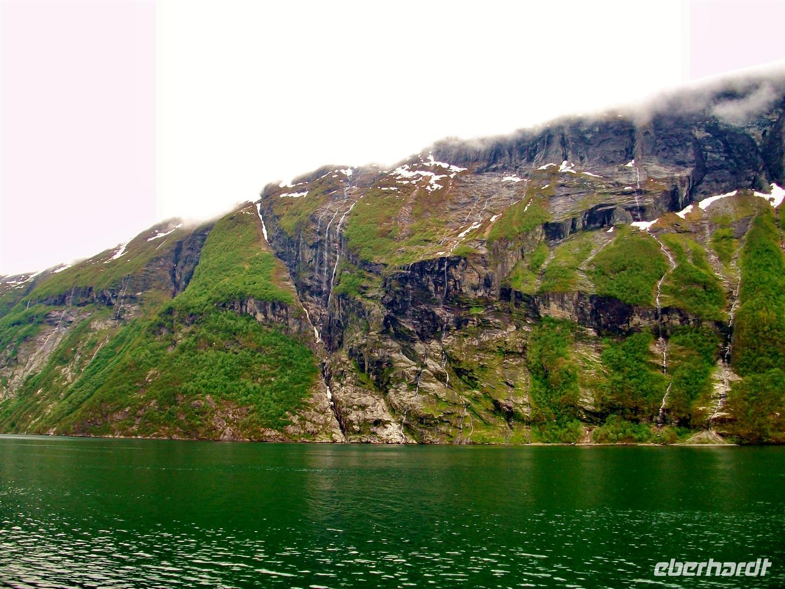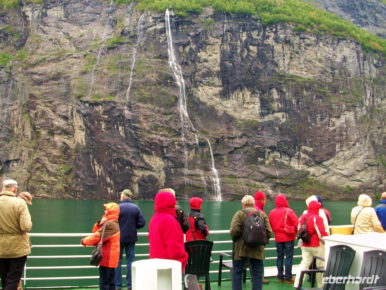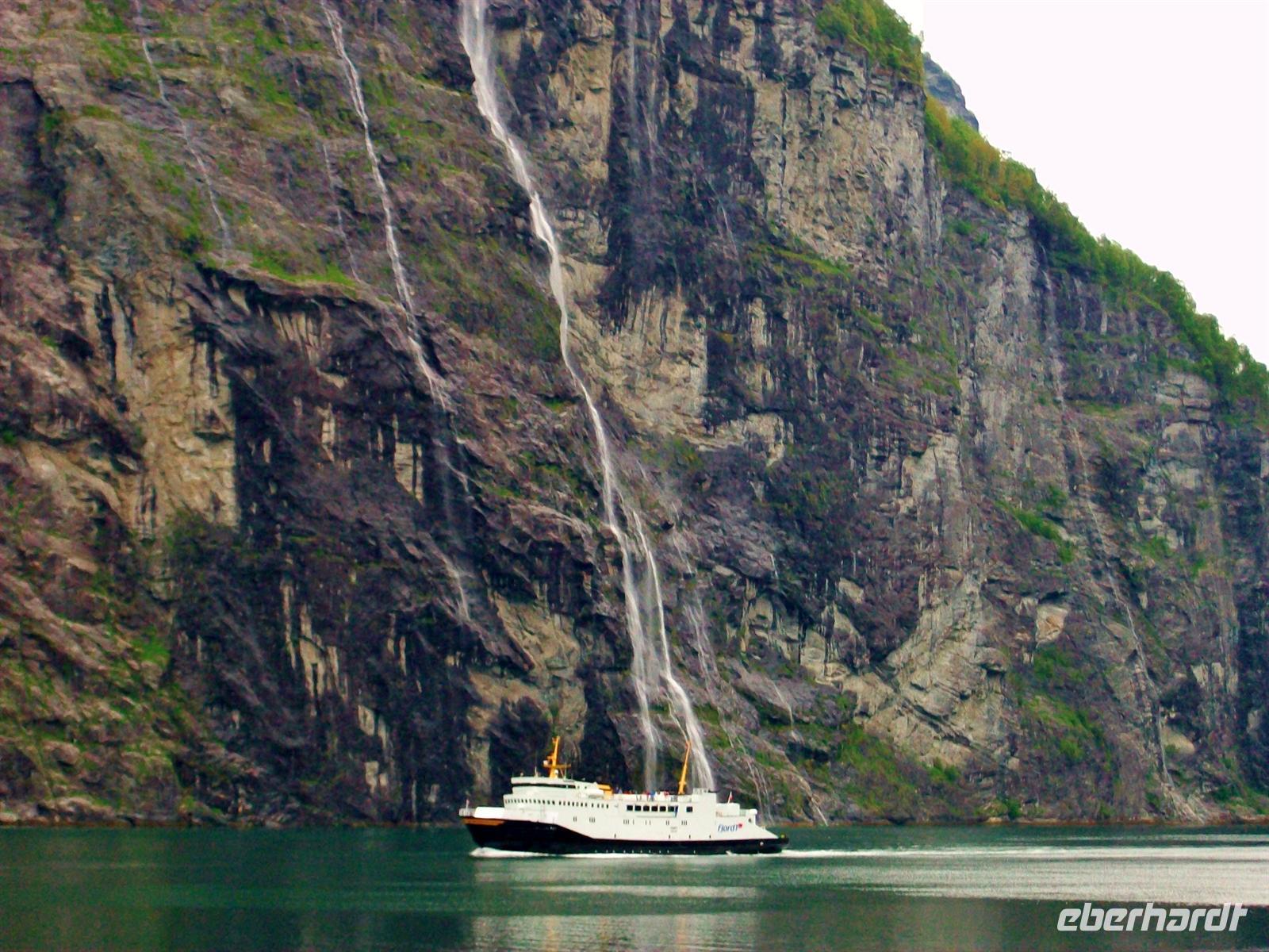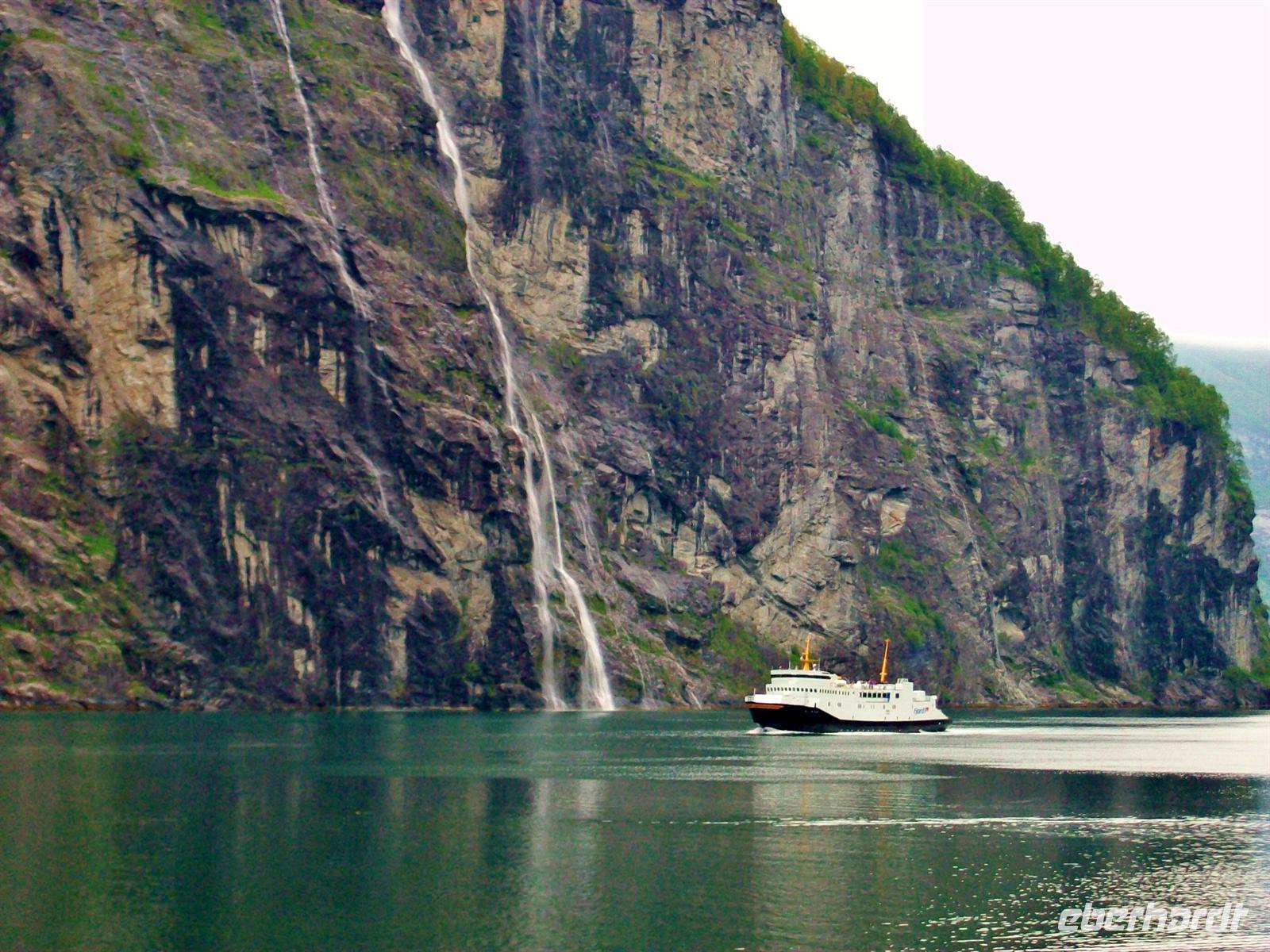 Die Fahrt geht los und langsam ziehen wir unsere Bahn; direkt vom Wasser steigen steil die Berge empor, von oben senden zahlreiche Wasserfälle das sprudelnde Nass in den Geirangerfjord. Es ist der ewige Kreislauf der Natur und wir Menschen sind mittendrin und schauen bewundernd auf diese grandiosen Erscheinungen. Etwas verloren kommen wir uns zwischen diesen gigantischen Erhebungen vor die manchmal lotrecht emporsteigen. Langsam zieht das Schiff seine Bahn, dieser Fjord enthüllt dabei mehr und mehr seine Geheimnisse, kein Wunder das die Menschen früher an Geister glaubten, irgendwie musste man diese Impressionen interpretieren.
