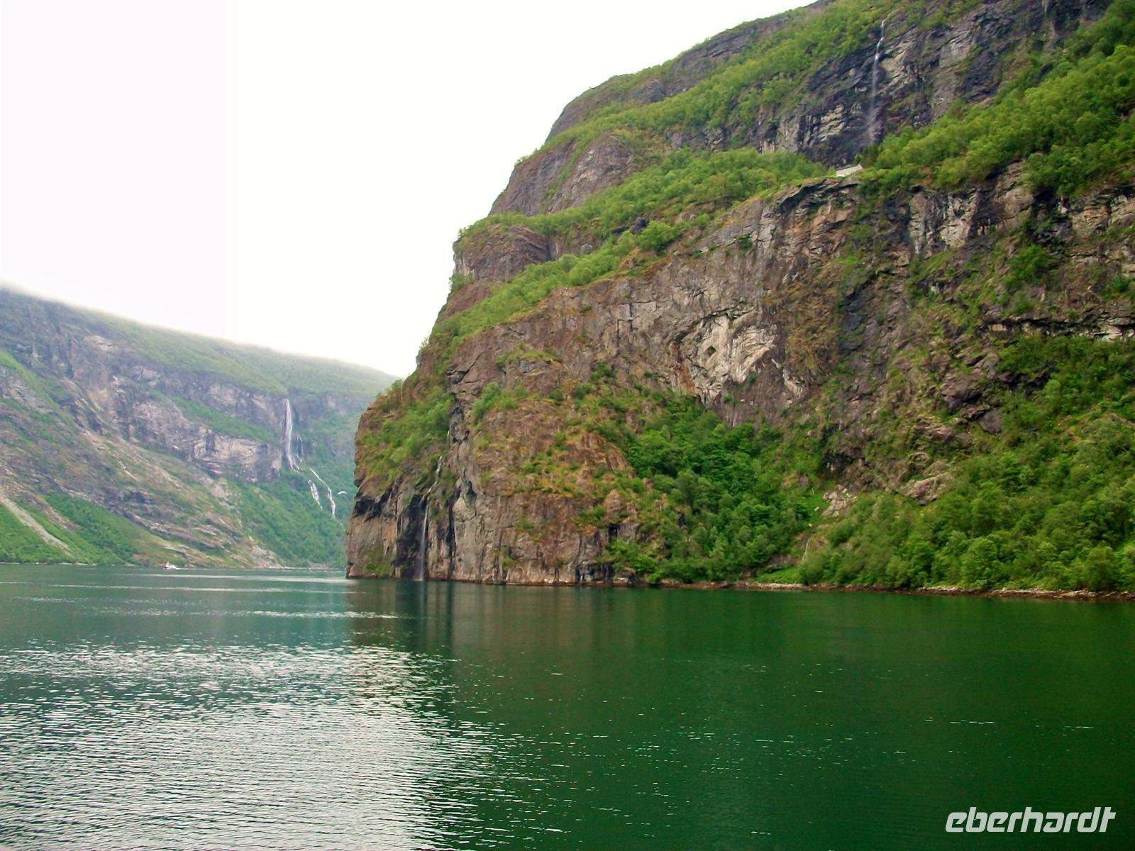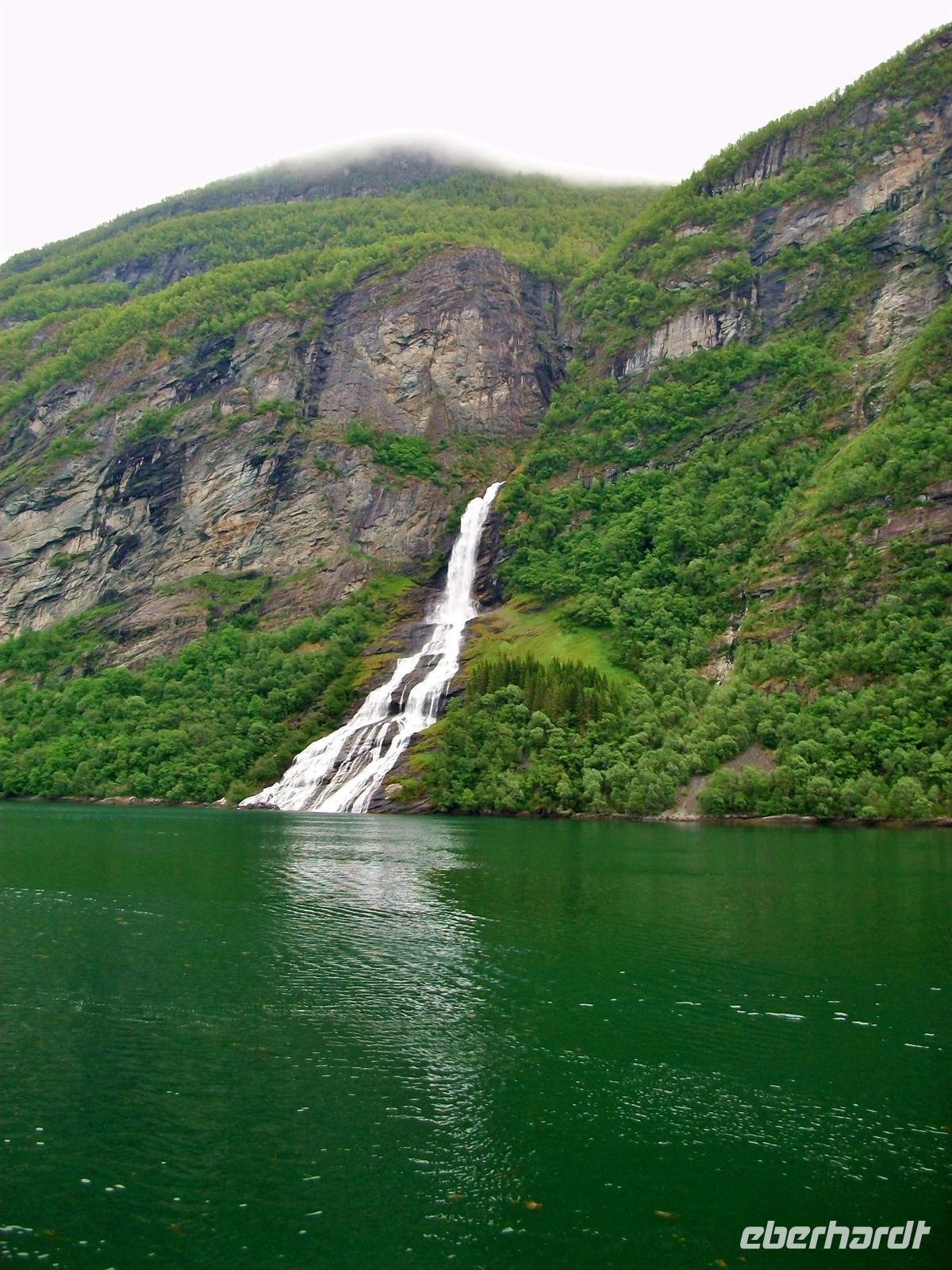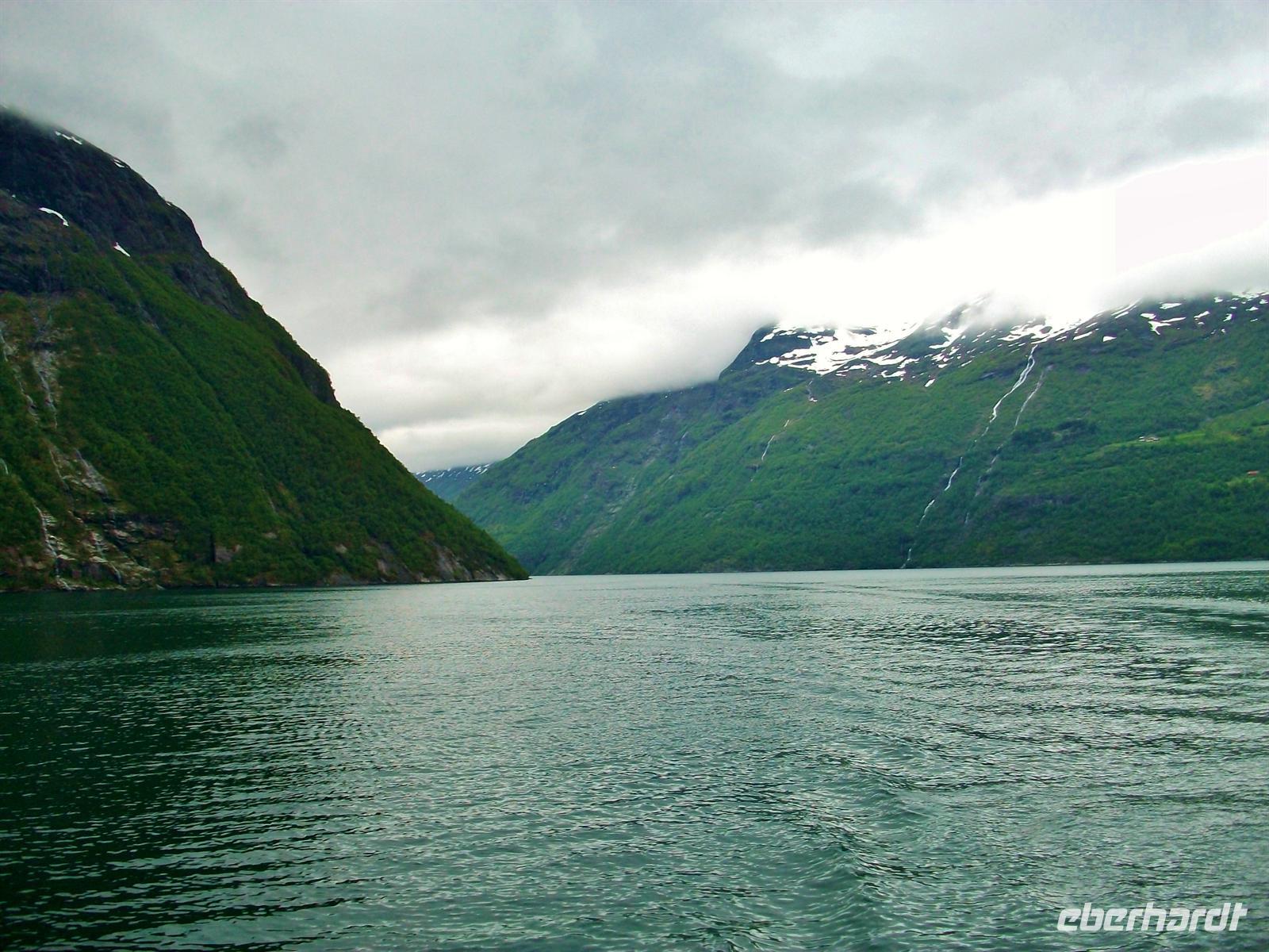 Die Fahrt geht los und langsam ziehen wir unsere Bahn; direkt vom Wasser steigen steil die Berge empor, von oben senden zahlreiche Wasserfälle das sprudelnde Nass in den Geirangerfjord. Es ist der ewige Kreislauf der Natur und wir Menschen sind mittendrin und schauen bewundernd auf diese grandiosen Erscheinungen. Etwas verloren kommen wir uns zwischen diesen gigantischen Erhebungen vor die manchmal lotrecht emporsteigen. Langsam zieht das Schiff seine Bahn, dieser Fjord enthüllt dabei mehr und mehr seine Geheimnisse, kein Wunder das die Menschen früher an Geister glaubten, irgendwie musste man diese Impressionen interpretieren.