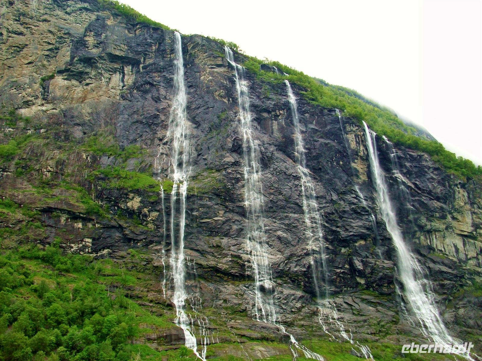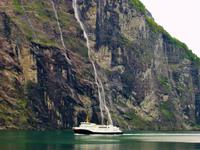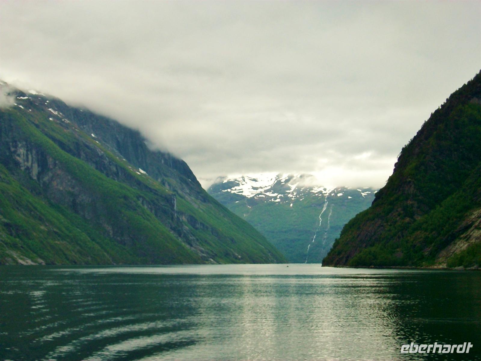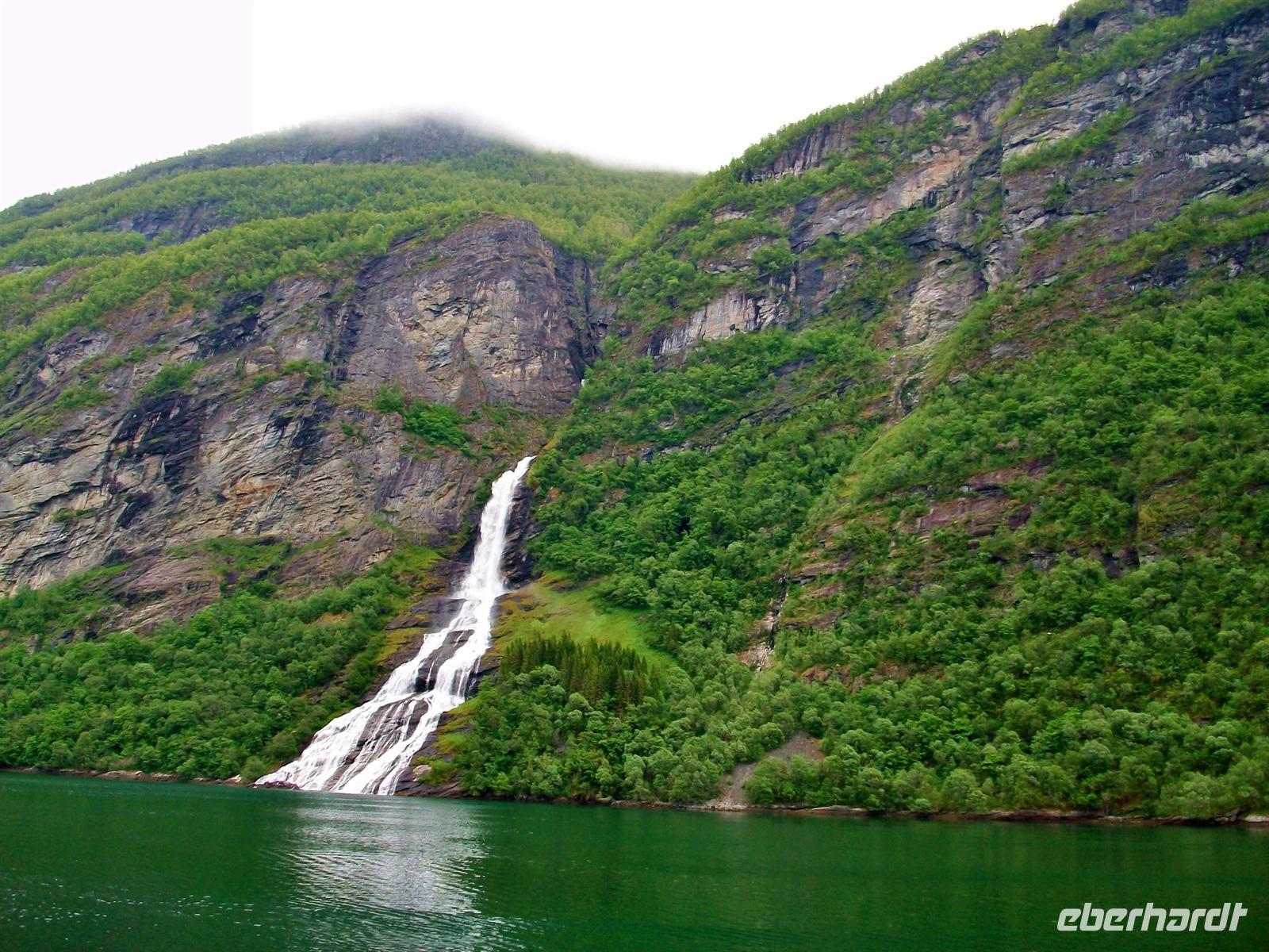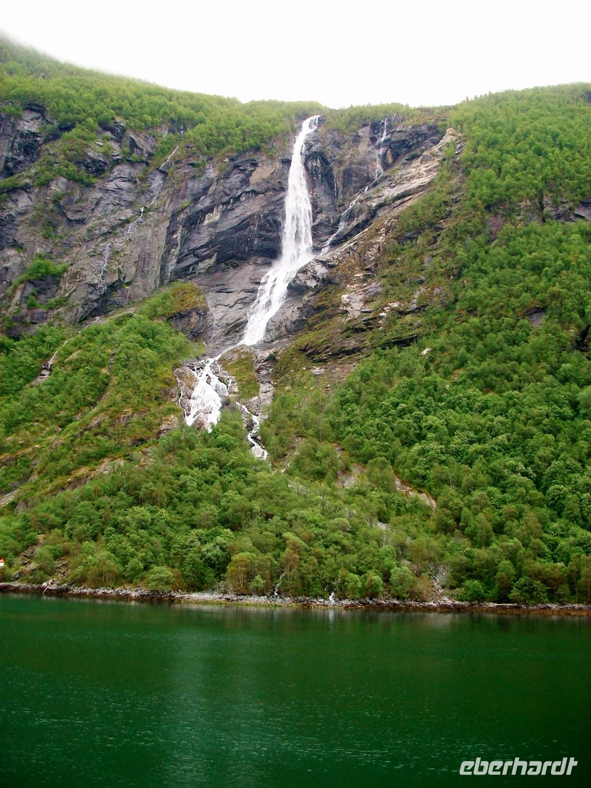 Die Fahrt geht los und langsam ziehen wir unsere Bahn; direkt vom Wasser steigen steil die Berge empor, von oben senden zahlreiche Wasserfälle das sprudelnde Nass in den Geirangerfjord. Es ist der ewige Kreislauf der Natur und wir Menschen sind mittendrin und schauen bewundernd auf diese grandiosen Erscheinungen. Etwas verloren kommen wir uns zwischen diesen gigantischen Erhebungen vor die manchmal lotrecht emporsteigen. Langsam zieht das Schiff seine Bahn, dieser Fjord enthüllt dabei mehr und mehr seine Geheimnisse, kein Wunder das die Menschen früher an Geister glaubten, irgendwie musste man diese Impressionen interpretieren.