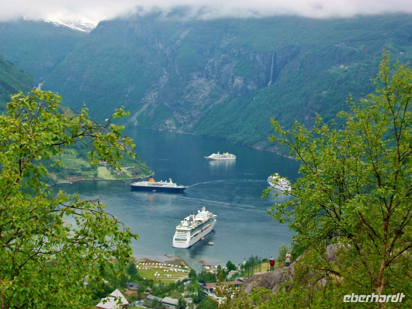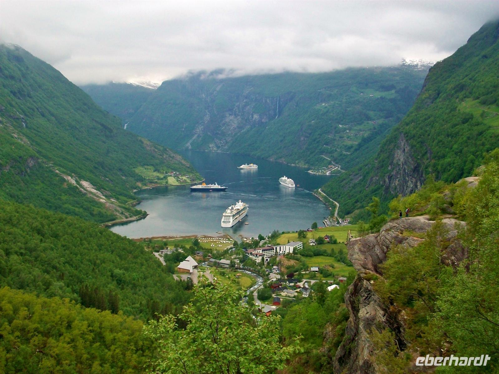 Doch bevor wir zum Ort hinunter fahren öffnet sich nach einem Straßentunnel ein Blick von oben auf den Geirangerjord. Über einhundert Meter über dem Meeresspiegel liegt diese Wunderwelt vor unseren Augen. Spielzeugklein fährt ein Schiff auf dem dunkelblauen Wasser einen Streifen hellen Kielwassers nach sich ziehend- ein einmaliger Blick!