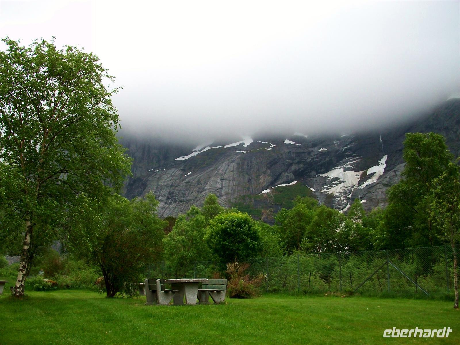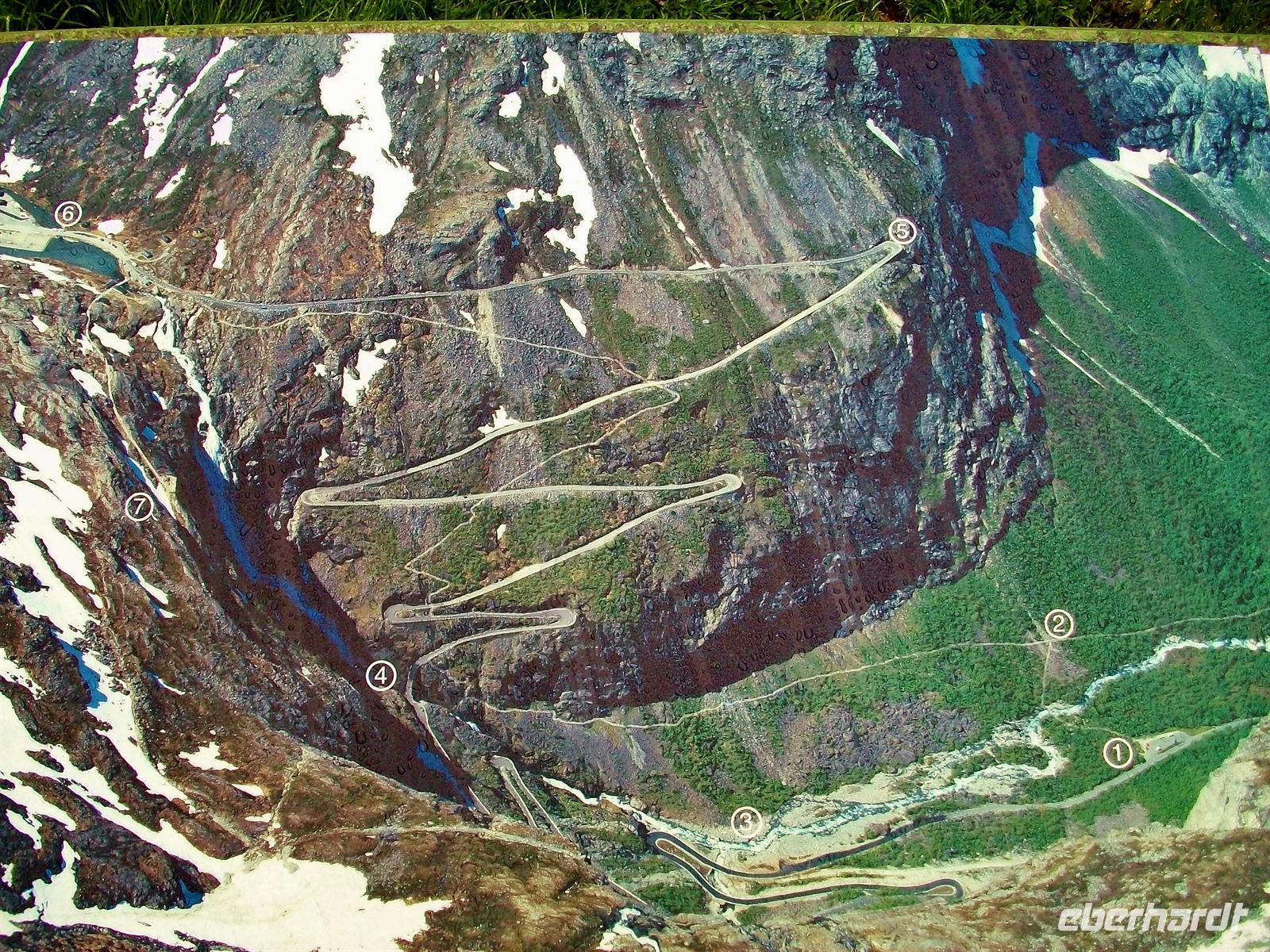 Weiter geht die Tour und bald haben wir die Zufahrtsstraße zu den Trollstigen erreicht. Doch zuvor machen wir noch einen Abstecher zur Trollwand die einige Superlative aufzuweisen hat. Auf jeden Fall ist sie mit über eintausend Metern die höchste Steilwand Europas.