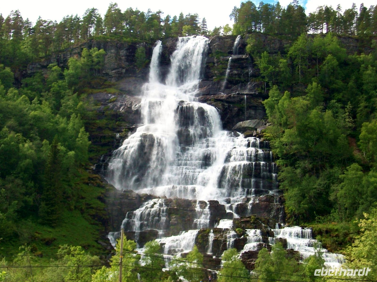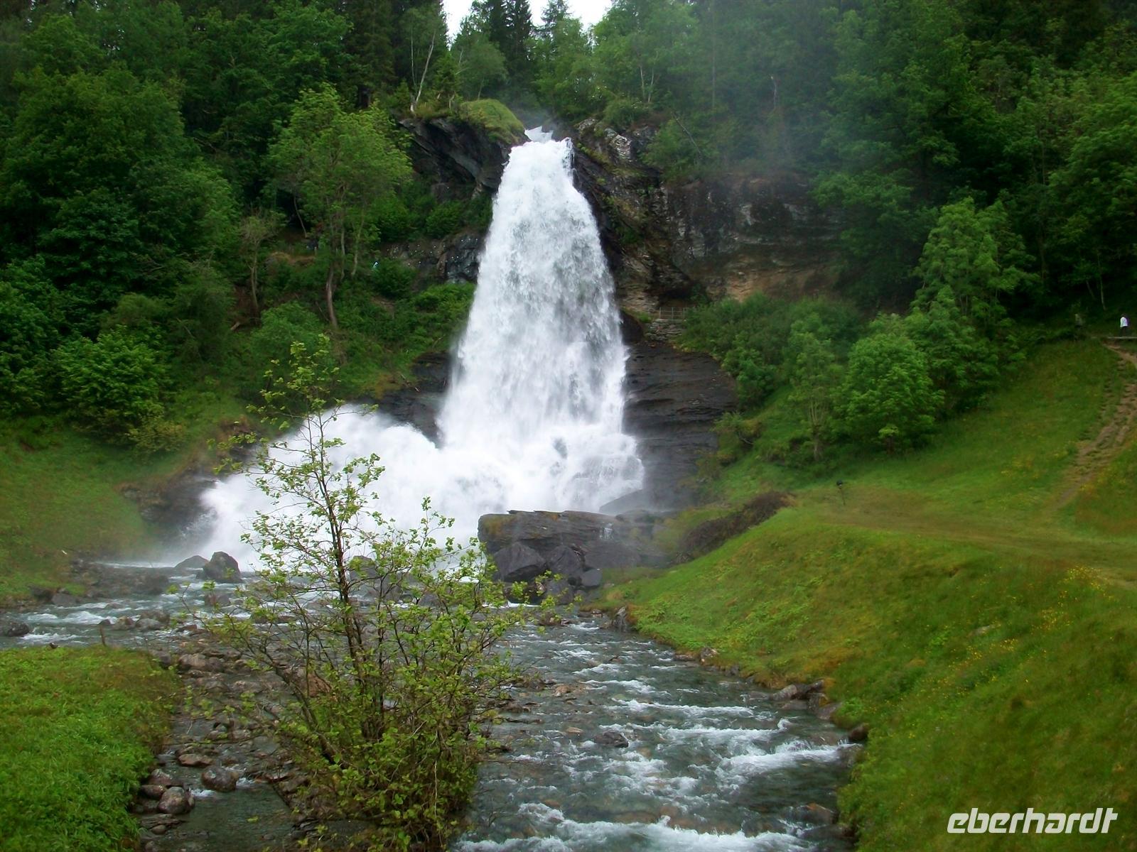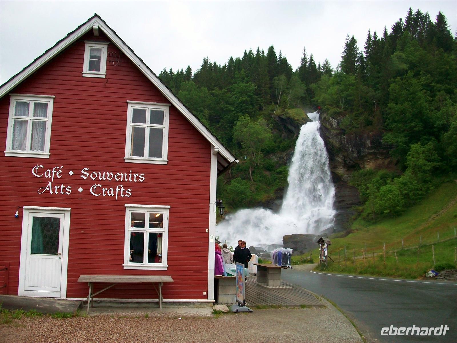 Gegen elf verlassen wir die Stadt Bergen. Bald sind wir dem Trubel der Metropole entronnen und erneut in der einmaligen Landschaft Norwegens unterwegs. Gegen halb eins haben wir einen weiteren Wasserfall erreicht, den Steindalfossen. Die Besonderheit dieses Falls ist das man hinter den Fall gehen kann ohne nass zu werden. Das Wasser fällt über einen Felsvorsprung, dahinter führt ein Weg entlang und man kann buchstäblich durch den Schleier des fallenden Wassers hindurchsehen. Nur schemenhaft erscheint dabei Straße und Bus. Wir nutzen die Zeit noch für einen kleinen Mittagsimbiss aber eine halbe Stunde später sind wir schon wieder unterwegs, unser Ziel ist noch weit.