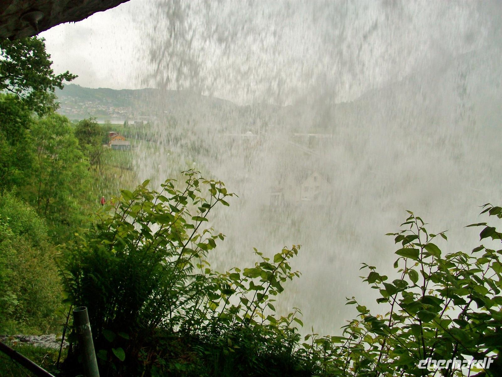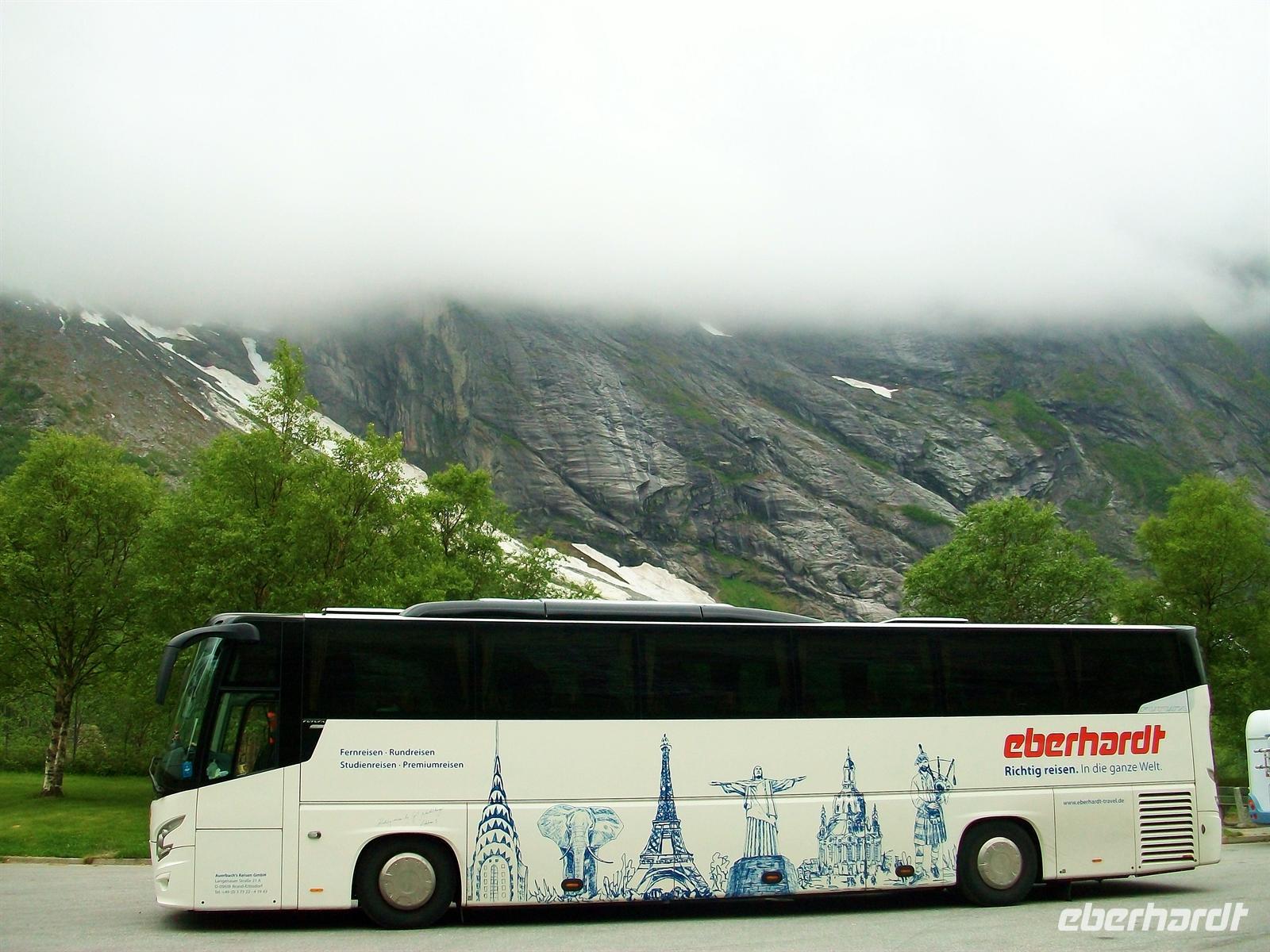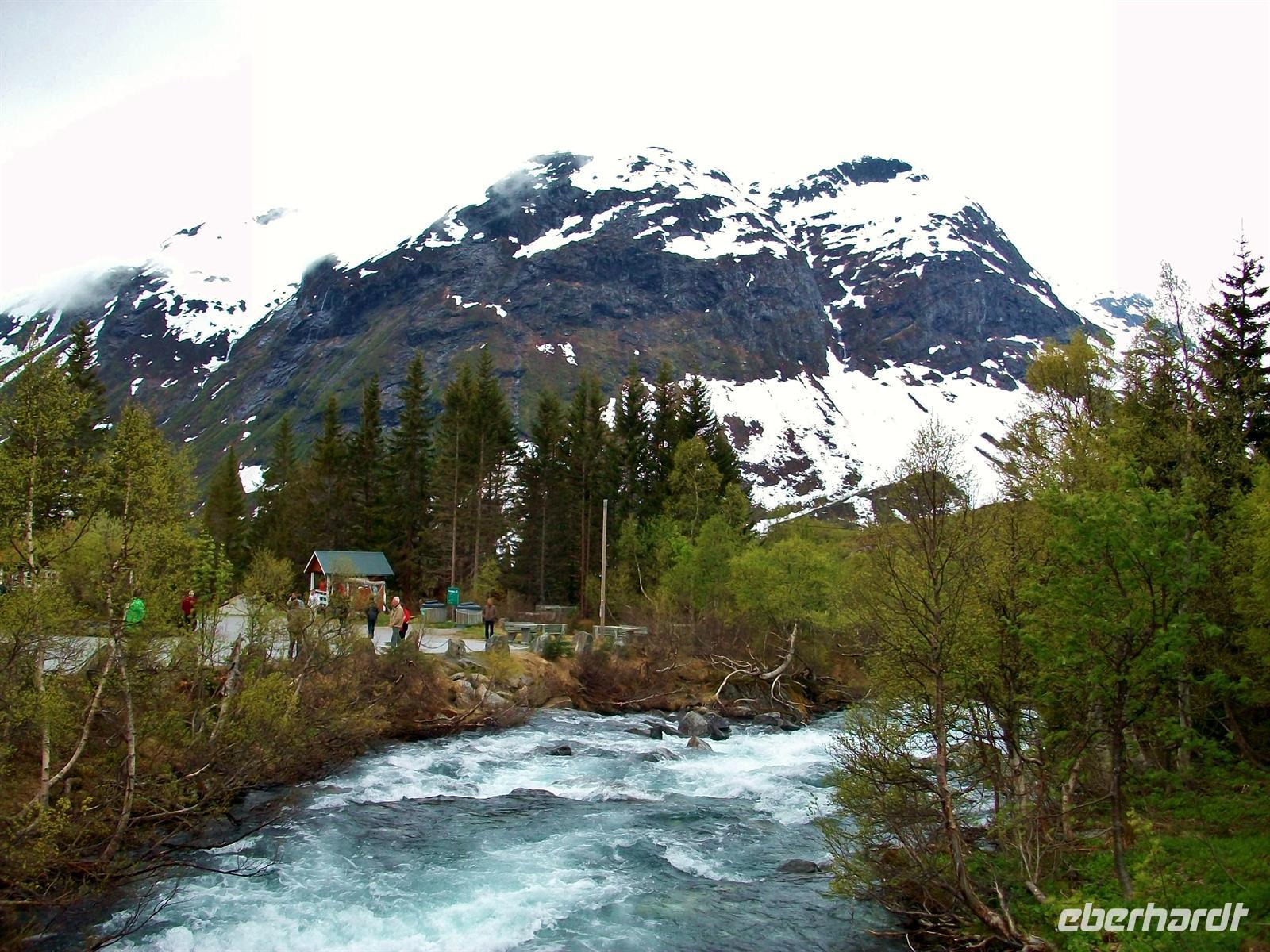 Gegen elf verlassen wir die Stadt Bergen. Bald sind wir dem Trubel der Metropole entronnen und erneut in der einmaligen Landschaft Norwegens unterwegs. Gegen halb eins haben wir einen weiteren Wasserfall erreicht, den Steindalfossen. Die Besonderheit dieses Falls ist das man hinter den Fall gehen kann ohne nass zu werden. Das Wasser fällt über einen Felsvorsprung, dahinter führt ein Weg entlang und man kann buchstäblich durch den Schleier des fallenden Wassers hindurchsehen. Nur schemenhaft erscheint dabei Straße und Bus. Wir nutzen die Zeit noch für einen kleinen Mittagsimbiss aber eine halbe Stunde später sind wir schon wieder unterwegs, unser Ziel ist noch weit.