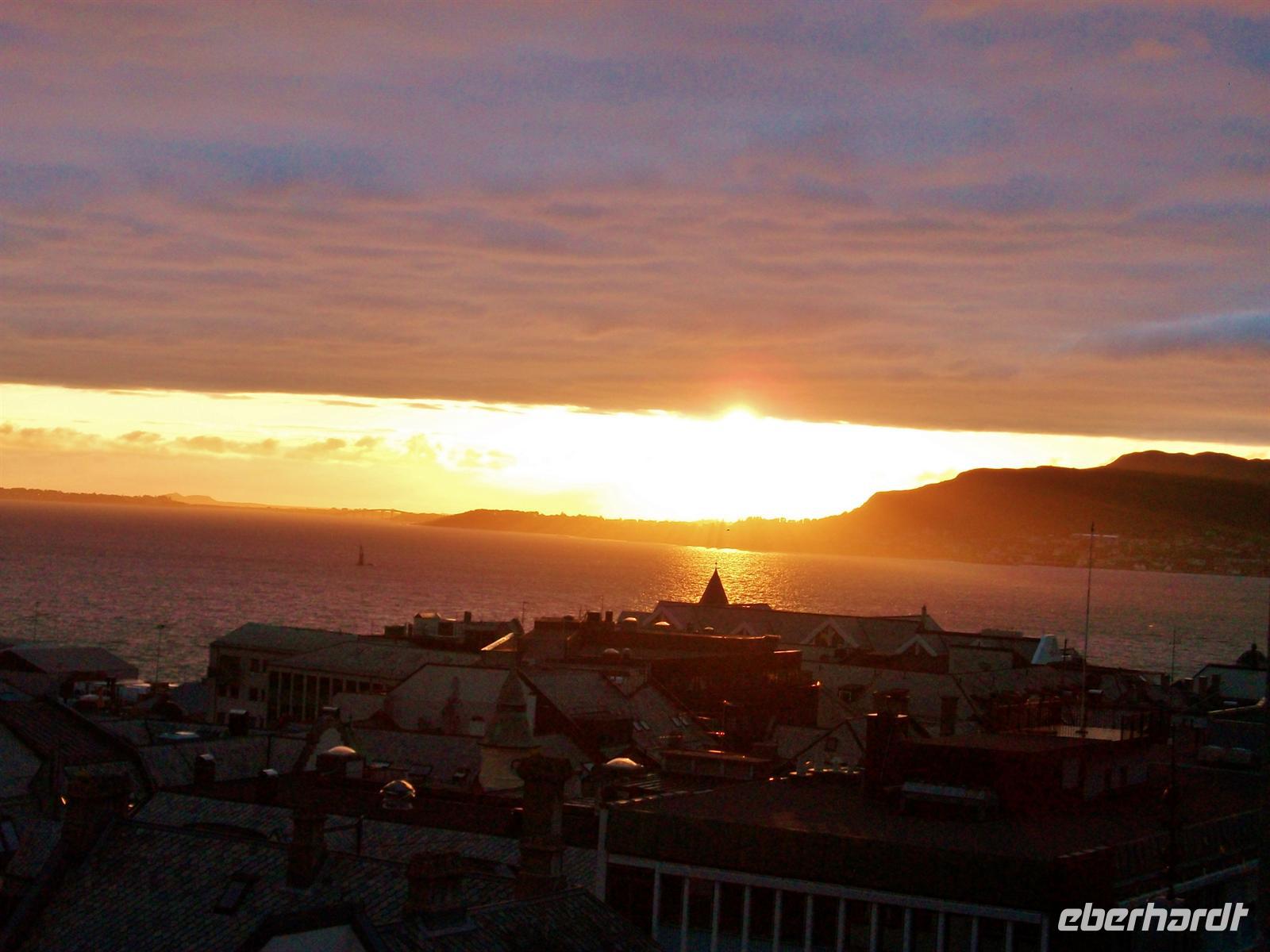 Mit einem Blick aus dem Hotelzimmer zum Ozean in dessen Wasser gerade die Sonne eintaucht und dabei ein rotes Licht an die Berge zaubert, geht dieser einmalige Tag zu Ende.
