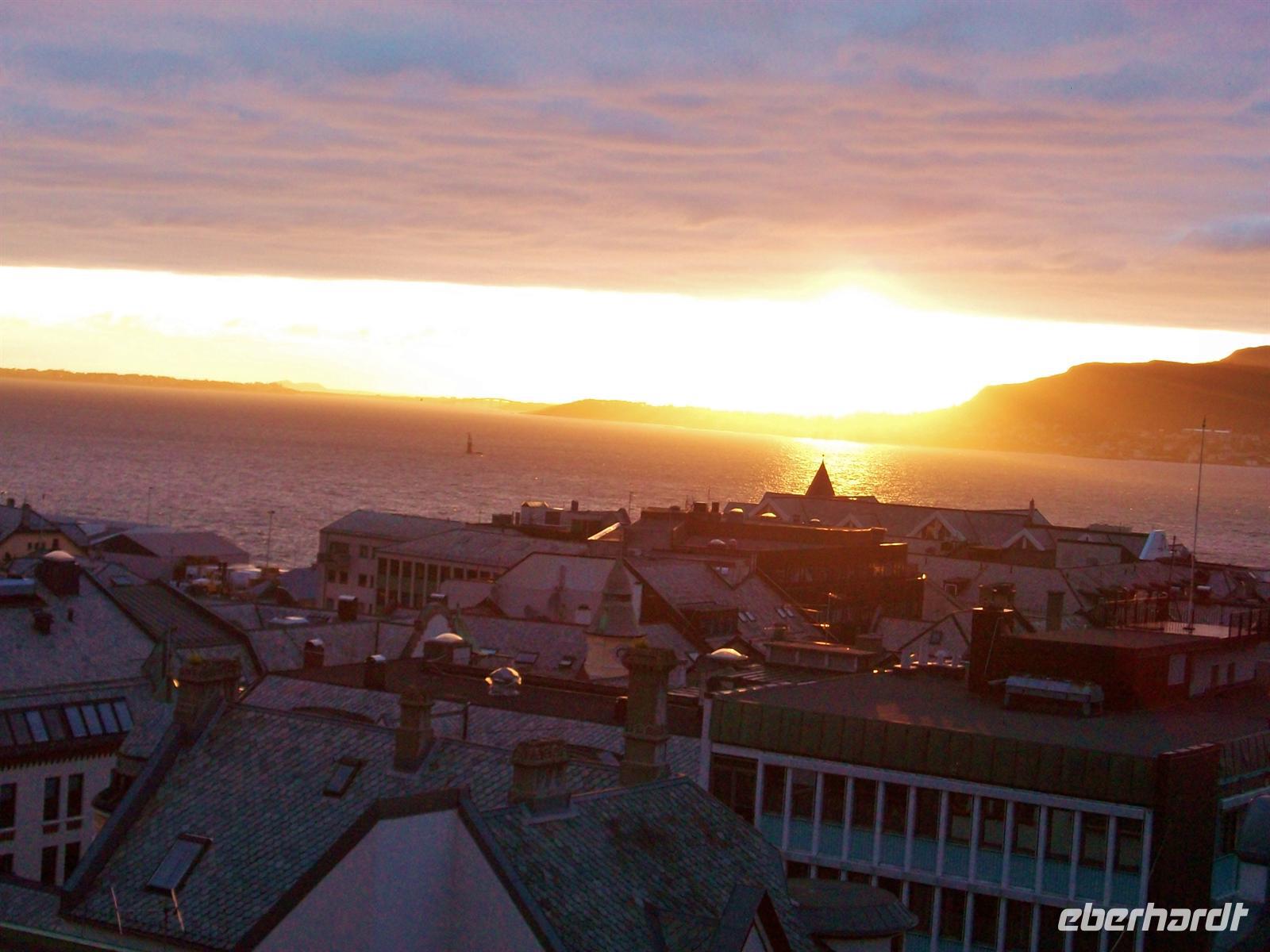 Kurz nach sieben kommen wir am Hotel in Molde an und von unseren Zimmern haben wir einen Blick auf dieses einmalige Panorama, auf das später die Sonne einmalige Lichtreflexe zaubert.
