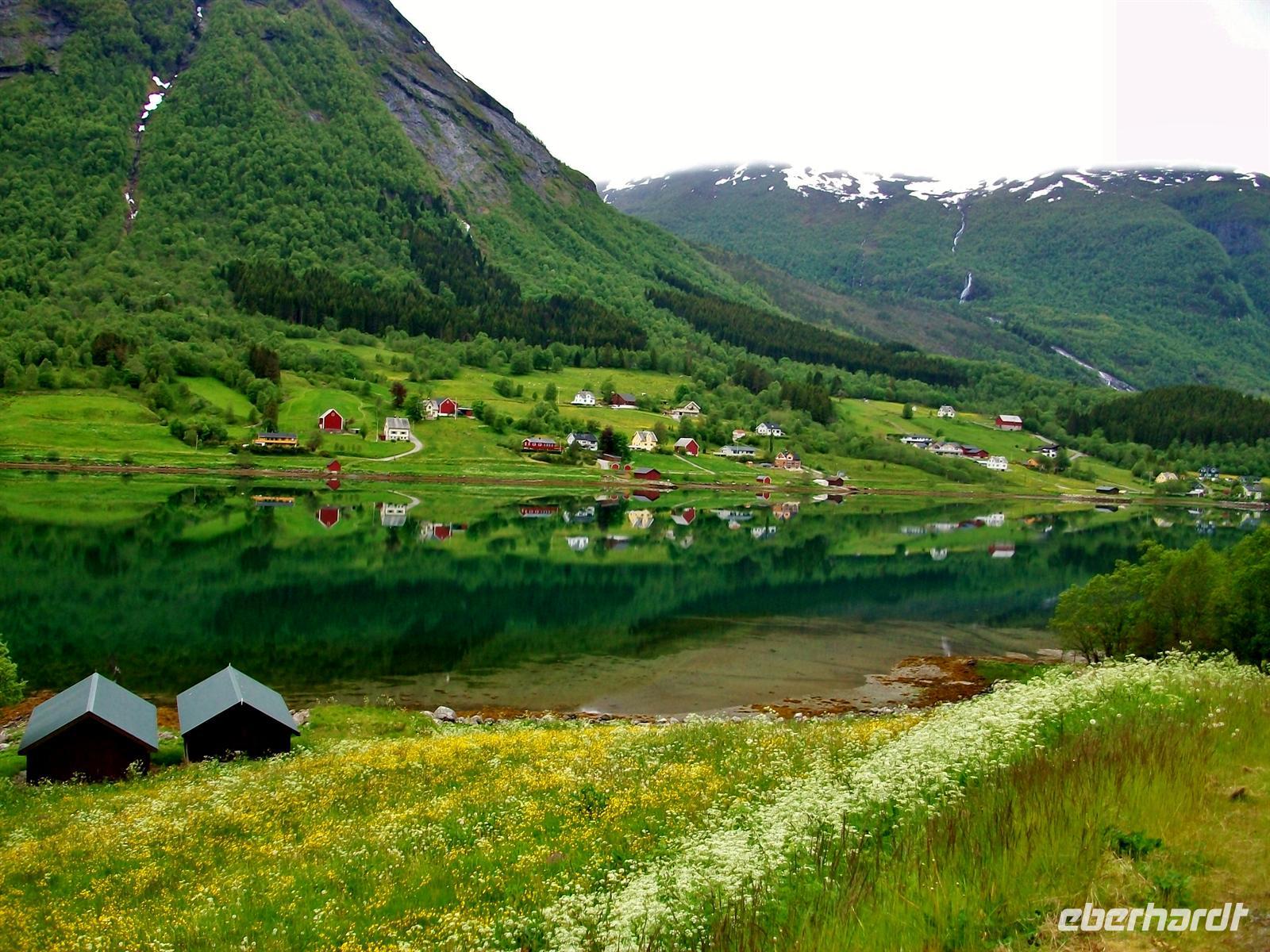 Die weitere Fahrt führt uns zum Hardangerfjord. Hier nun das gewohnte Bild was den Betrachter immer wieder fasziniert: von einer ruhigen Wasserfläche steigen die grünen Erhebungen steil nach oben, an den oberen Spitzen haben sich die Wolken festgehangen.