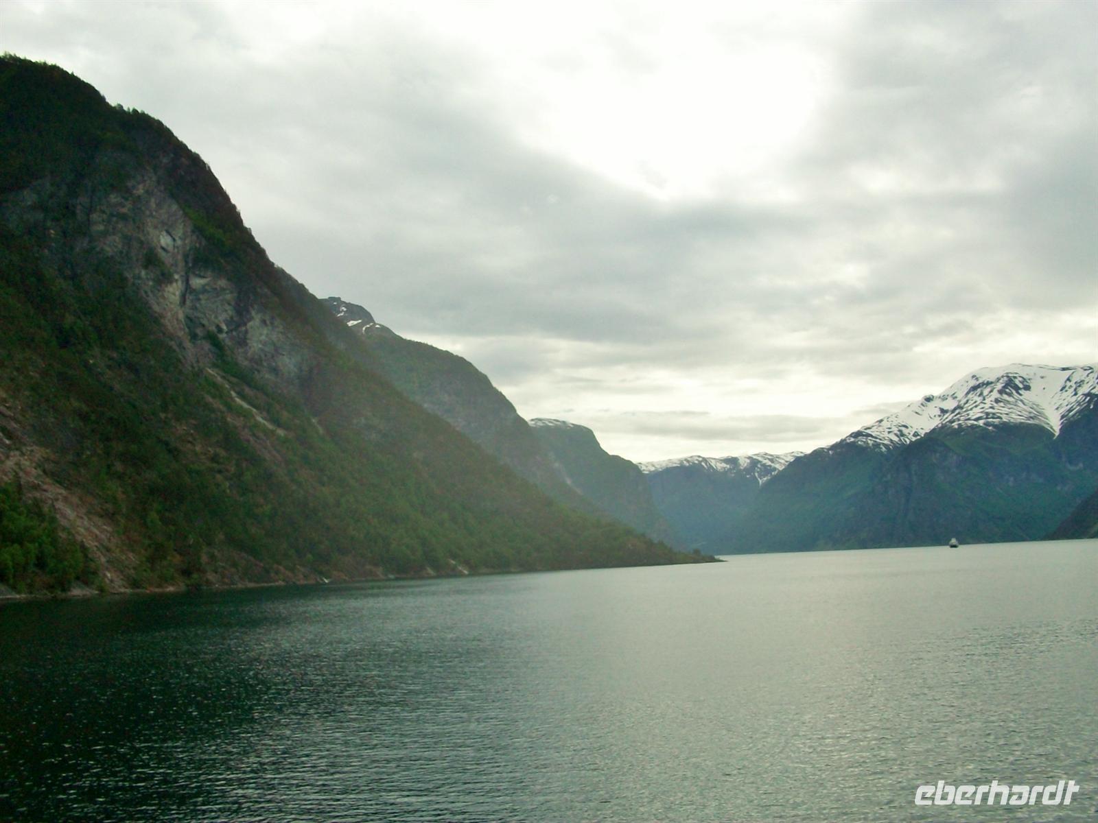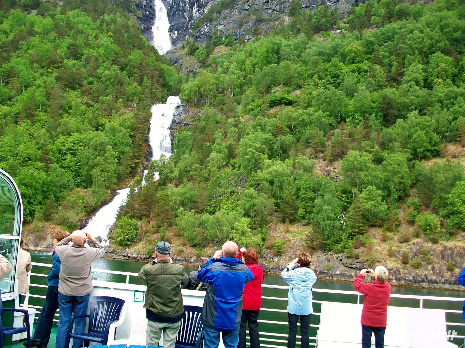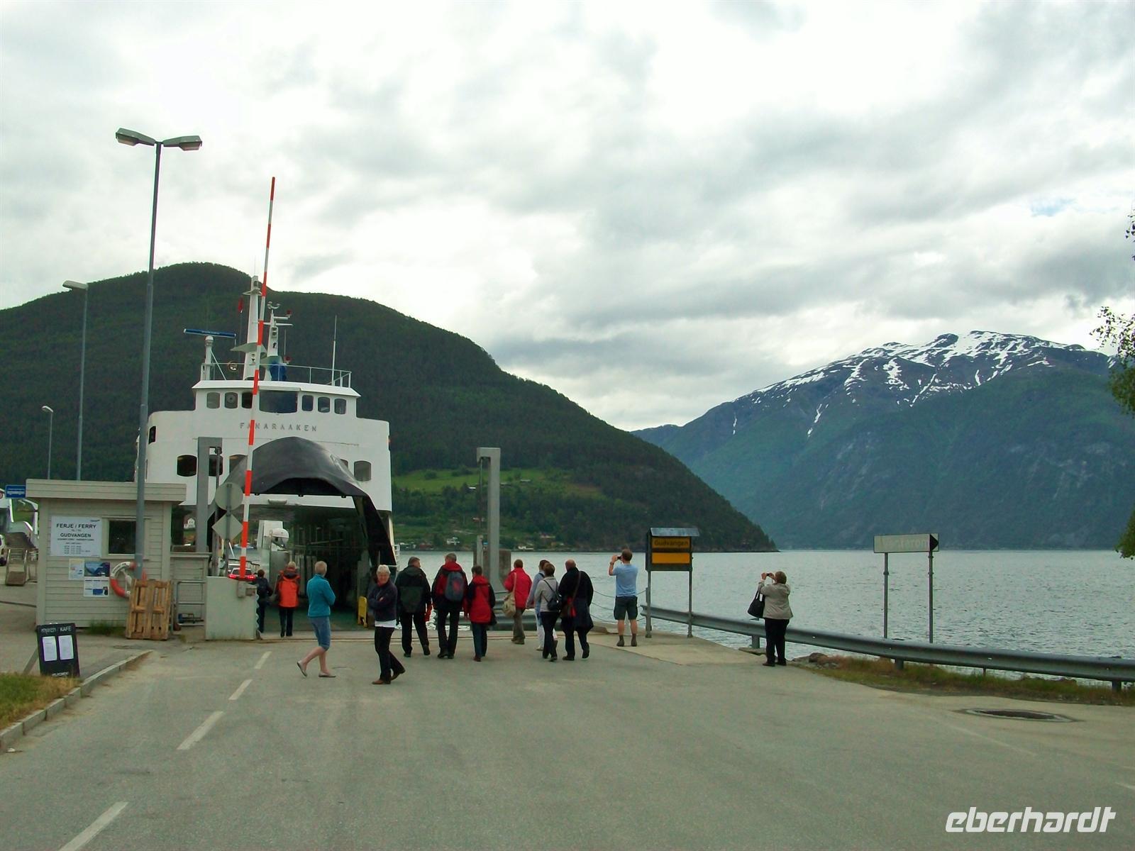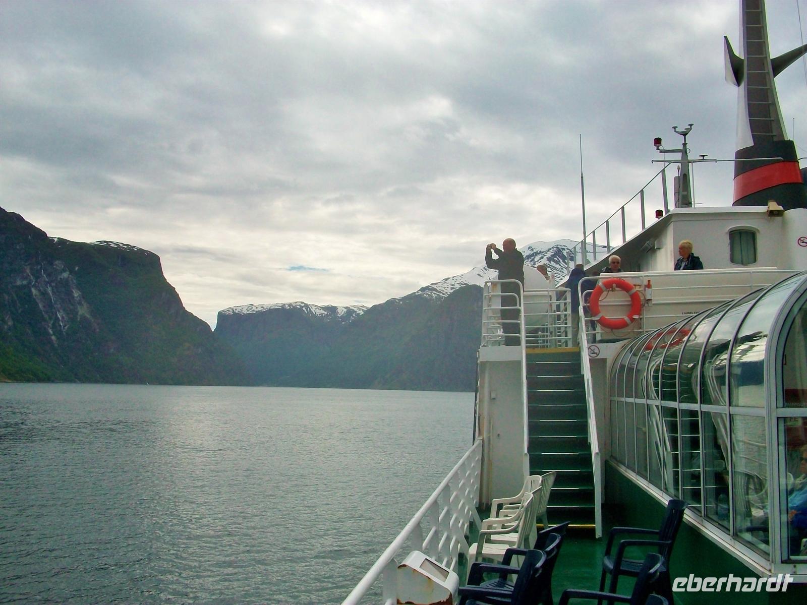 In Kaupanger angekommen bieten wir unseren Gästen einen kleinen Imbiss und kurz vor zwölf betreten wir das Schiff, jeder sucht sich einen schönen Platz um in den nächsten gut zwei Stunden einen der beeindruckendsten Fjorde Norwegens kennen zu lernen: den Sognefjord. Nach dem Ablegen des Schiffes sind wir zwischen den gigantischen Erhebungen des Fjords unterwegs; die Berge steigen unmittelbar vom Wasser auf und man muss schon den Kopf in den Nacken legen um die oberen Spitzen zu sehen. Zahlreiche Wasserfälle senden ihr Nass hunderte Meter abwärts, schäumend tost die Last zu Tal.