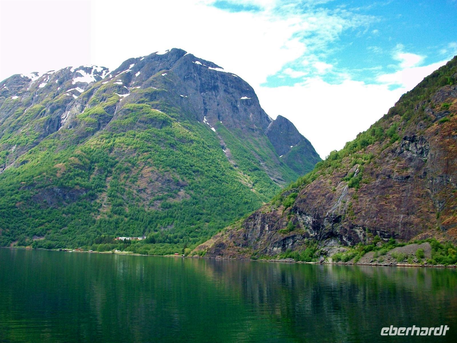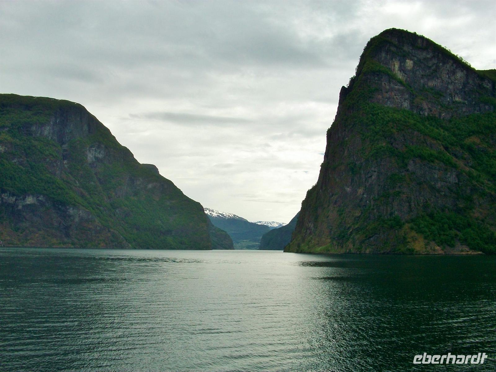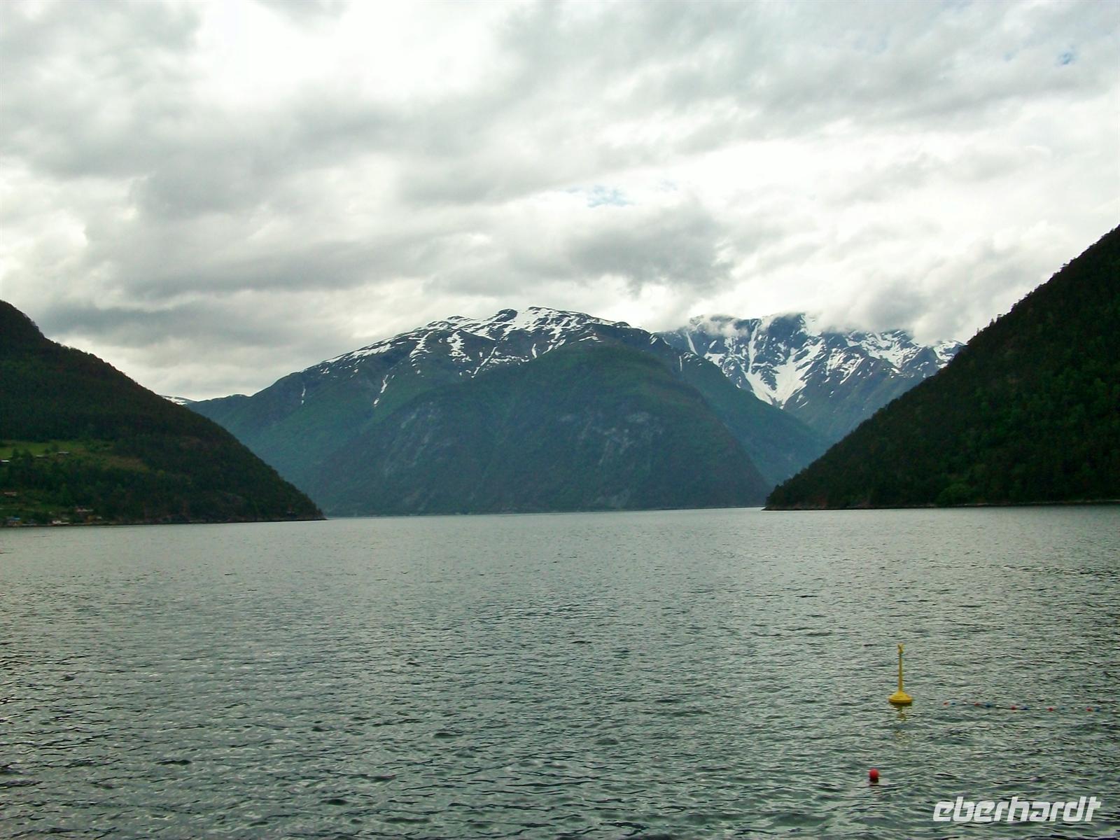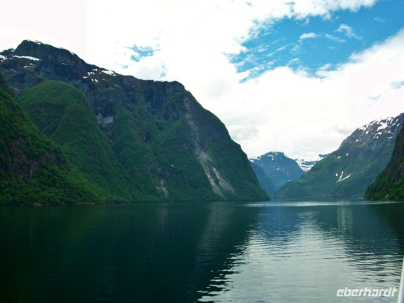 In Kaupanger angekommen bieten wir unseren Gästen einen kleinen Imbiss und kurz vor zwölf betreten wir das Schiff, jeder sucht sich einen schönen Platz um in den nächsten gut zwei Stunden einen der beeindruckendsten Fjorde Norwegens kennen zu lernen: den Sognefjord. Nach dem Ablegen des Schiffes sind wir zwischen den gigantischen Erhebungen des Fjords unterwegs; die Berge steigen unmittelbar vom Wasser auf und man muss schon den Kopf in den Nacken legen um die oberen Spitzen zu sehen. Zahlreiche Wasserfälle senden ihr Nass hunderte Meter abwärts, schäumend tost die Last zu Tal.