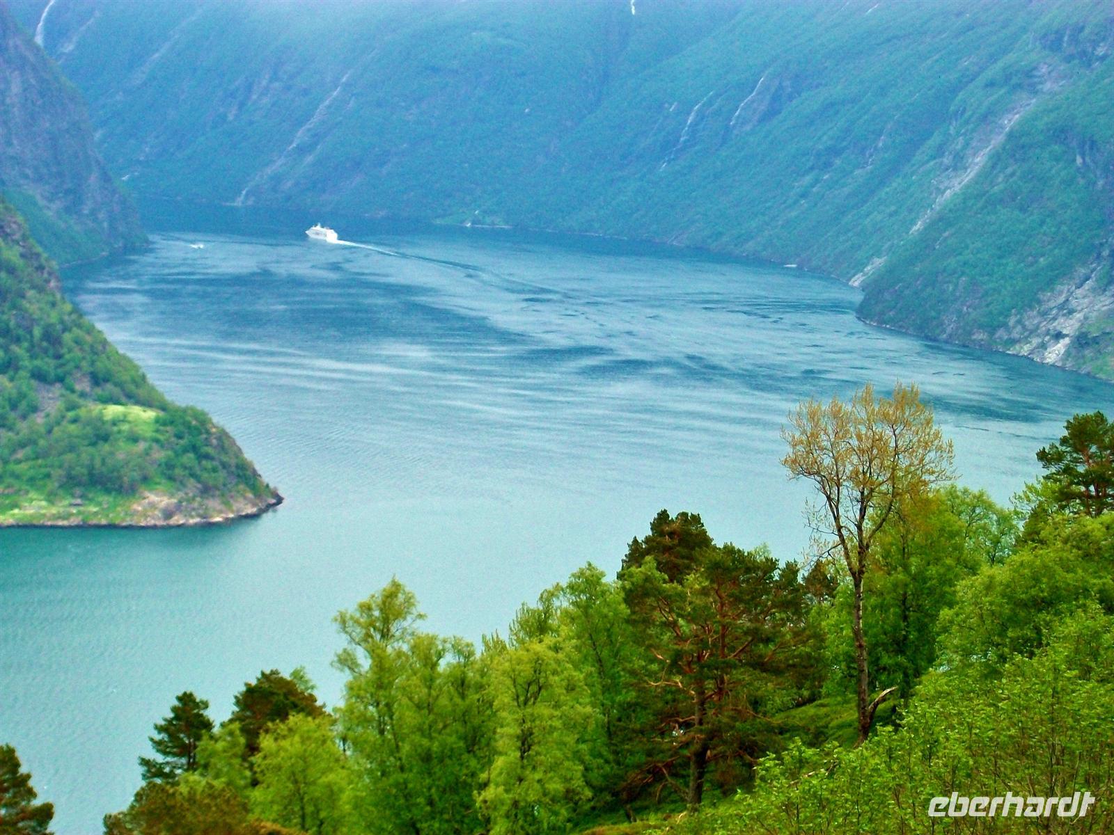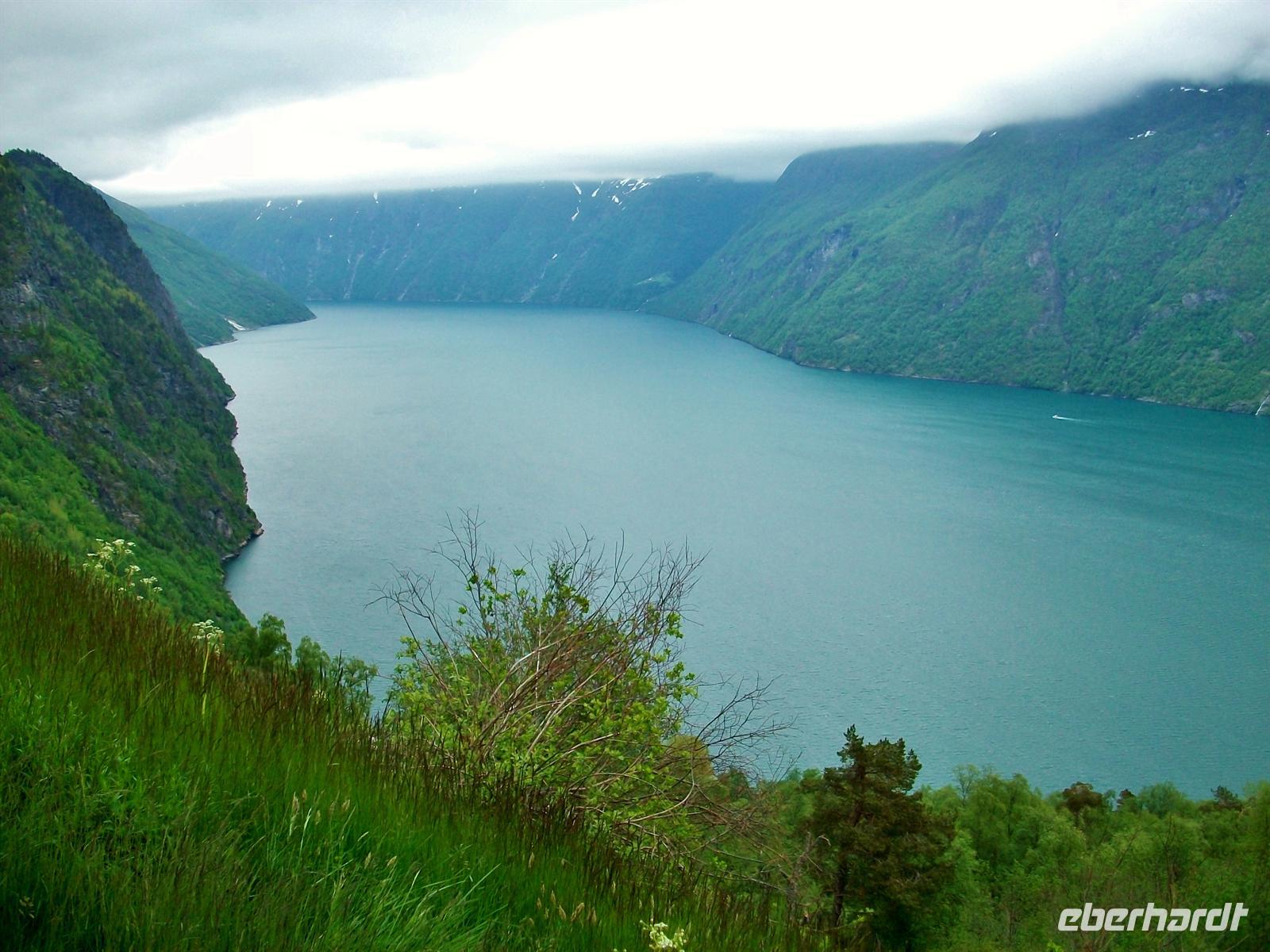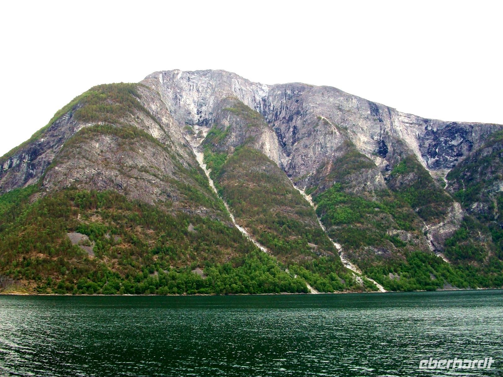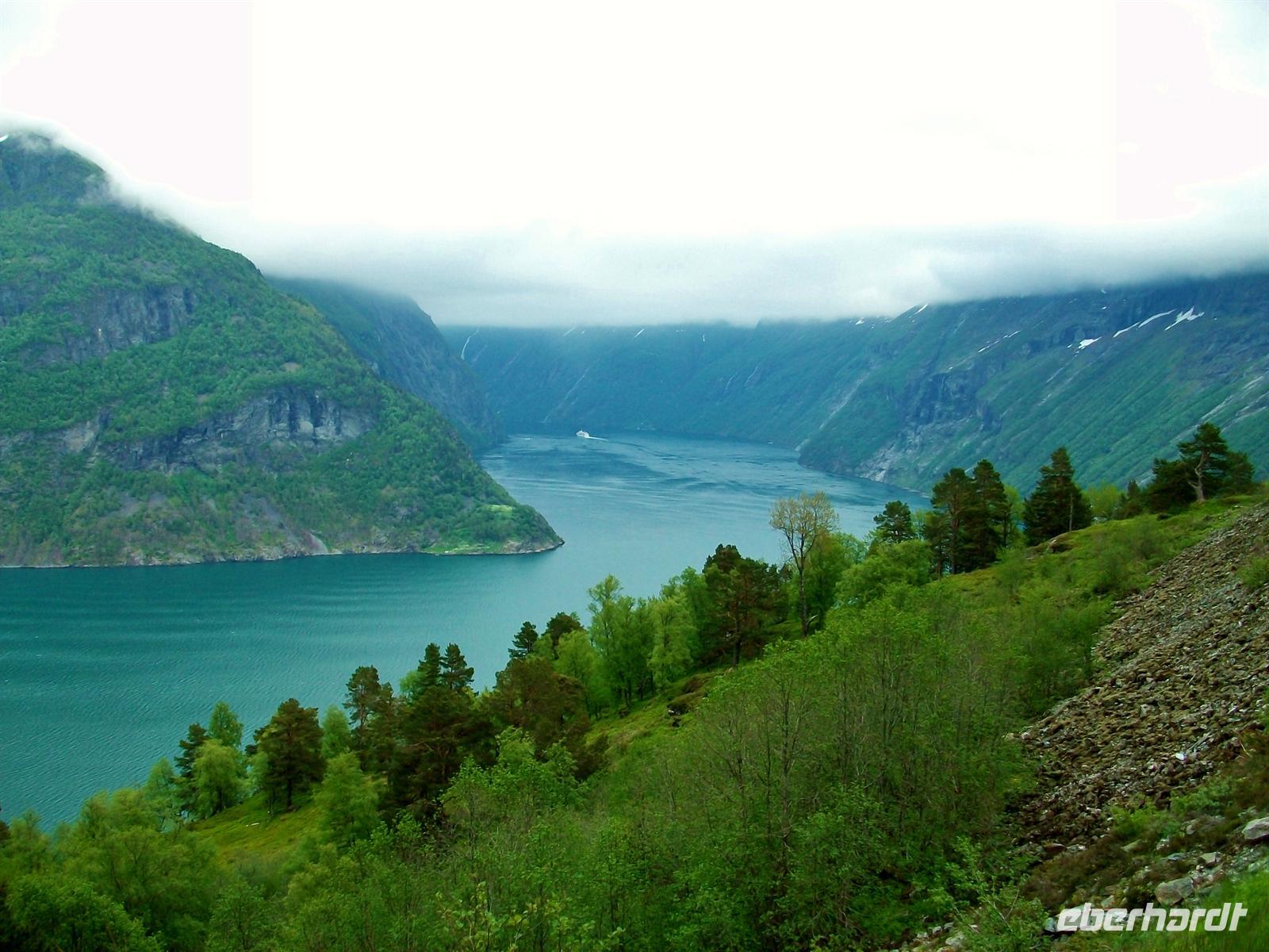 In Kaupanger angekommen bieten wir unseren Gästen einen kleinen Imbiss und kurz vor zwölf betreten wir das Schiff, jeder sucht sich einen schönen Platz um in den nächsten gut zwei Stunden einen der beeindruckendsten Fjorde Norwegens kennen zu lernen: den Sognefjord. Nach dem Ablegen des Schiffes sind wir zwischen den gigantischen Erhebungen des Fjords unterwegs; die Berge steigen unmittelbar vom Wasser auf und man muss schon den Kopf in den Nacken legen um die oberen Spitzen zu sehen. Zahlreiche Wasserfälle senden ihr Nass hunderte Meter abwärts, schäumend tost die Last zu Tal.