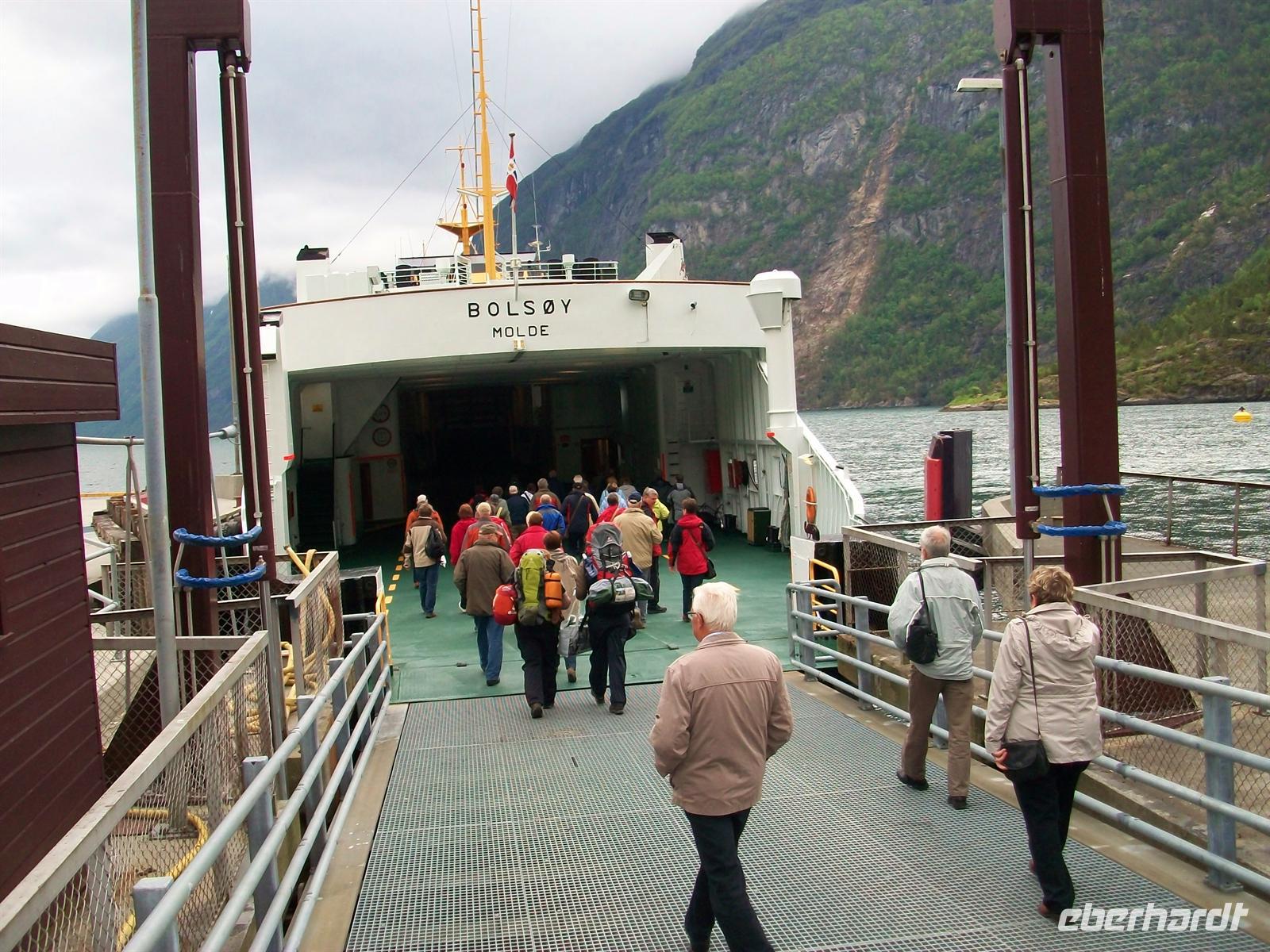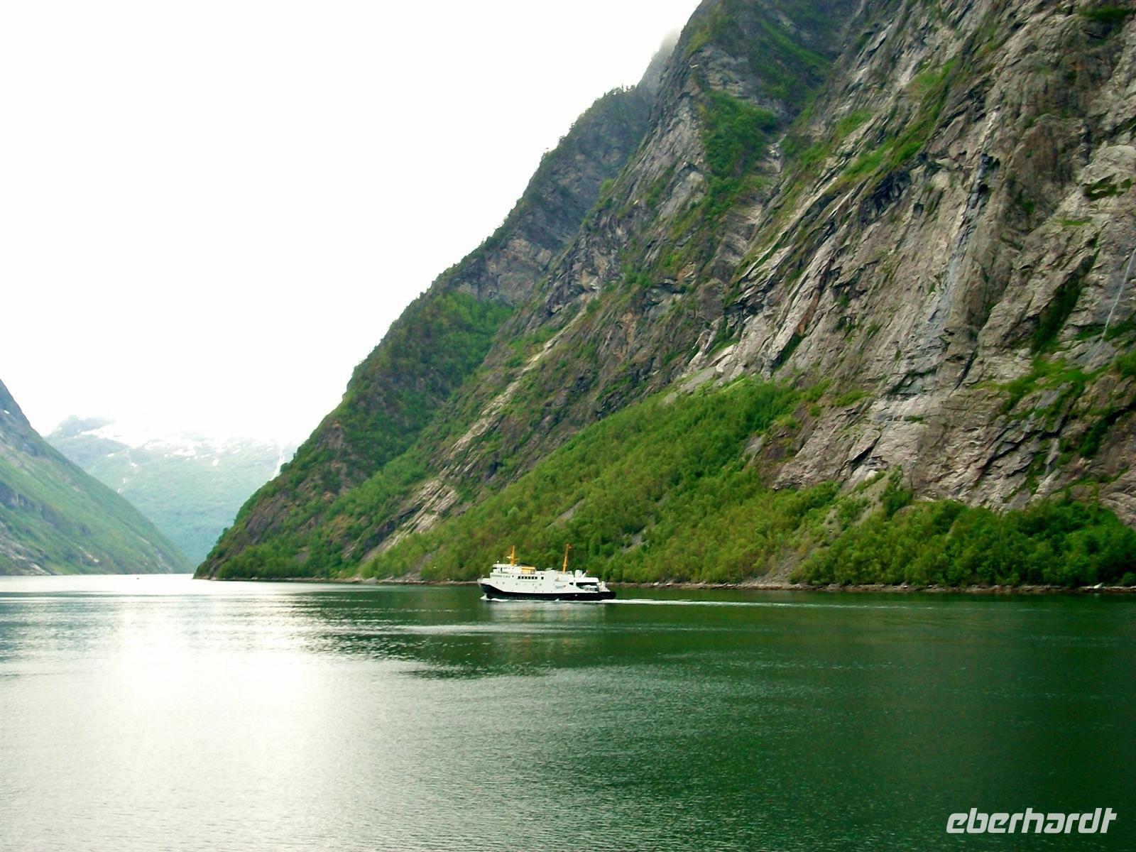 Gegen 8.45 Uhr treffen wir in Magerholm ein, von hier geht es auf die Fähre und dann gleich weiter zwischen viel Wasser entlang. Unser erstes Ziel für heute heißt Hellesylt hier beginnt gegen Mittag die Schifffahrt auf einem der eindrucksvollsten Fjorde Norwegens.