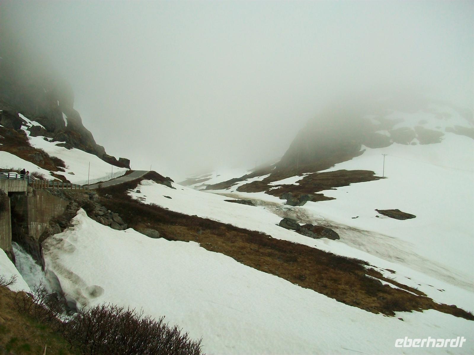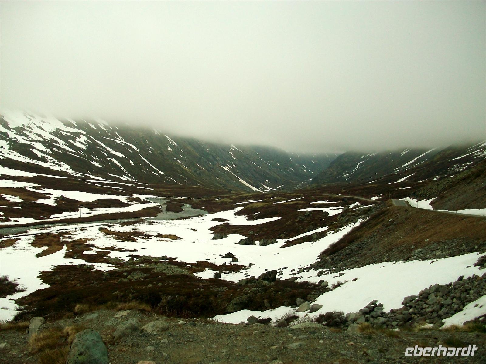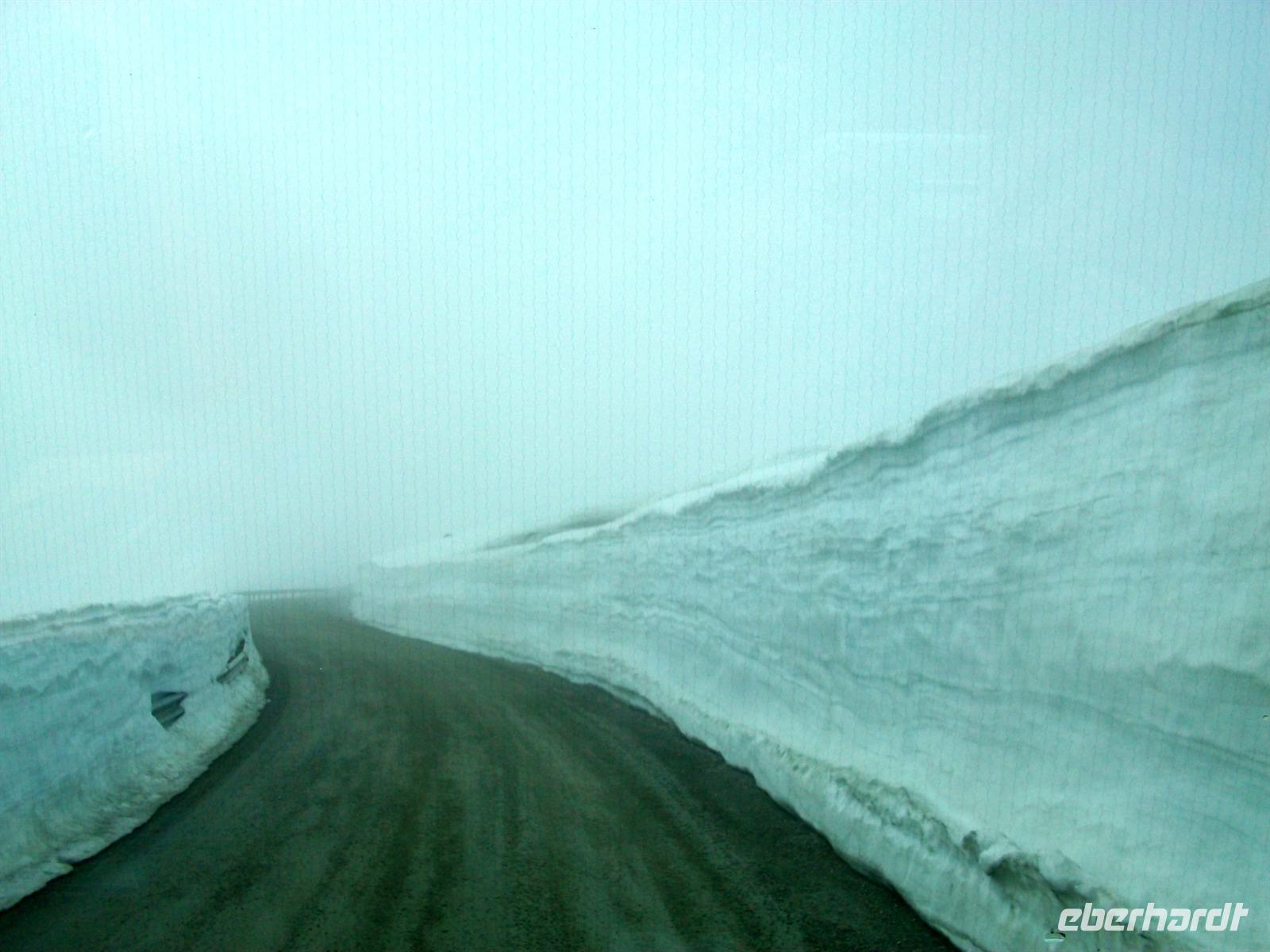 Kaum ein Gedanke kann vollendet werden als wie von Geisterhand die Nebel zerteilt werden und die Sonne sich als milchige Scheibe ihre Bahn bricht. Umgeben von meterhohen Schneewänden sind wir im tiefsten Winter angelangt, so urplötzlich als hätte einer der Trolle uns in diese Jahreszeit hineingezaubert. Ein kühles Lüftchen treibt kleine Nebelwirbel über die Straße- die mystische Impression ist perfekt.