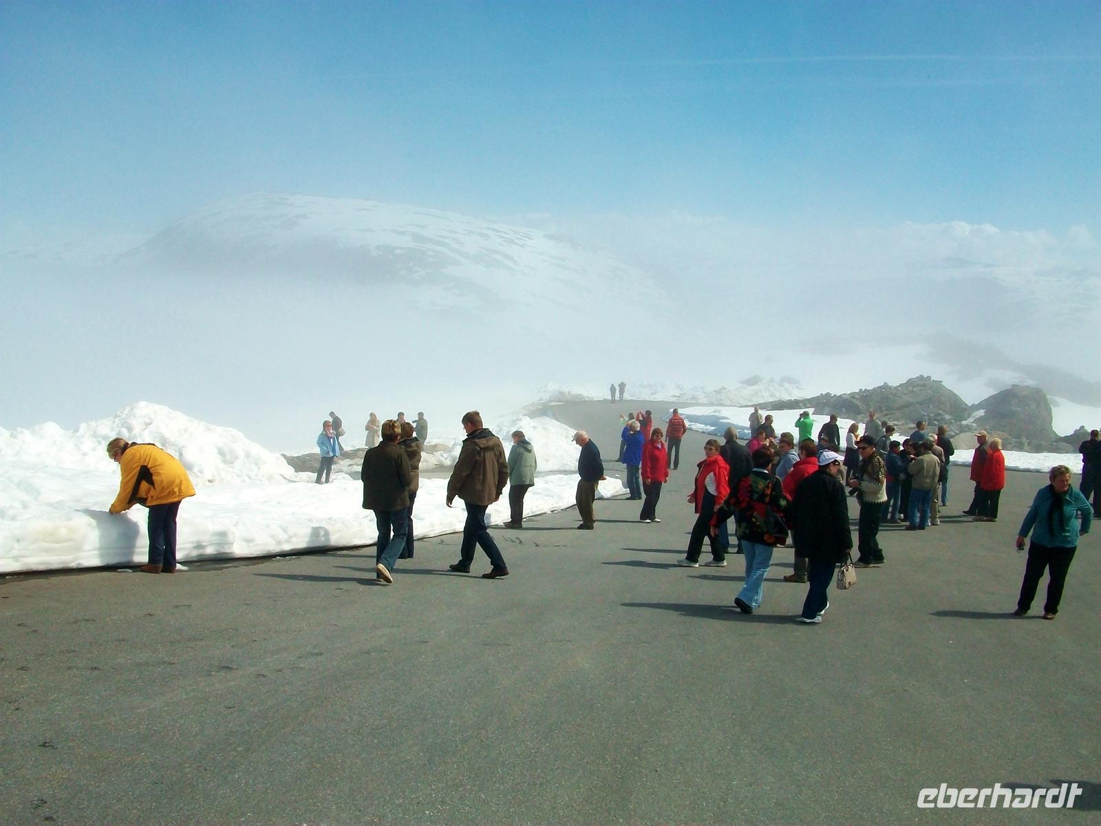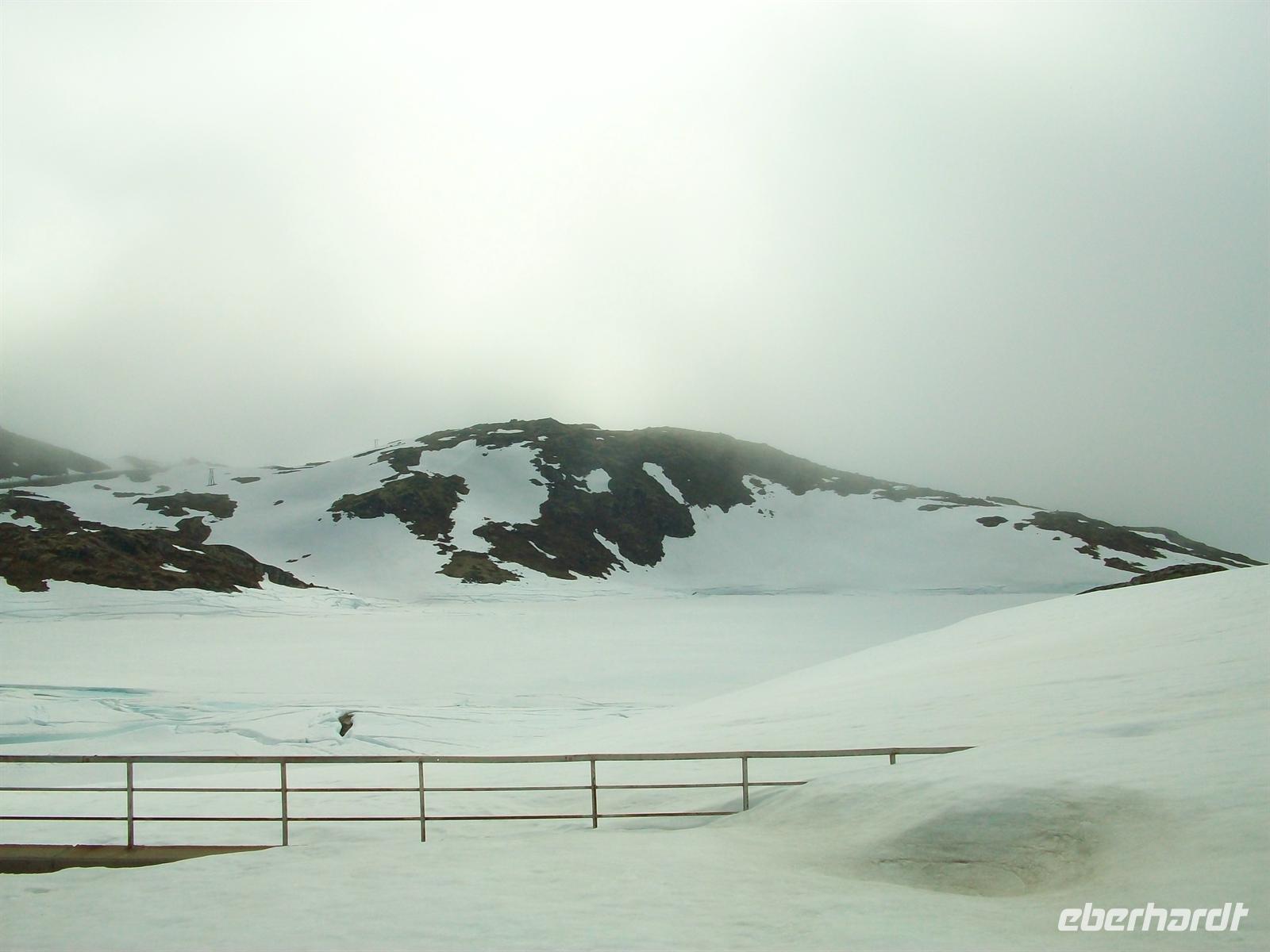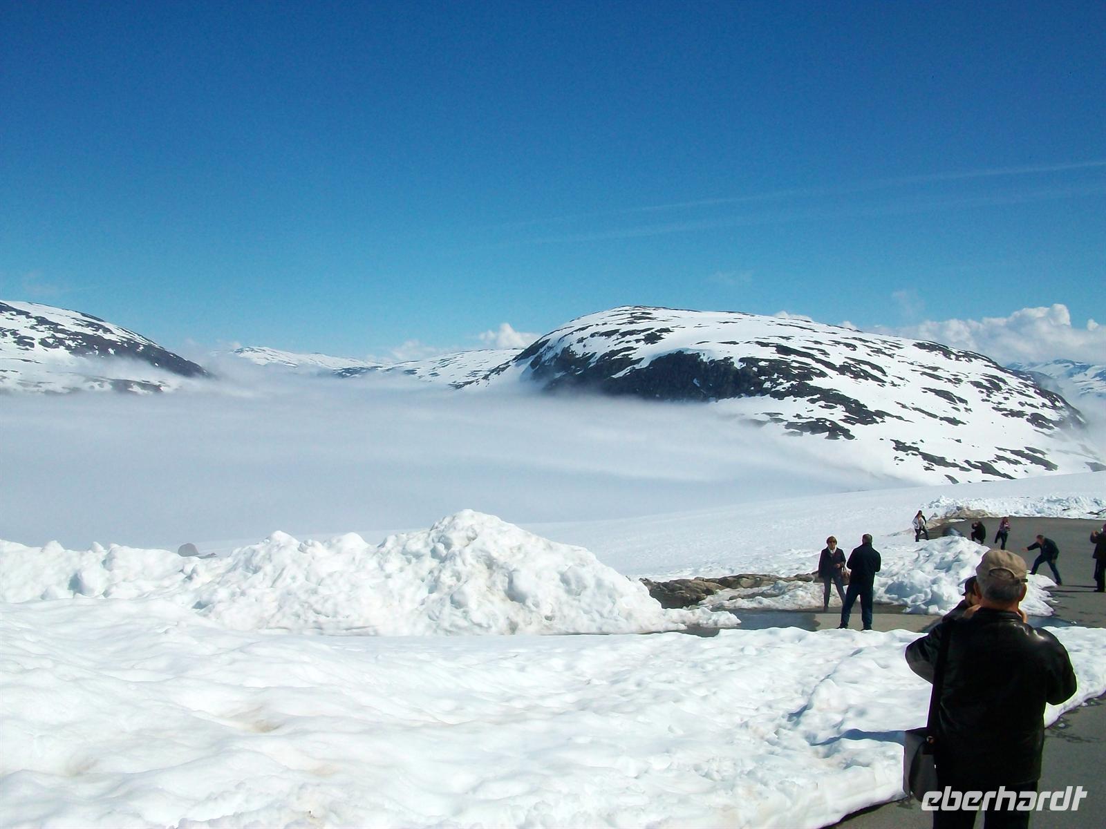 Kaum ein Gedanke kann vollendet werden als wie von Geisterhand die Nebel zerteilt werden und die Sonne sich als milchige Scheibe ihre Bahn bricht. Umgeben von meterhohen Schneewänden sind wir im tiefsten Winter angelangt, so urplötzlich als hätte einer der Trolle uns in diese Jahreszeit hineingezaubert. Ein kühles Lüftchen treibt kleine Nebelwirbel über die Straße- die mystische Impression ist perfekt.
