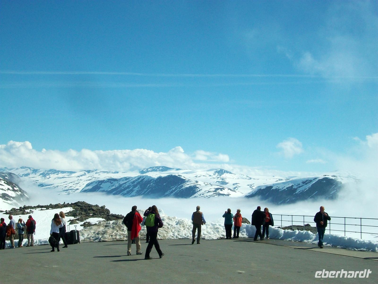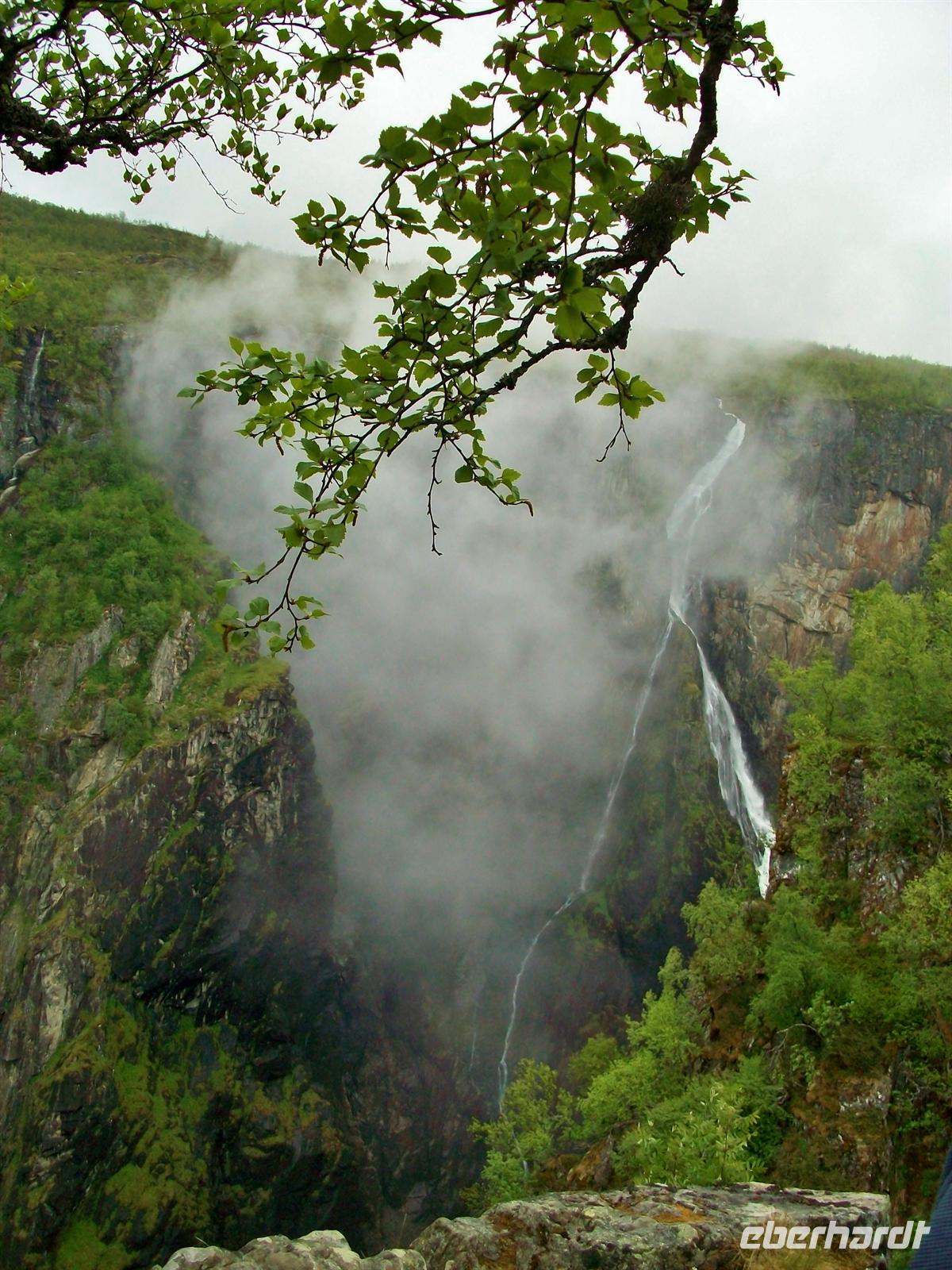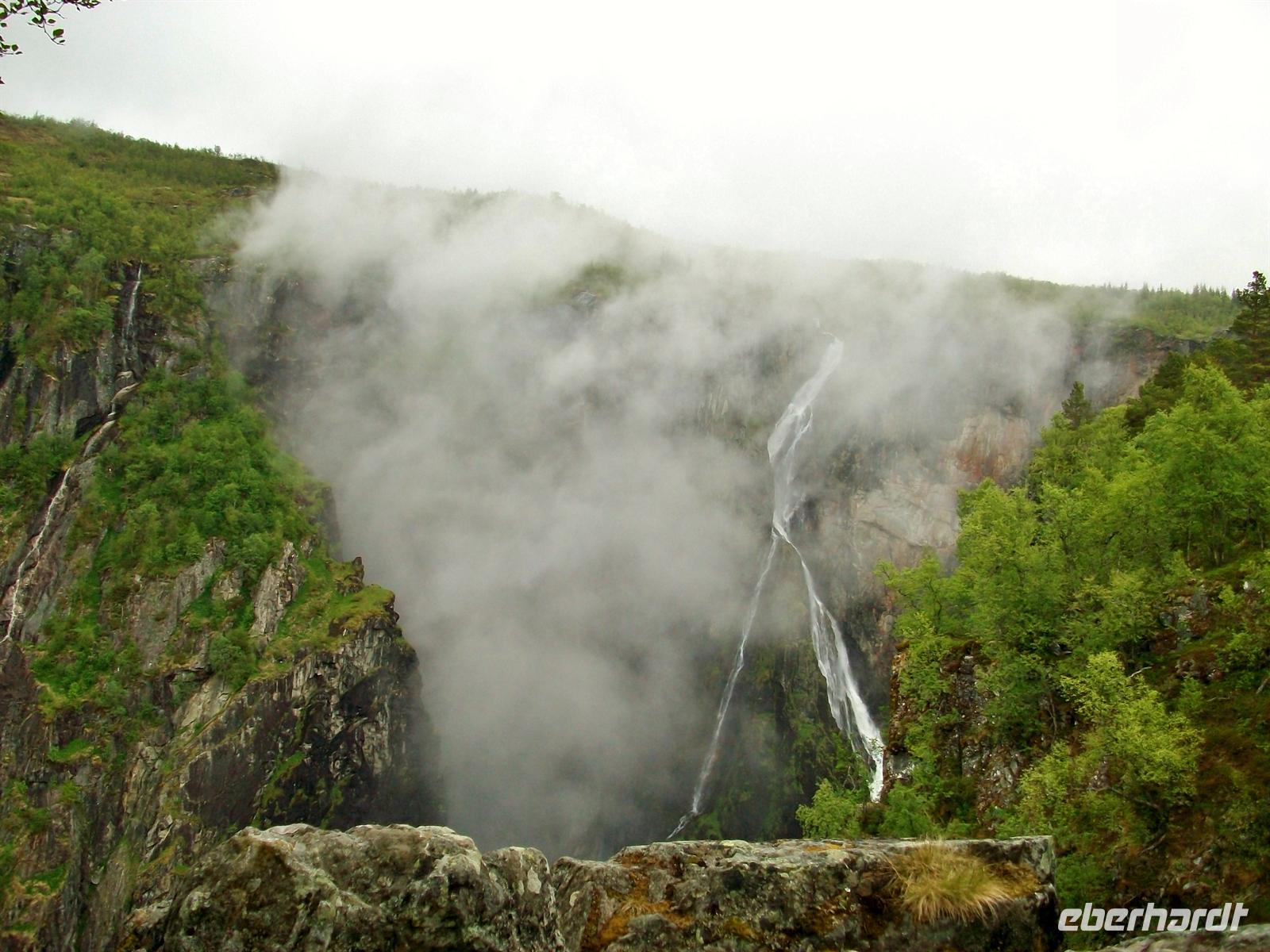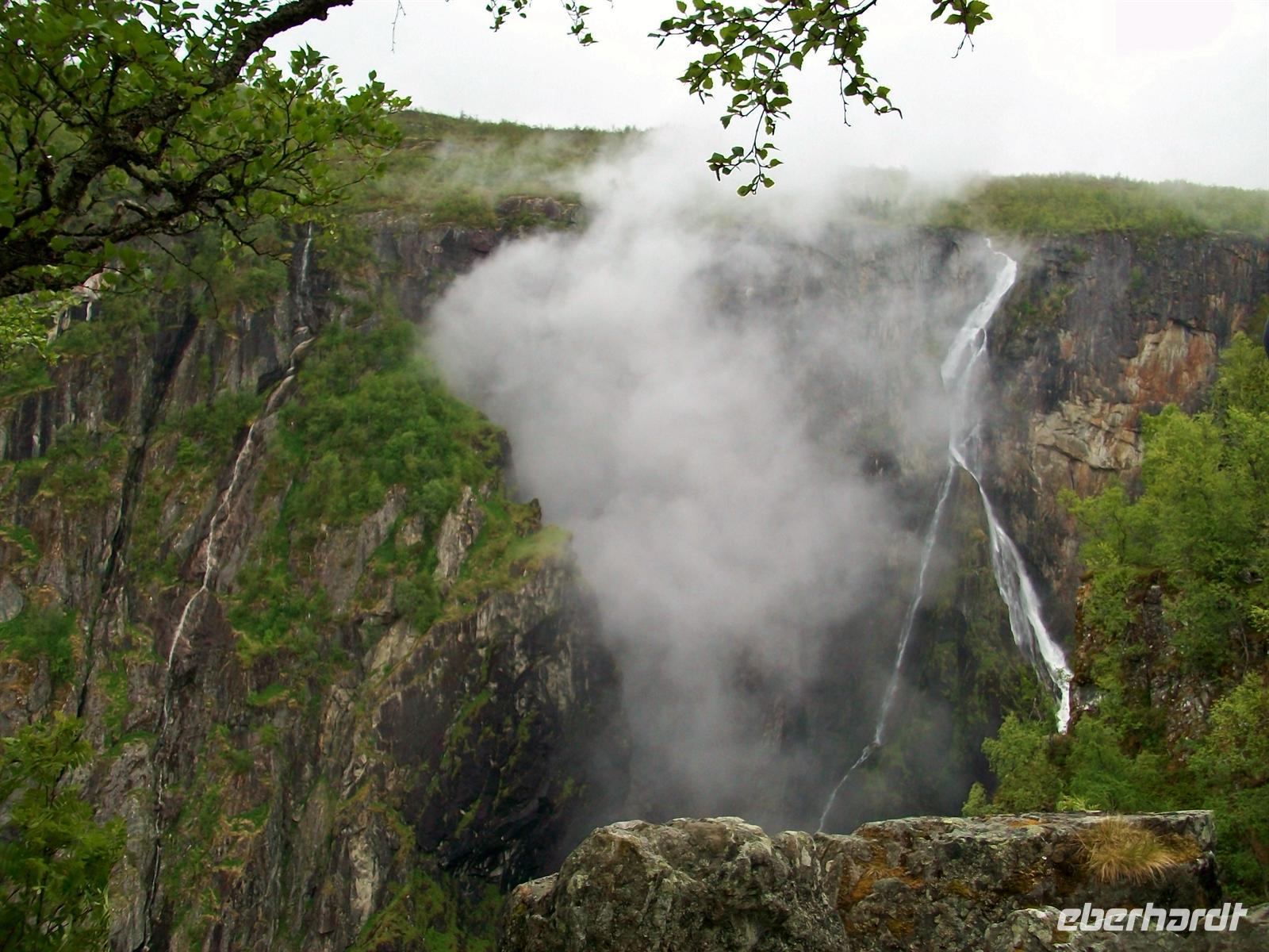 Dann geht es aufwärts, in Serpentinen die sich teilweise in Tunnels entlangschlängeln gewinnen wir an Höhe. Das Tal wird immer kleiner als wir plötzlich vor uns eine gigantische Staubwolke sehen. Sie ist so groß das sie die dahinter liegenden Berge verdeckt und wir uns staunend die Frage stellen: was mag das wohl sein? Wir müssen auch nicht lange auf die Antwort warten, es ist der Staub von Millionen Wassertröpfchen die aufgewirbelt werden vom Vøringsfossen, einem gigantischen Wasserfall der hier über hundert Meter zu Tal stürzt.