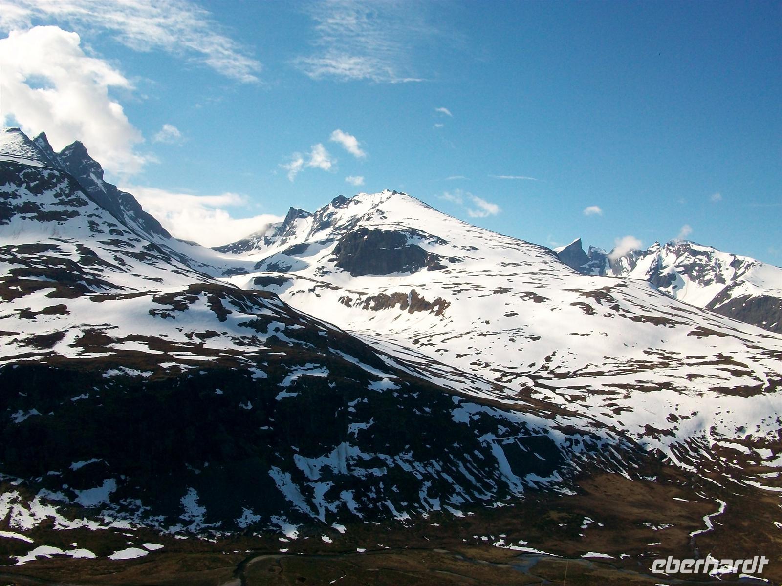 Dann reißen die Wolken vollends auf und beim nächsten Stopp haben wir einen uneingeschränkten Blick auf die gigantische Bergwelt. Das Auge kann sich dabei kaum satt sehen, aus grünen Tälern wachsen schneebedeckte Höhen empor, kleine Bäche fließen zu Tal, so manch einen kleinen See zu bilden. Feucht glitzern die Flächen der Hochmoore und über allen lacht die Sonne am blauen Himmel der sich zur Dekoration große weiße Wolken bestellt hat die wie Riesenkissen langsam auf ihrer Bahn ziehen. Es sind wirklich überwältigende Naturereignisse die wir heute wieder geboten bekommen und das Sognegebirge zählt mit zum Schönsten was Norwegen zu bieten hat.
