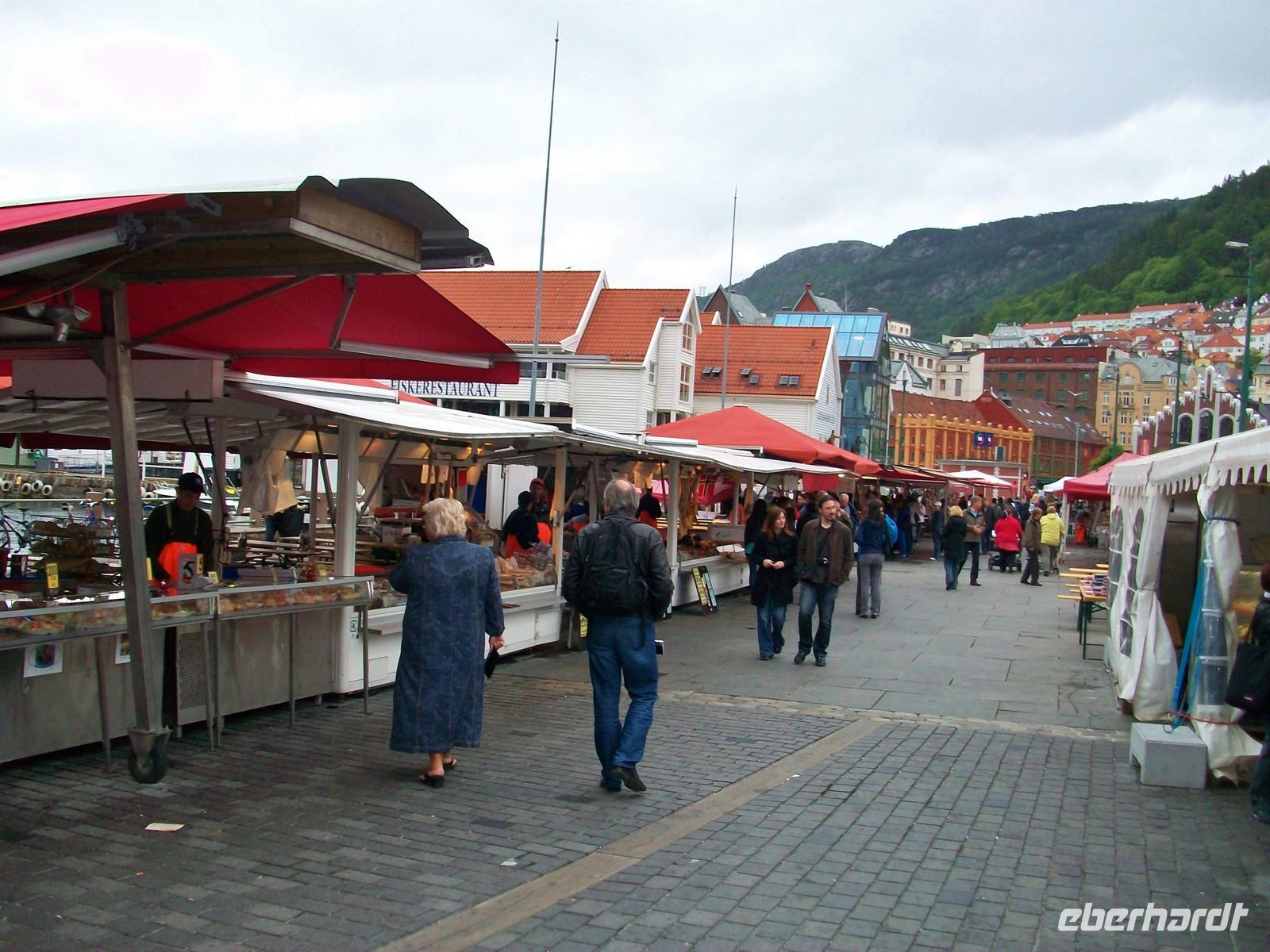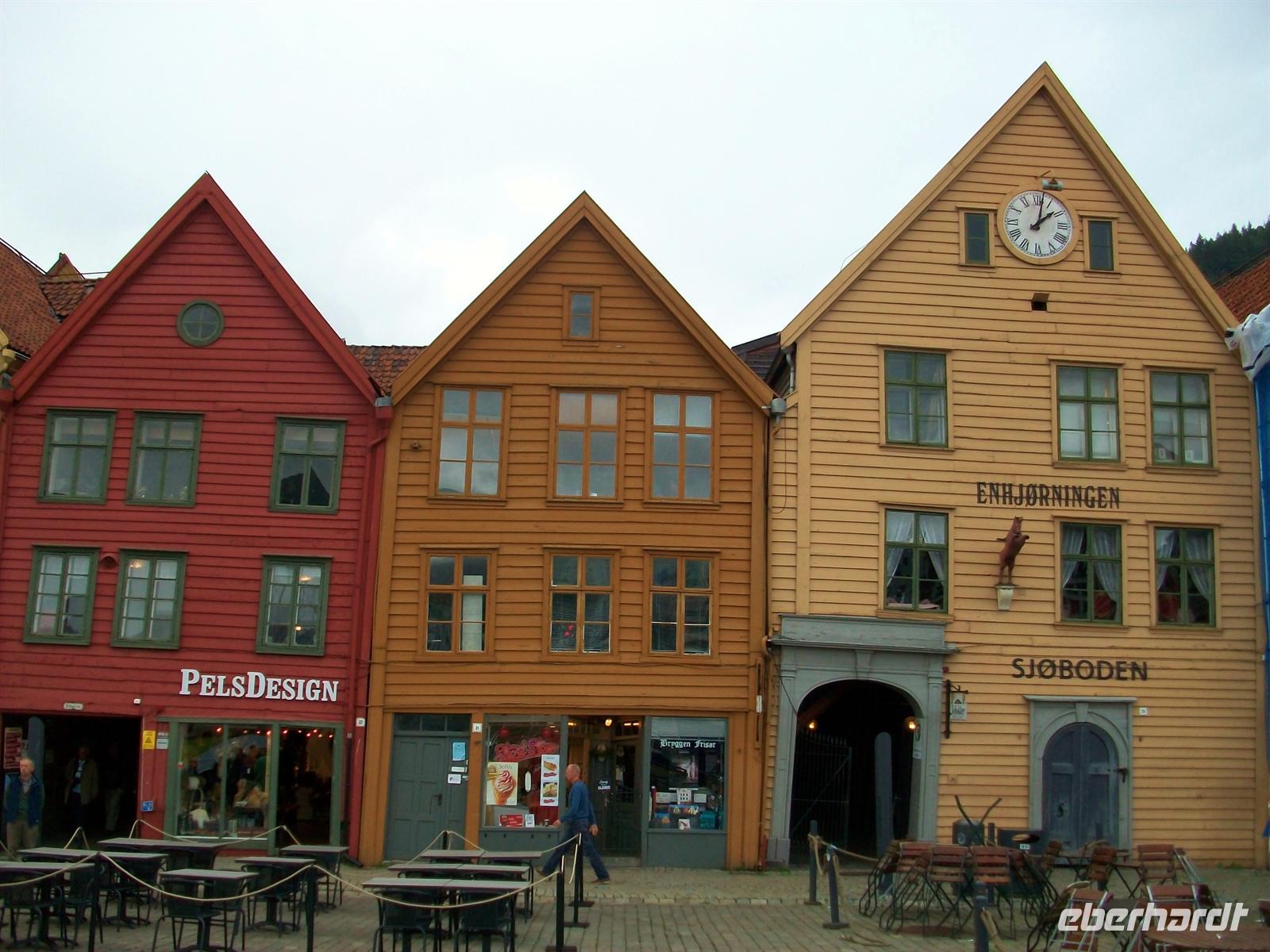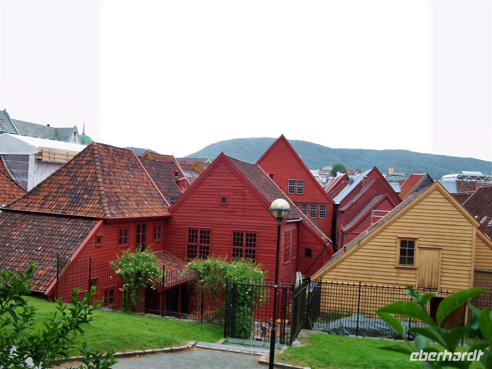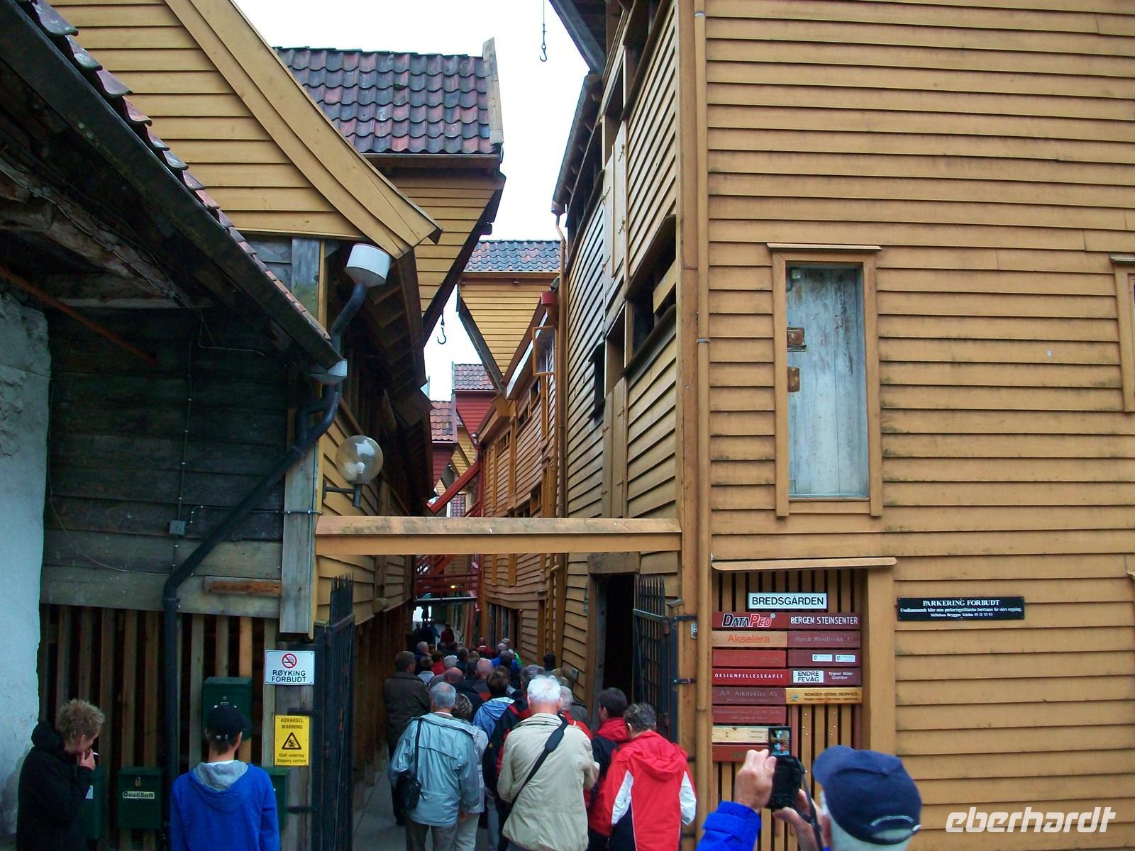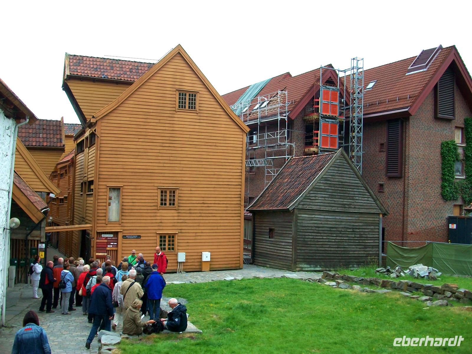 schönen Panoramablick. Dann geht es zum historischen Viertel Bryggen welches unter UNESCO- Schutz steht. Wir sehen die alten Holzhäuser deren Fassaden in den verschiedenen Farben prangen und wähnen uns in einer Zeit die längst vergangen ist. Einer Zeitreise gleich gehen wir durch die schmalen Gänge zwischen den Häusern und schauen in so manchen Hinterhof.