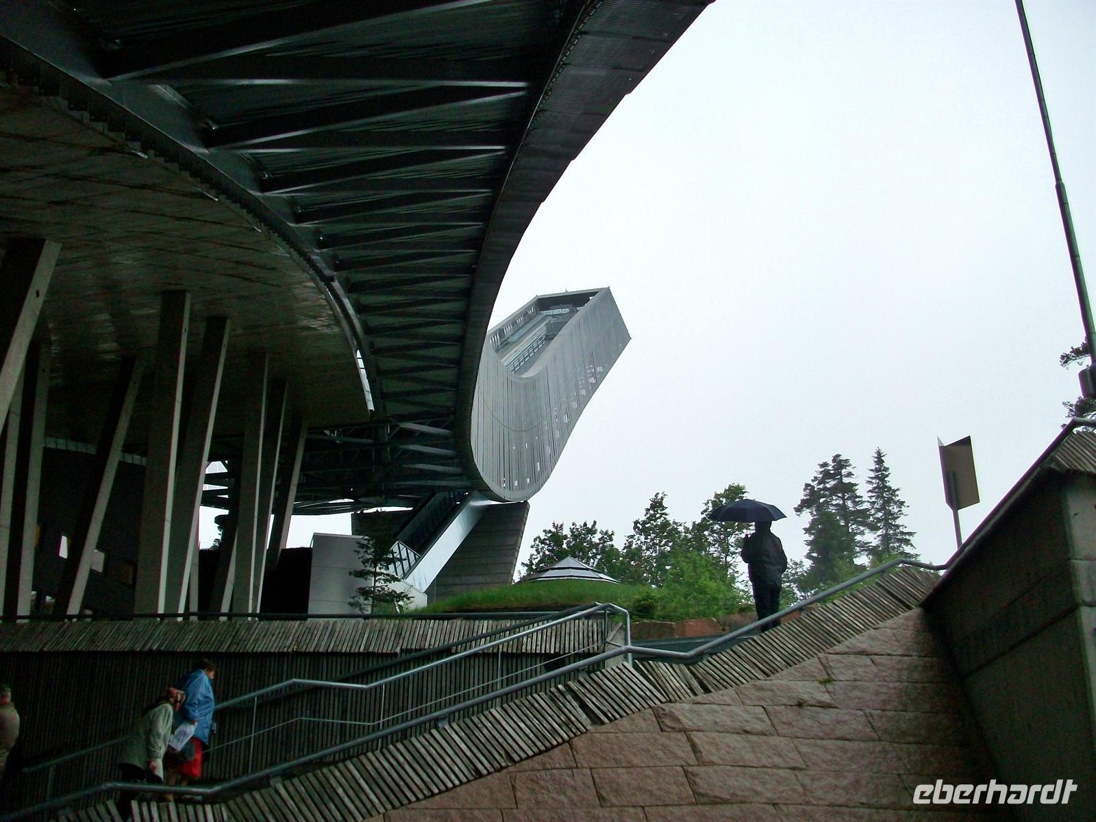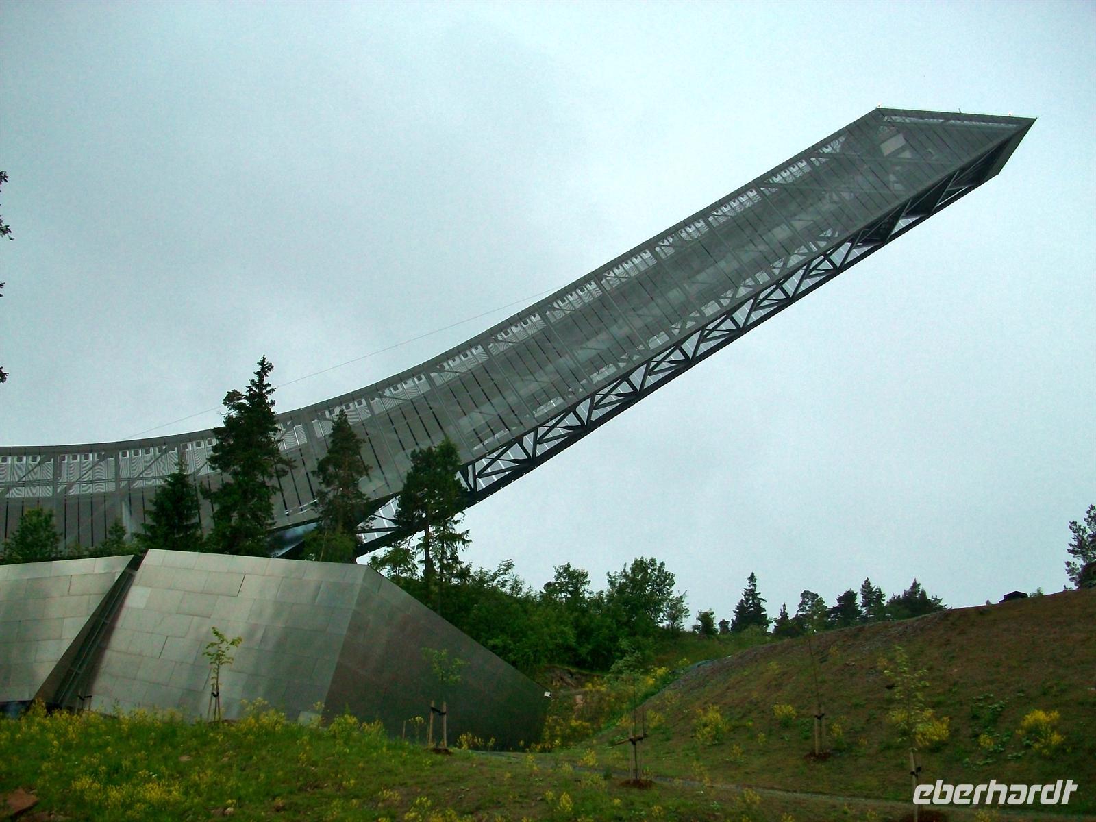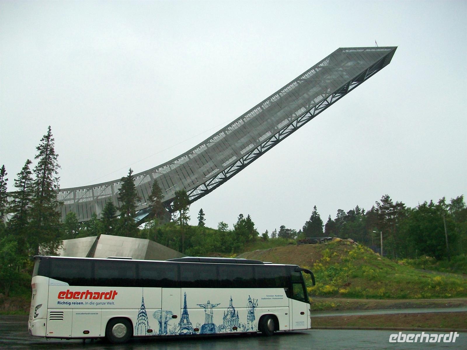 Das hemmt aber unseren Tatendrang nicht, unser erstes Ziel heute ist etwas für die Sportfreunde, wir besuchen den Holmenkollen. Von diesem Ort geht schon immer im Nordischen Skisport eine magische Faszination aus. Wir steigen mit unserem Bus den Berg hinan und sind bald oben angelangt. Vor unseren Augen öffnet sich der Blick auf diese eigenartige Schanzenanlage die erst vor wenigen Jahren vollständig modernisiert wurde. Bei einem kleinen Spaziergang zum Aufsprunghang sehen wir staunend welch ein Mut dazu gehört hier hinunter zu springen, so etwas muss man einfach im Original gesehen haben.
