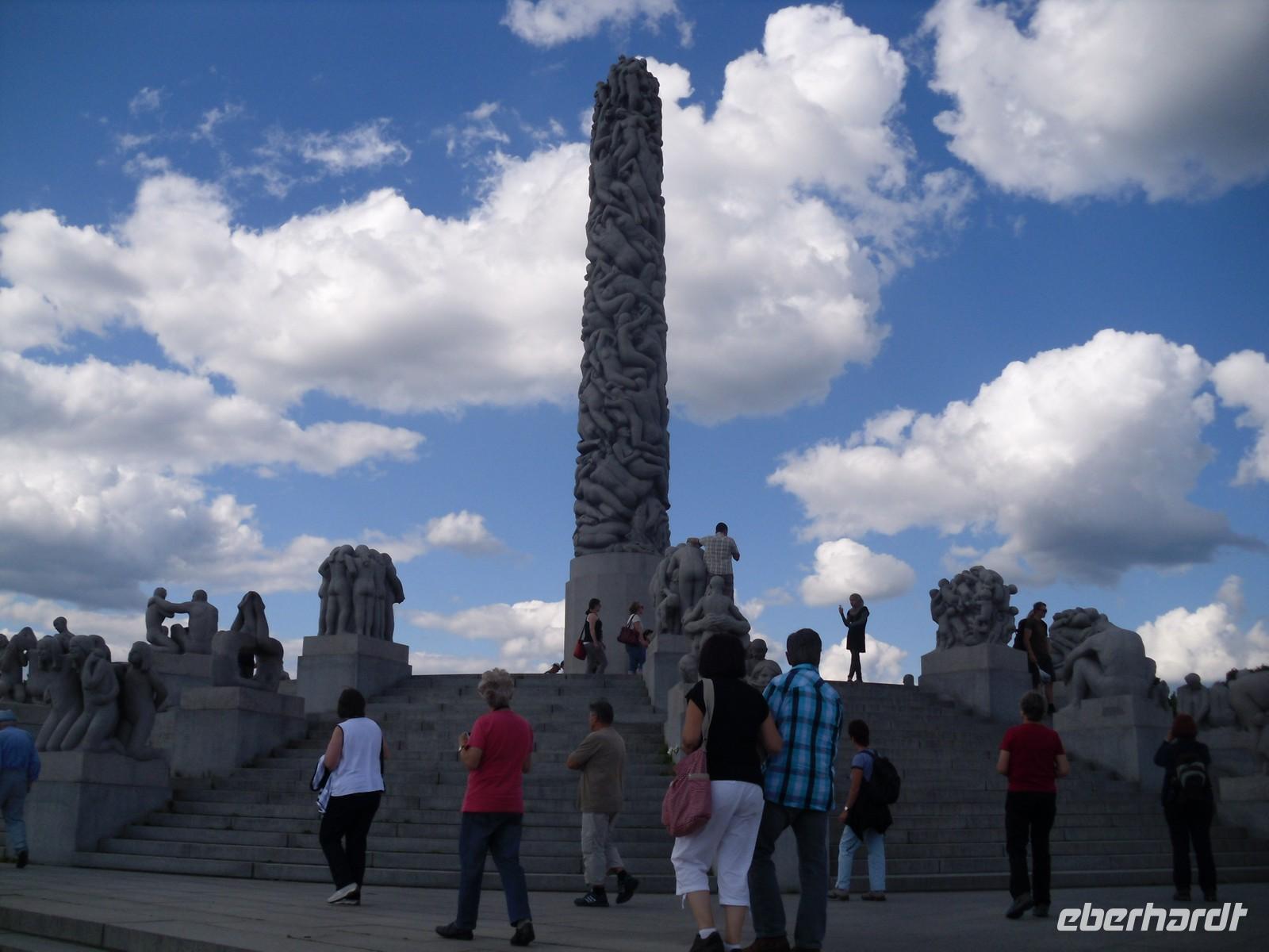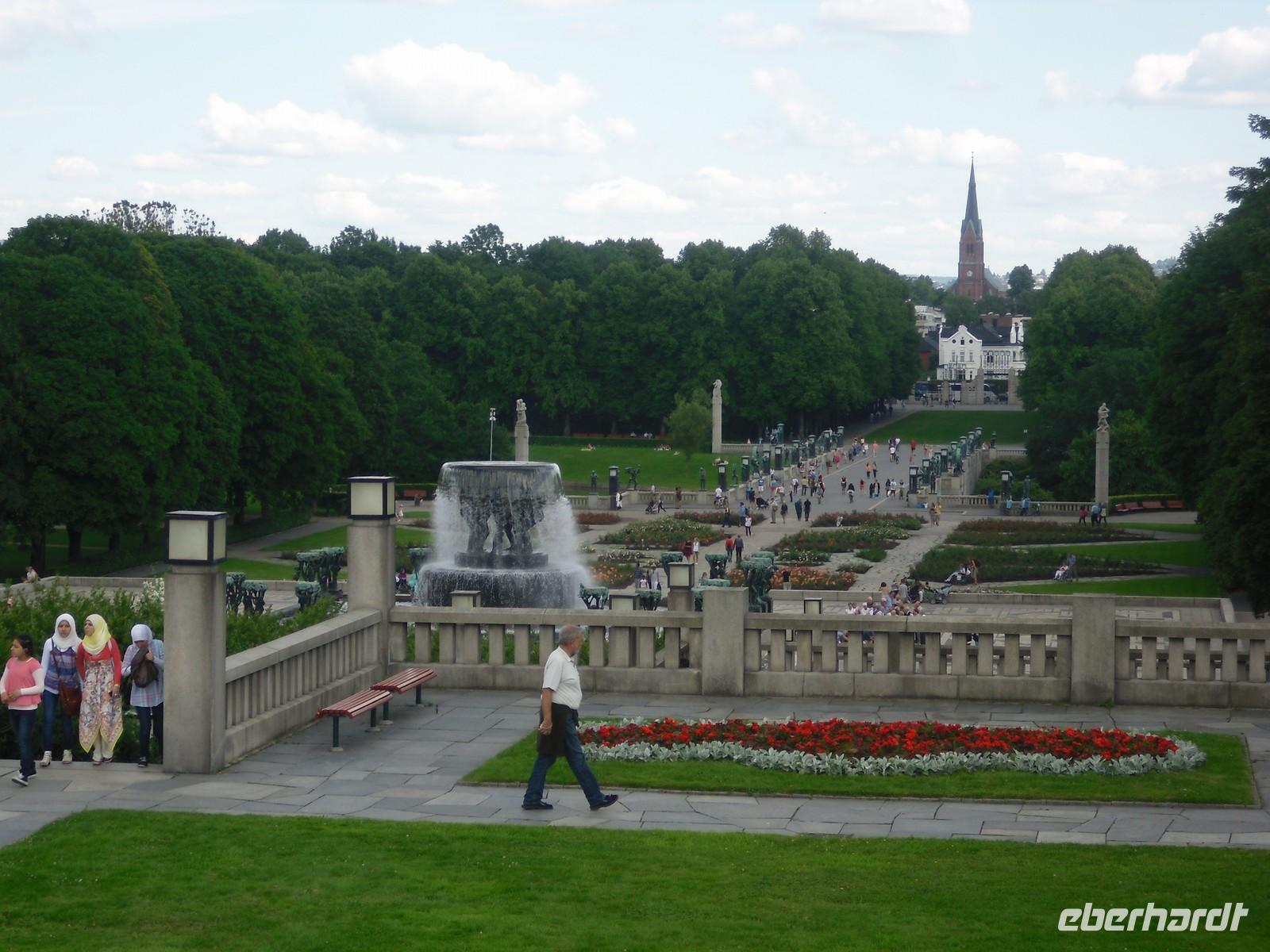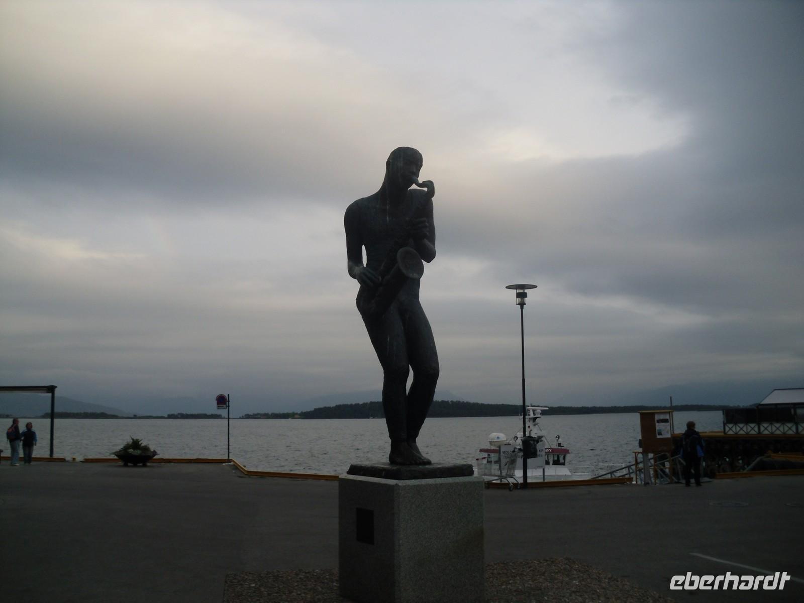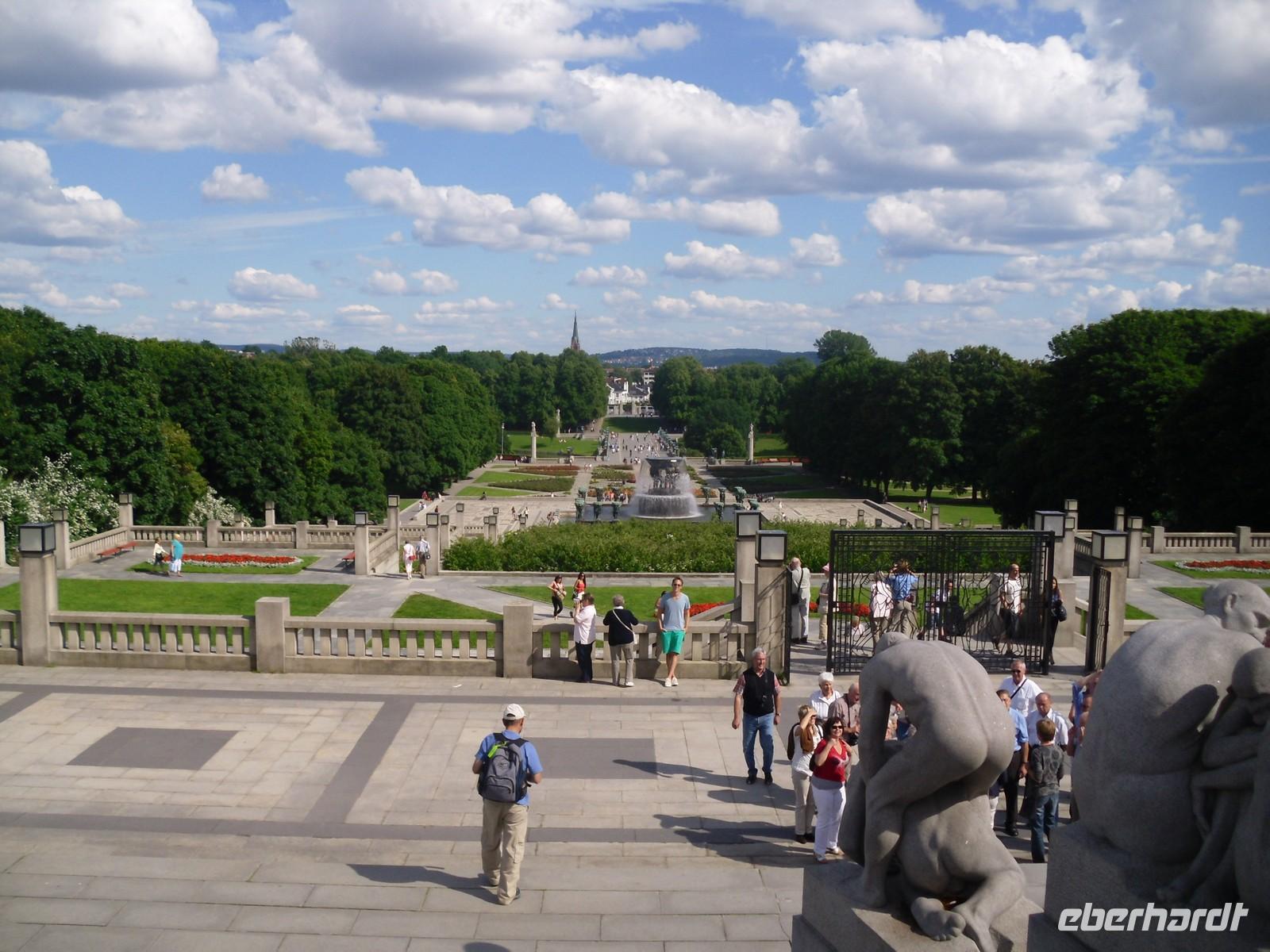 wir zu Fuß-ein schönes Erlebnis. In der Mitte markiert ein Schild die norwegische Grenze. Einen schönen Blick auf die Neue Brücke und den Svinesund können wir haben und im Bild festhalten. Gemeinsam überqueren wir dann im Bus die Grenze zu Norwegen. Etwas schwierig ist das Tauschen in norwegische Kronen, in Halden gibt uns der Geldautomat keine Kronen, deshalb stoppen wir nochmals in Moss am Flughafen, hier gibt es Norwegische Kronen und wir sind nun mit Geld versorgt. Die norwegische Hauptstadt am Oslofjord lernen wir während einer Rundfahrt kennen. Unser Reiseleiter hier in Oslo fährt mit uns hinauf zur alten Kapitänsschule, von hier gibt es einen herrlichen Blick über die Stadt bis zum Holmenkollen hinauf. Unsere Tour durch Oslo geht bis hin zum Vigelandpark mit seiner Skulpturenvielfalt, diesen fantastischen Park, mit der Darstellung des Lebens eines Menschen, erkunden wir bei einer Führung zu Fuß. Vorbei am königlichen Schloss, der neuen Oper und hin zum Rathaus führt uns Heinz während der Rundfahrt. Wir verlassen die Stadt und setzen unsere Fahrt in Richtung Nord, am größten See Norwegens dem Mjösasee, fort. Auch hier wieder totaler Bauplatz unserer Straße der E6, aber bis zum Scandic Hotel Hamar kommen wir heute noch, hier wird übernachtet.