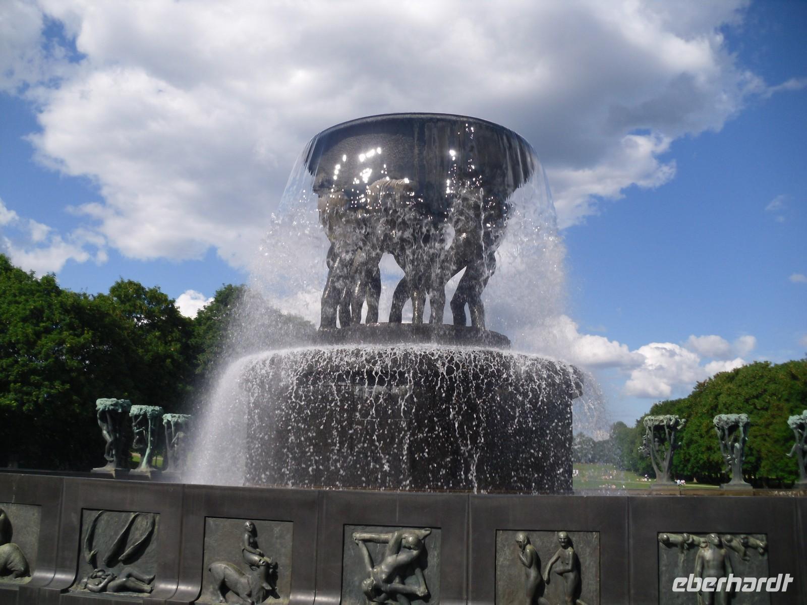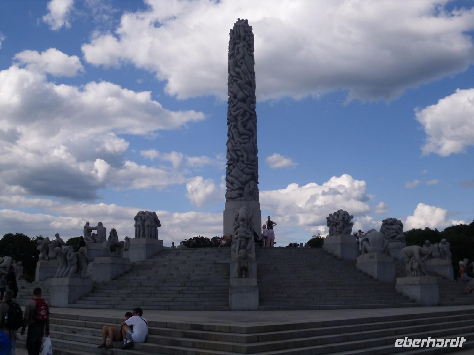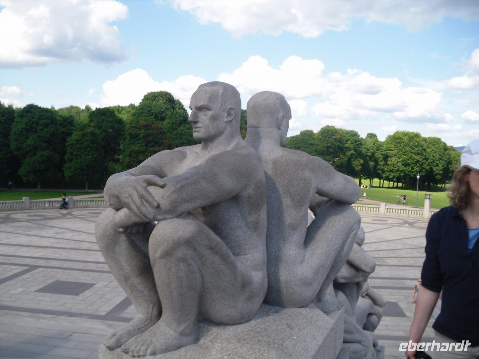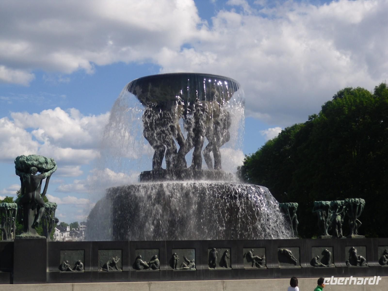 wir zu Fuß-ein schönes Erlebnis. In der Mitte markiert ein Schild die norwegische Grenze. Einen schönen Blick auf die Neue Brücke und den Svinesund können wir haben und im Bild festhalten. Gemeinsam überqueren wir dann im Bus die Grenze zu Norwegen. Etwas schwierig ist das Tauschen in norwegische Kronen, in Halden gibt uns der Geldautomat keine Kronen, deshalb stoppen wir nochmals in Moss am Flughafen, hier gibt es Norwegische Kronen und wir sind nun mit Geld versorgt. Die norwegische Hauptstadt am Oslofjord lernen wir während einer Rundfahrt kennen. Unser Reiseleiter hier in Oslo fährt mit uns hinauf zur alten Kapitänsschule, von hier gibt es einen herrlichen Blick über die Stadt bis zum Holmenkollen hinauf. Unsere Tour durch Oslo geht bis hin zum Vigelandpark mit seiner Skulpturenvielfalt, diesen fantastischen Park, mit der Darstellung des Lebens eines Menschen, erkunden wir bei einer Führung zu Fuß. Vorbei am königlichen Schloss, der neuen Oper und hin zum Rathaus führt uns Heinz während der Rundfahrt. Wir verlassen die Stadt und setzen unsere Fahrt in Richtung Nord, am größten See Norwegens dem Mjösasee, fort. Auch hier wieder totaler Bauplatz unserer Straße der E6, aber bis zum Scandic Hotel Hamar kommen wir heute noch, hier wird übernachtet.