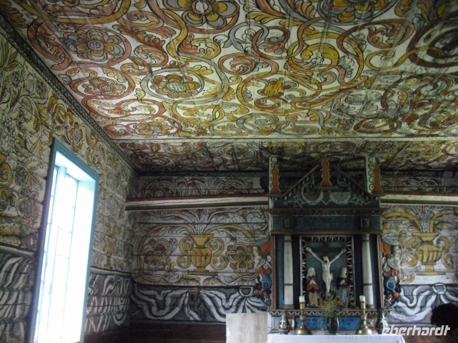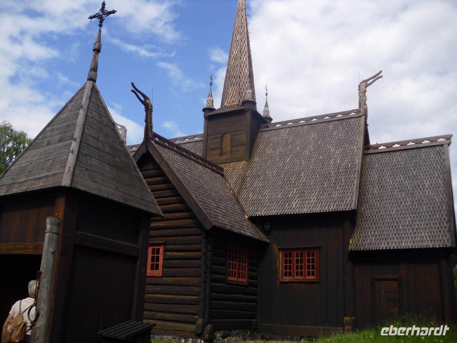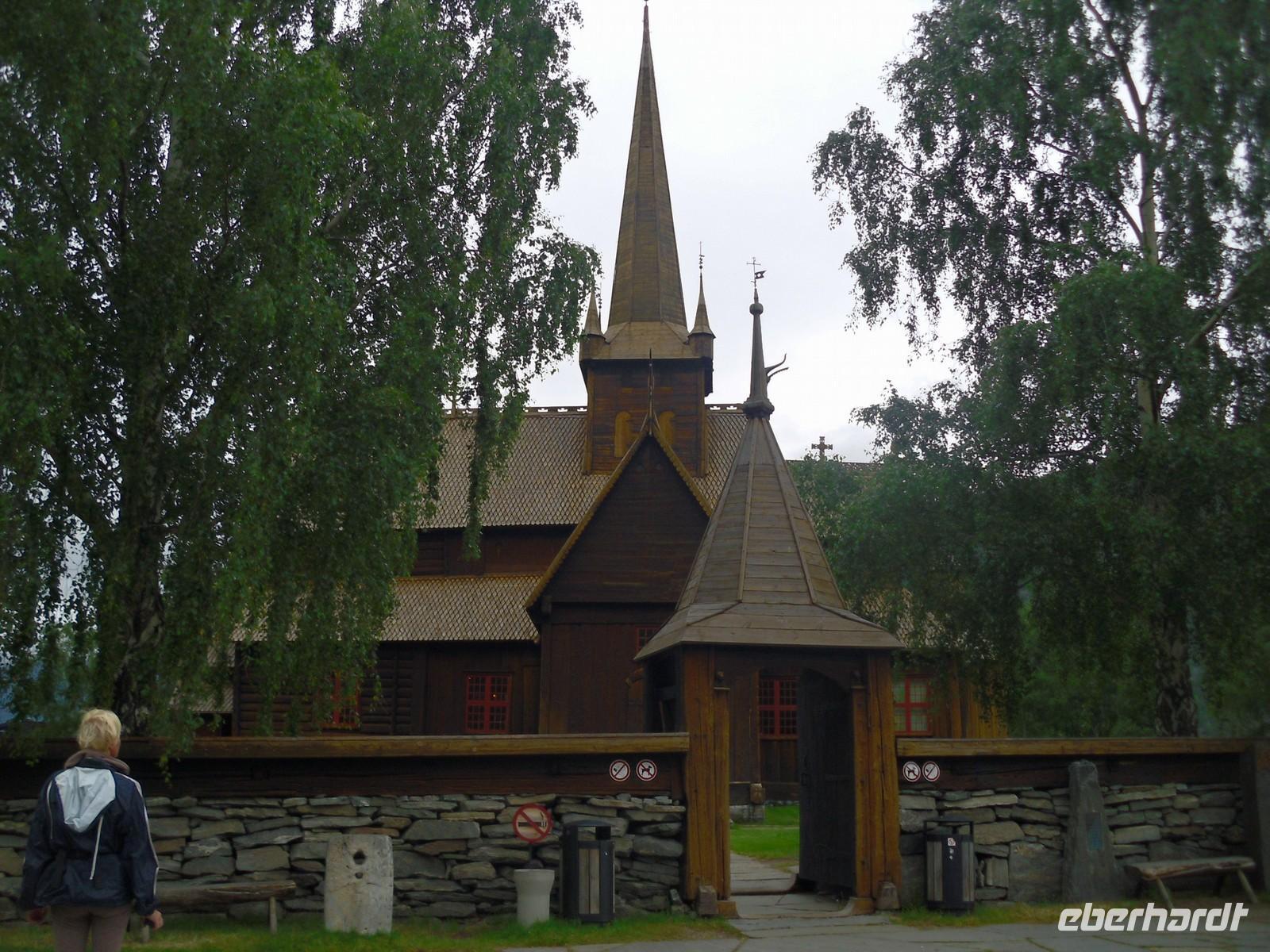 durch das Bergmassiv, viel Wasser und Schnee auf dem Weg nach oben sehen wir. Bei einem Fotostopp weit oberhalb vom Geirangerfjord genießen wir atemberaubende Blicke in den smaragdgrünen Fjord und die Kreuzfahrtschiffe. Für uns geht die Fahrt im Bus immer weiter auf der im Jahre 1885 fertiggestellten Straße RV 63 mit 8% Steigung, 20 engen Kehren und 1000m Höhenunterschied. Es wird auf der ca. 17 km langen Strecke vom Fjord wegführend rauer, ein mit Schnee und Eis gemischtes Gebirgsklima empfängt uns in der Höhe. Der Gipfel des 1495 m hohen Dalsnibba ist heute nicht zu sehen. Unser Mittagsstopp an der Djupvatnethytta auf 1038m findet bei Kälte und im Nebel statt. Über Grotli vorüber an einigen großen Seen fahren wir durch das Ottadalen bis nach Lom. In der Stabkirche Lom erhalten wir bei einer Führung Einblicke in die einzigartige Holzbauweise mit liebevollen Details, wie z.B. die Drachenköpfe an den Giebeln. Durch den Nationalpark Jotunheimen fahren wir bis nach Elveseter, wo wir im Traditionshotel im Bøverdalen übernachten. Heute wohnen wir wie im Museum und am Kamin nehmen wir in anheimelnder Atmosphäre den Kaffee nach dem Abendessen ein. Die Geschichte des Traditionshotels, welches seit 5 Generationen im Familienbesitz ist, bekommen wir vom Hausherrn sehr schön erklärt und in der Ahnengalerie können wir auch darüber lesen.