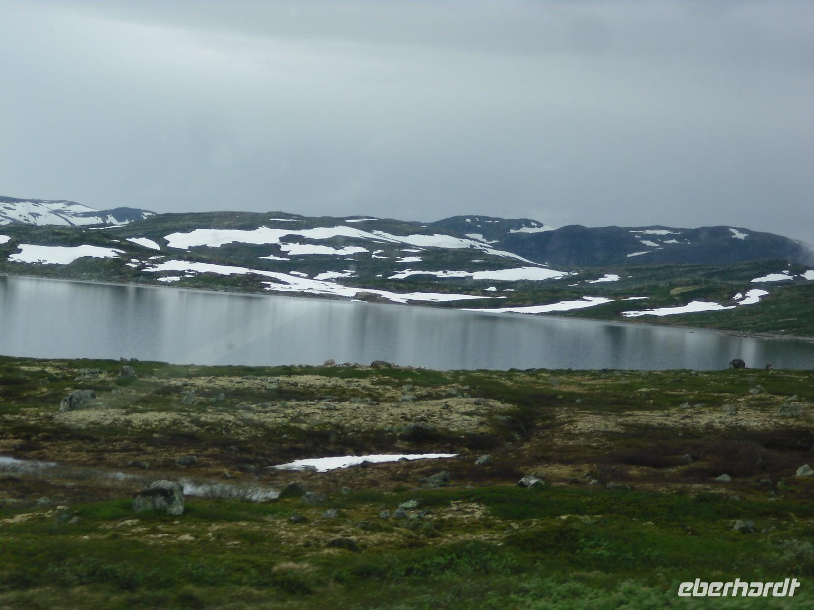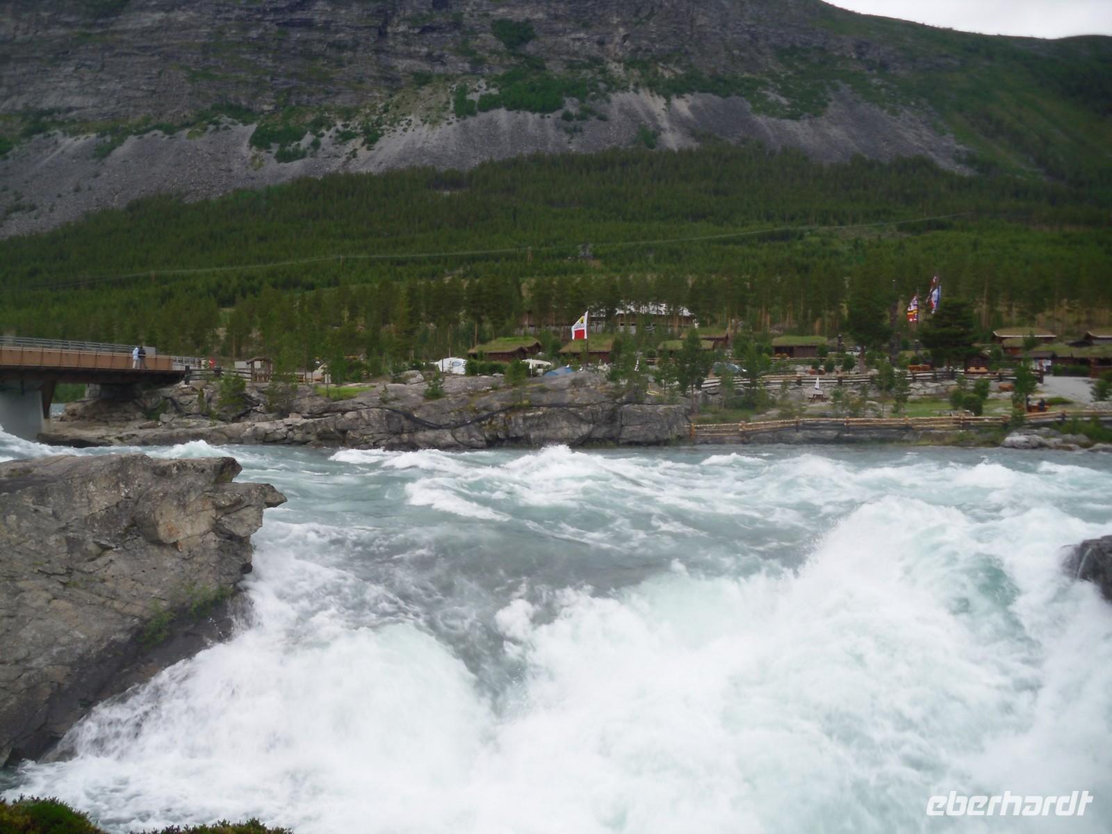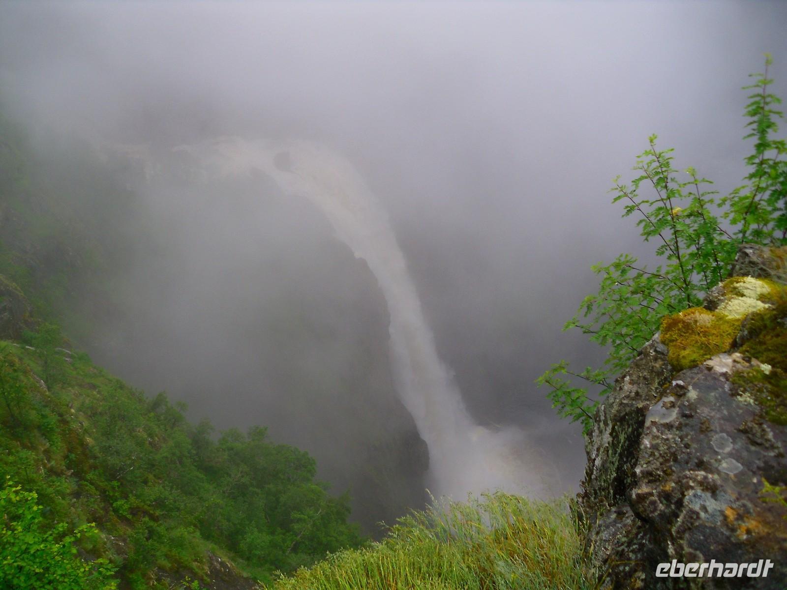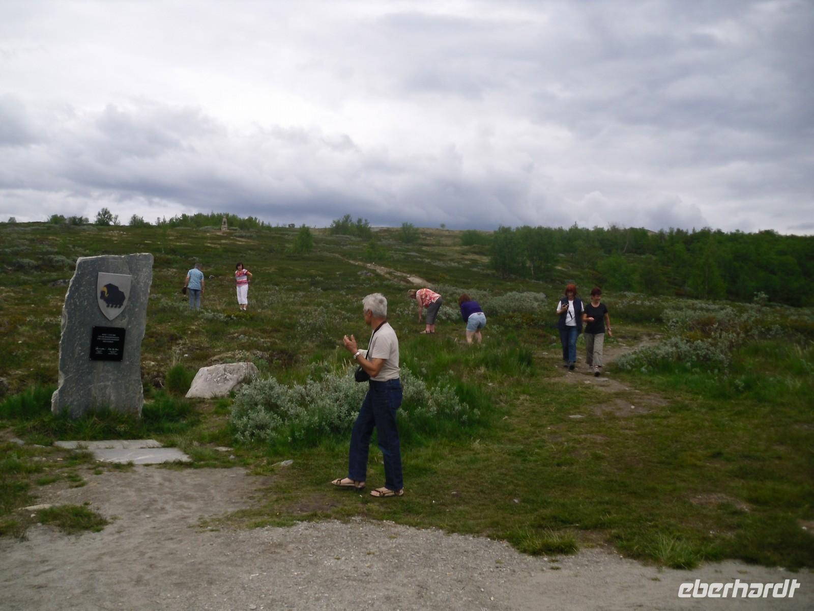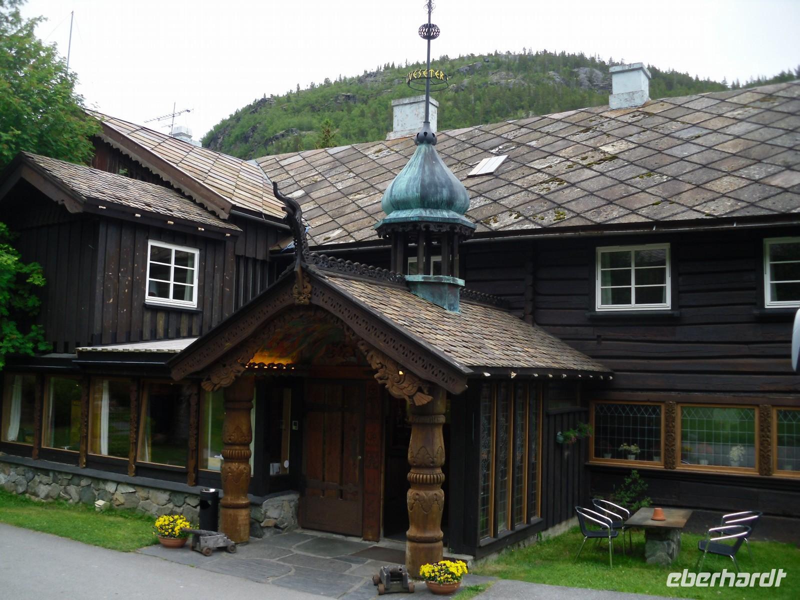 hin zum Dach dieses Traumlandes. Wir schrauben uns in einem gewaltigen Tunnelsystem im Mabödalen nach oben und bei Regen und schlechter Sicht erleben wir heute den gigantischen Wasserfall Vøringfossen, er ergießt sich in eine Schlucht, 182m im freien Fall. Die Straße Nr.7 bringt uns direkt durch das weite Gebiet der Hardangervidda, diese beeindruckende Hochebene präsentiert sich als eine seen- und moorreiche, fast baum-und strauchlose Fjell-Landschaft. Leider können wir den uns bietenden Blick in den Gletscher Hardangerjokulen nicht fotografieren, es gibt keine Möglichkeit zum Parken für unseren Bus. Bei Ingrid im Samenshop schauen wir noch in die Hütte, sie hat tolle Sachen zu verkaufen, Rentierfelle und Geweihe auch. Durch Geilo-auch das "Zermatt Norwegens" genannt, fahren wir weiter nach Noresund, hier übernachten wir heute im Best Western Sole Hotel. Allein treffen wir uns zum Abendessen, keine weitere Gruppe im Hause, es tut richtig gut die Ruhe. Ja und der Abend ist auch trocken geblieben, wir hoffen alle auf besseres Reisewetter für Donnerstag nach Oslo.