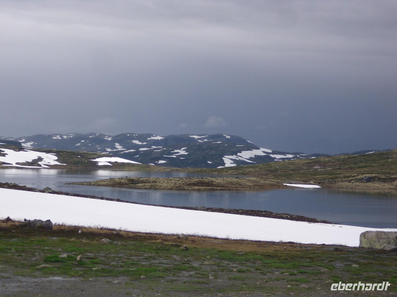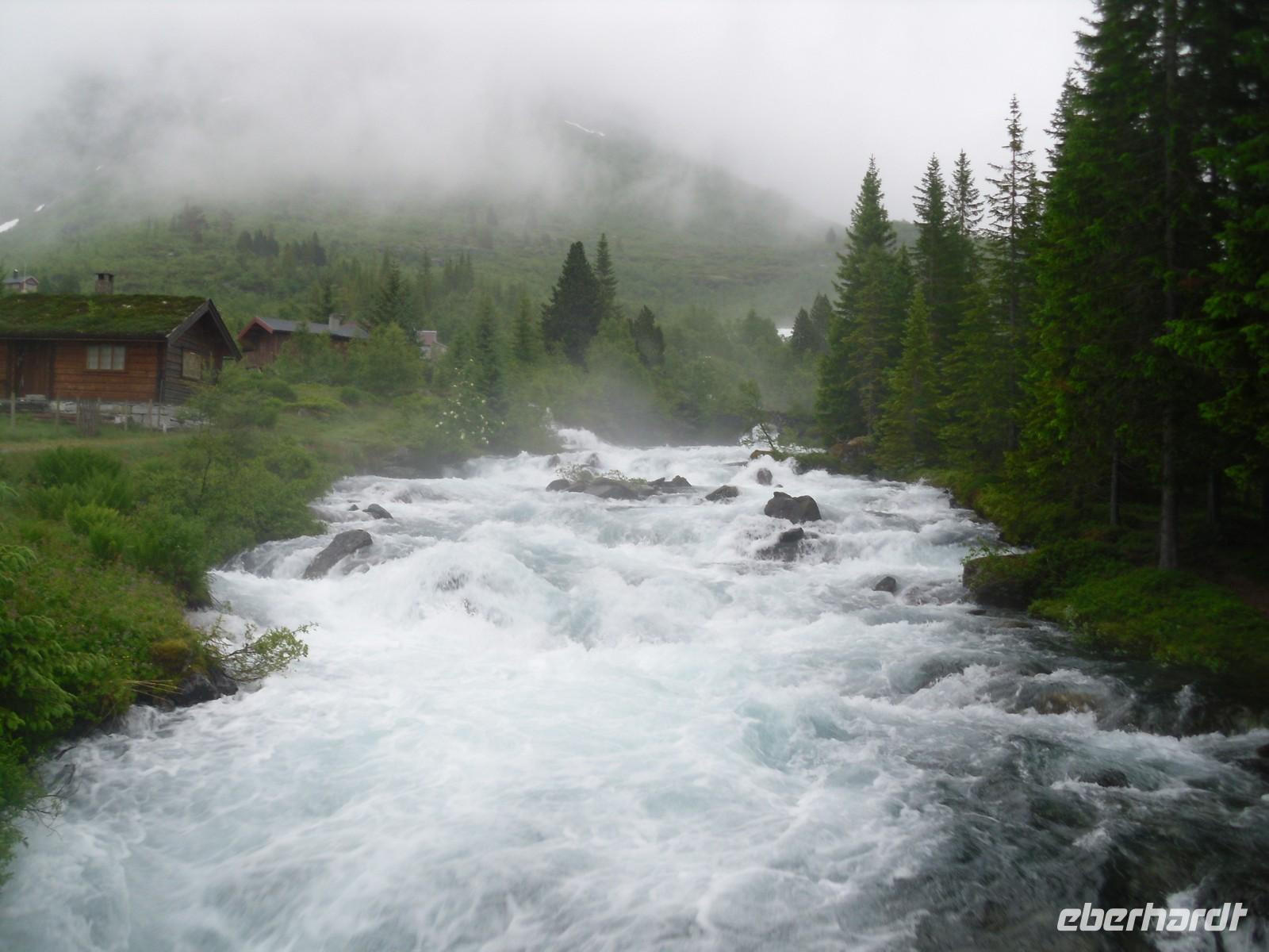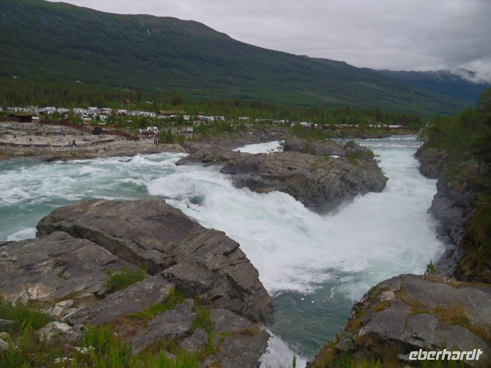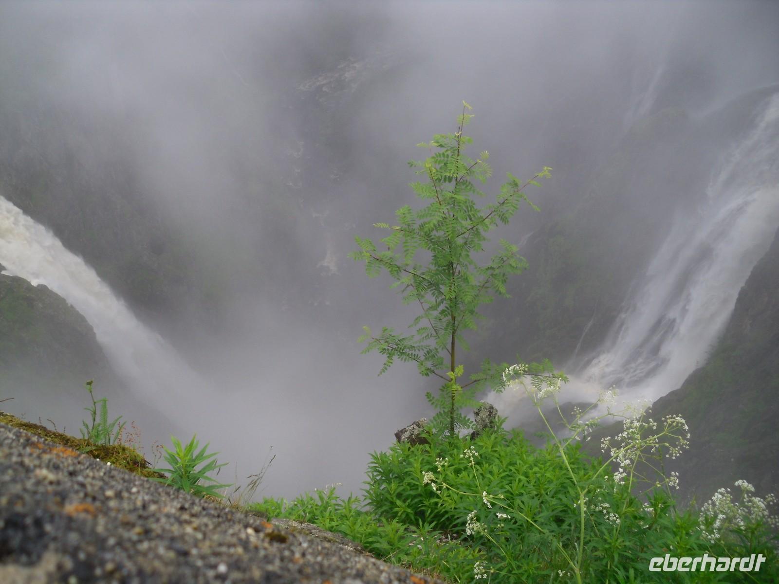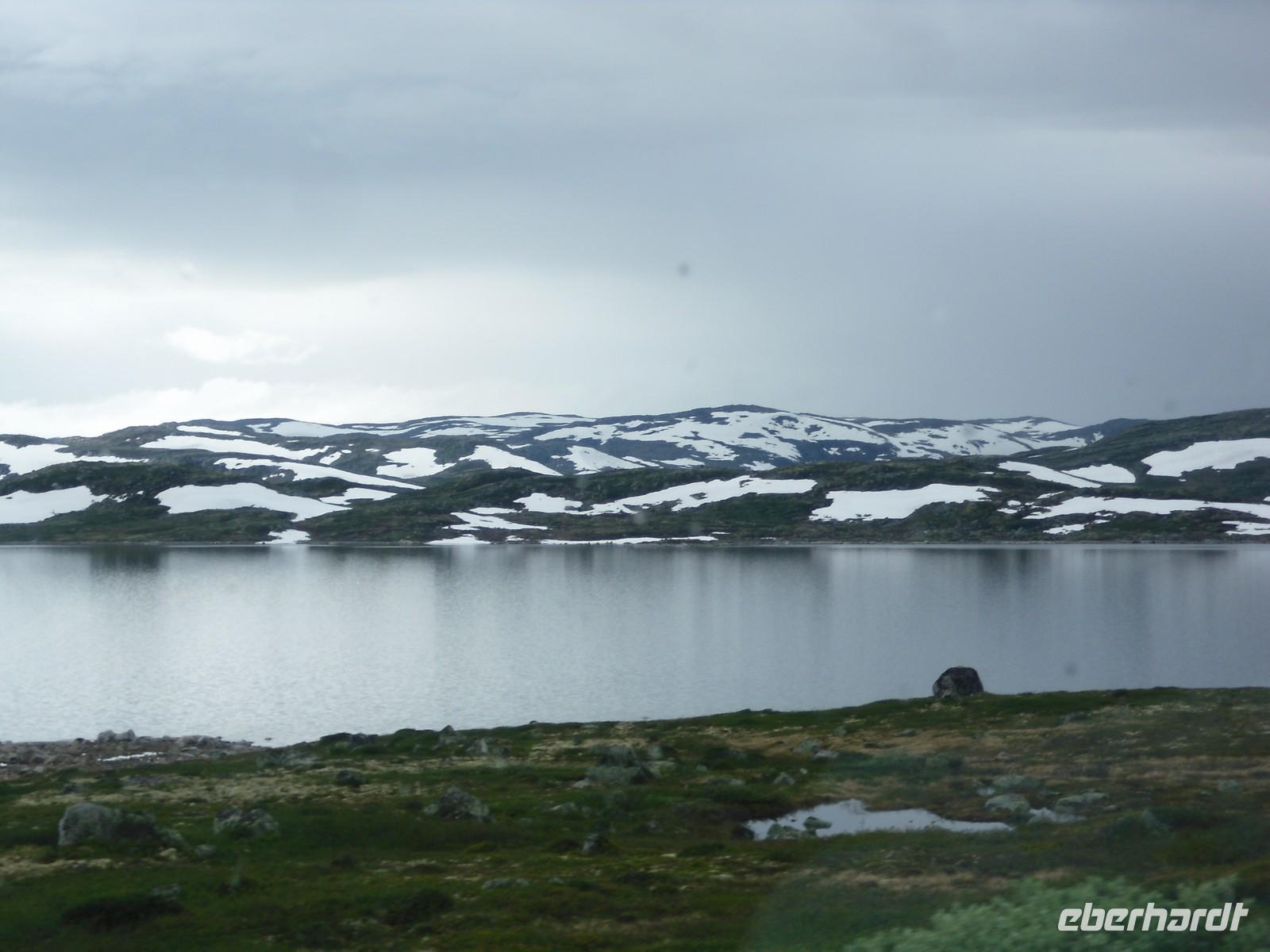 hin zum Dach dieses Traumlandes. Wir schrauben uns in einem gewaltigen Tunnelsystem im Mabödalen nach oben und bei Regen und schlechter Sicht erleben wir heute den gigantischen Wasserfall Vøringfossen, er ergießt sich in eine Schlucht, 182m im freien Fall. Die Straße Nr.7 bringt uns direkt durch das weite Gebiet der Hardangervidda, diese beeindruckende Hochebene präsentiert sich als eine seen- und moorreiche, fast baum-und strauchlose Fjell-Landschaft. Leider können wir den uns bietenden Blick in den Gletscher Hardangerjokulen nicht fotografieren, es gibt keine Möglichkeit zum Parken für unseren Bus. Bei Ingrid im Samenshop schauen wir noch in die Hütte, sie hat tolle Sachen zu verkaufen, Rentierfelle und Geweihe auch. Durch Geilo-auch das "Zermatt Norwegens" genannt, fahren wir weiter nach Noresund, hier übernachten wir heute im Best Western Sole Hotel. Allein treffen wir uns zum Abendessen, keine weitere Gruppe im Hause, es tut richtig gut die Ruhe. Ja und der Abend ist auch trocken geblieben, wir hoffen alle auf besseres Reisewetter für Donnerstag nach Oslo.