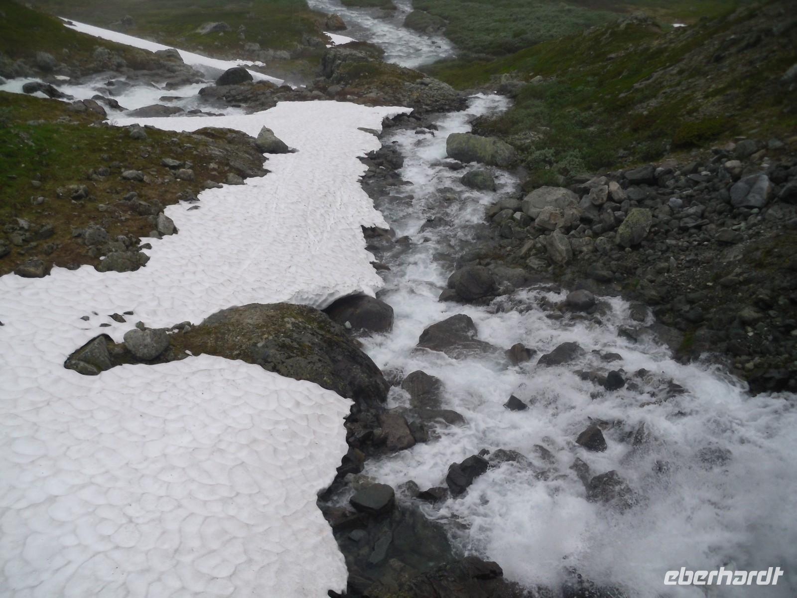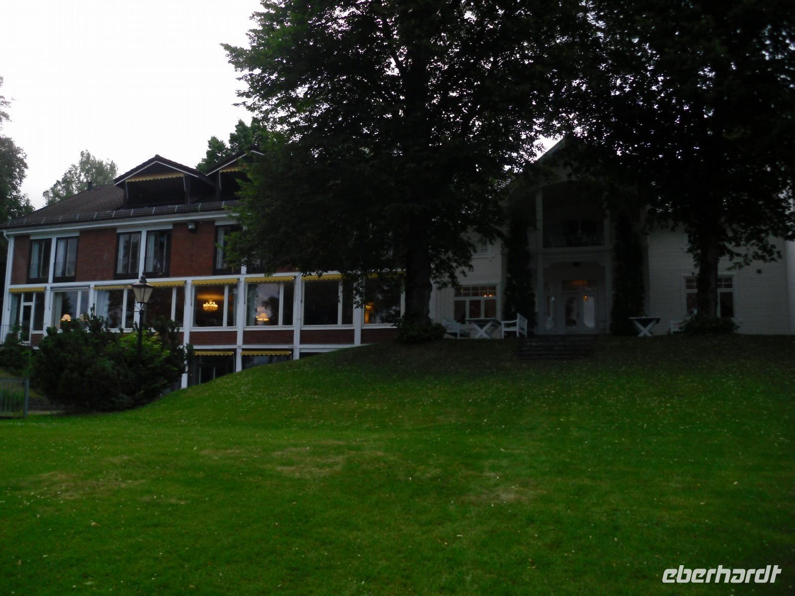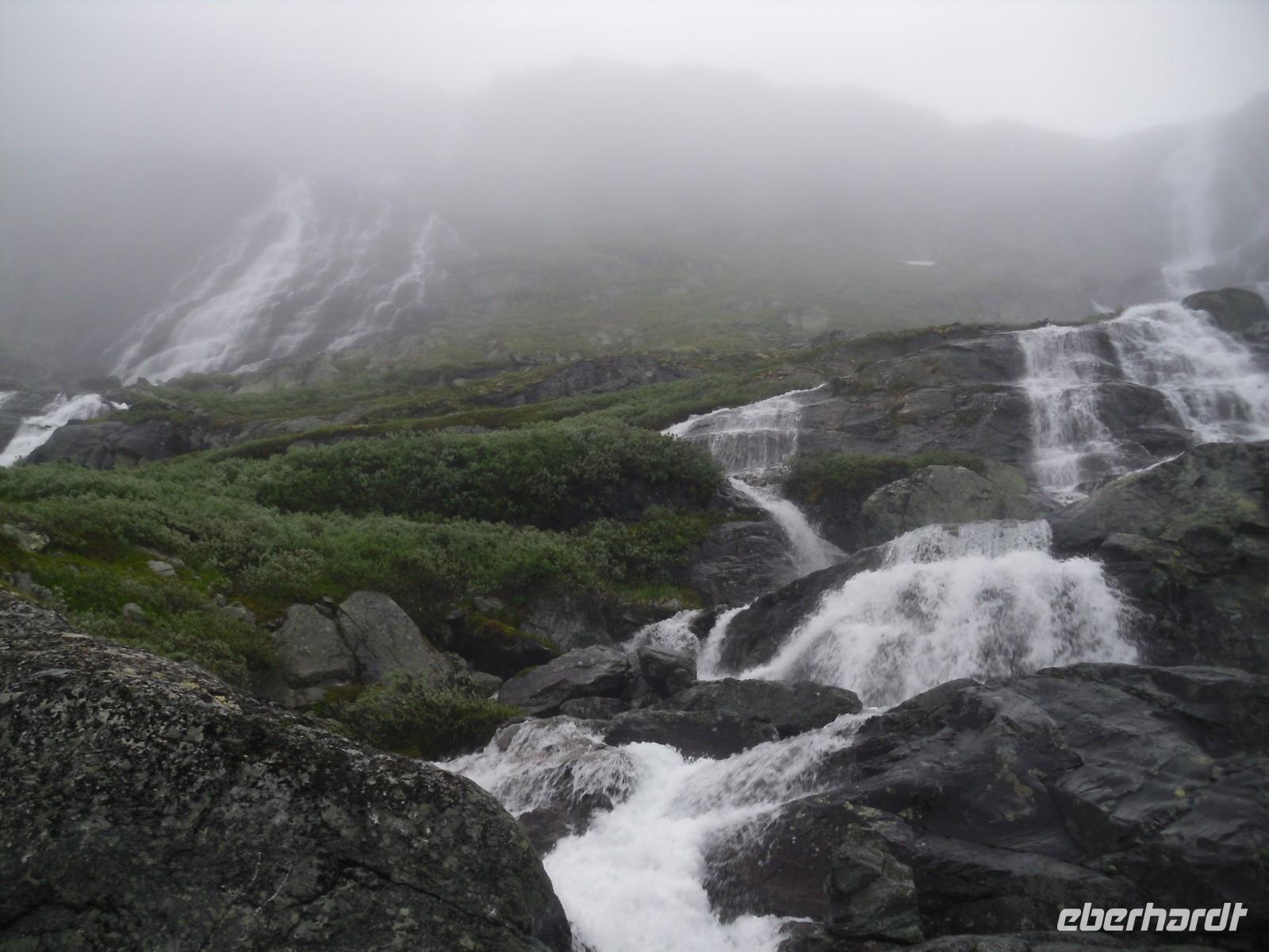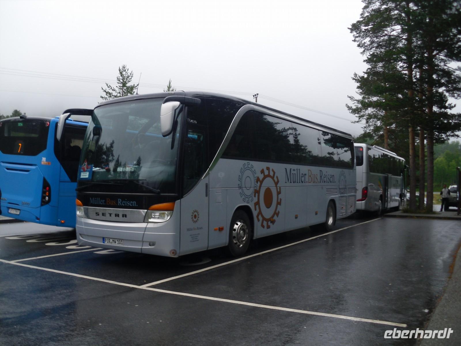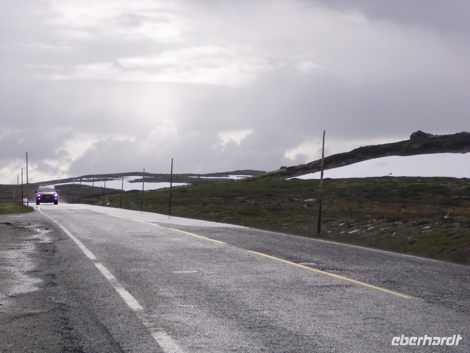 hin zum Dach dieses Traumlandes. Wir schrauben uns in einem gewaltigen Tunnelsystem im Mabödalen nach oben und bei Regen und schlechter Sicht erleben wir heute den gigantischen Wasserfall Vøringfossen, er ergießt sich in eine Schlucht, 182m im freien Fall. Die Straße Nr.7 bringt uns direkt durch das weite Gebiet der Hardangervidda, diese beeindruckende Hochebene präsentiert sich als eine seen- und moorreiche, fast baum-und strauchlose Fjell-Landschaft. Leider können wir den uns bietenden Blick in den Gletscher Hardangerjokulen nicht fotografieren, es gibt keine Möglichkeit zum Parken für unseren Bus. Bei Ingrid im Samenshop schauen wir noch in die Hütte, sie hat tolle Sachen zu verkaufen, Rentierfelle und Geweihe auch. Durch Geilo-auch das "Zermatt Norwegens" genannt, fahren wir weiter nach Noresund, hier übernachten wir heute im Best Western Sole Hotel. Allein treffen wir uns zum Abendessen, keine weitere Gruppe im Hause, es tut richtig gut die Ruhe. Ja und der Abend ist auch trocken geblieben, wir hoffen alle auf besseres Reisewetter für Donnerstag nach Oslo.