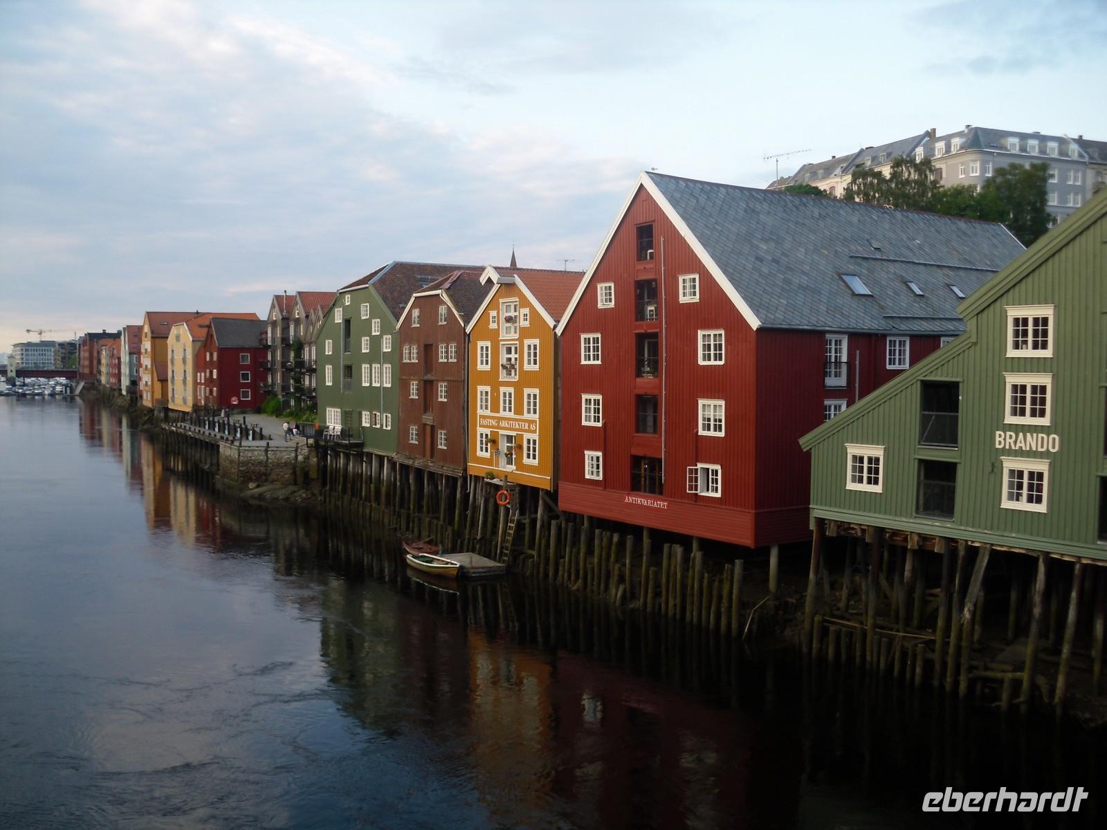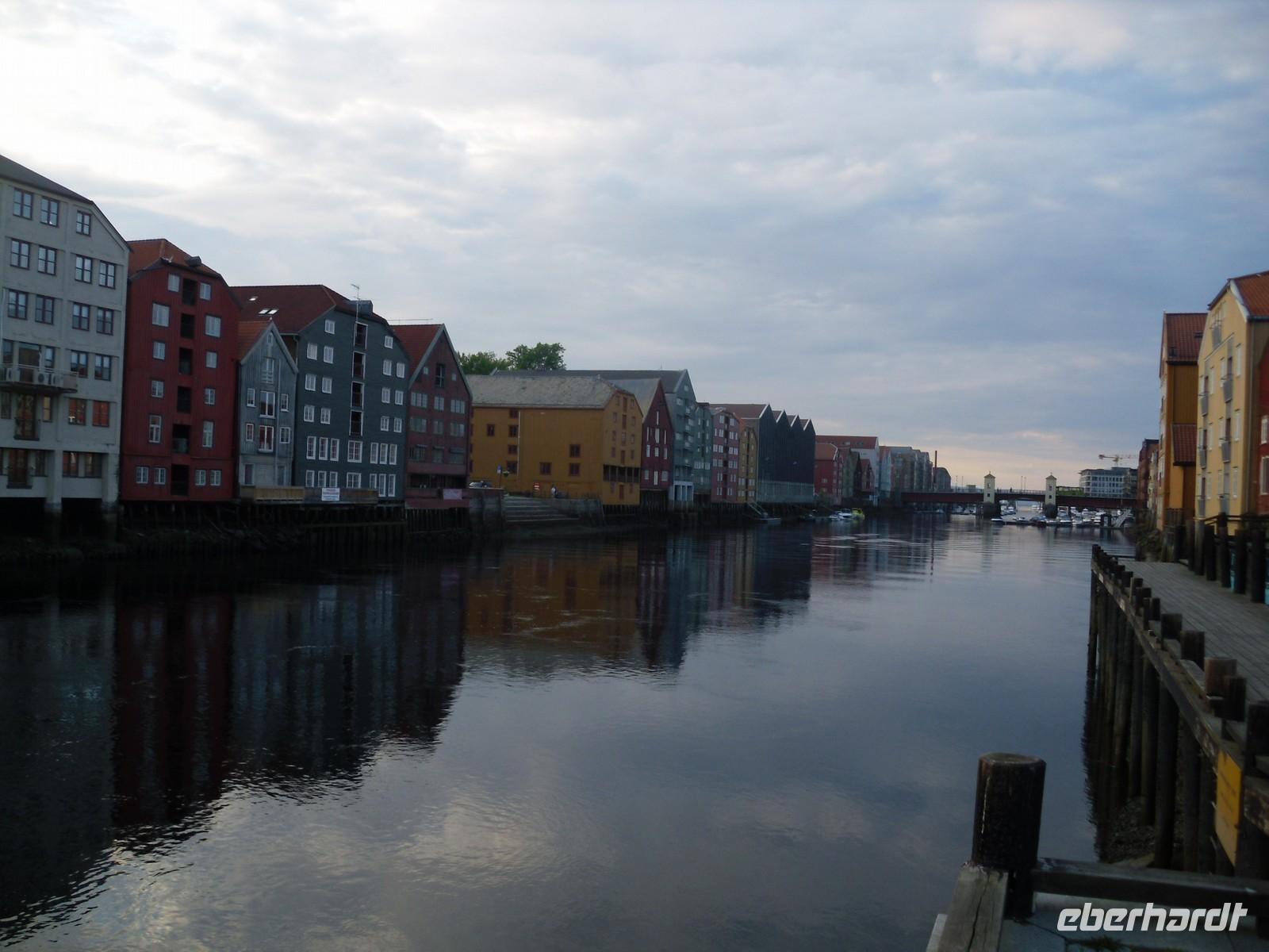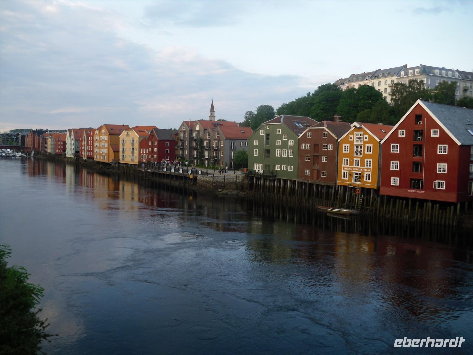 aufgebracht, dann Grasnarbe mit Wurzeln nach Oben und noch eine Schicht davon zum Abschluss mit Erde nach Unten wegen der Isolierung und damit die Wurzeln nicht die Birkenrinde zerstören. In der alten Schule lernen wir etwas norwegisch und auch ein Lied singen wir gemeinsam. Thyra bringt uns die Geschichte der schönen alten Stabkirche von Garmo näher. Das Freilichtmuseum gibt einen grandiosen Einblick in die Geschichte Norwegens und das Leben auf den Höfen im Gudbrandsdal in der Vergangenheit. Weiter geht es auf der E6 in Richtung Norden durch Norwegens bekanntes Tal, das Gudbrandsdal, es ist Schauplatz vieler alter Legenden, von Kunst und Kultur, hier verläuft auch der Peer Gynt Veggen. In Dombas gibt es für uns alle die Möglichkeit, zum Einkauf von Souvenirs, wie Trolle, Elch -und Rentiersalami aber auch mit guten Prospekten aus der Touristeninformation haben wir uns eingedeckt. Über das einsam wirkende Dovrefjell setzen wir unsere Fahrt nach Trondheim fort. Schon immer mussten die Könige den beschwerlichen Weg auf dem Fjell nehmen, um in Trondheim ihre Weihe zu bekommen. Es ist daher auch der Königswegen-der historische Königs- und Pilgerweg nach Trondheim. Wir legen noch 2 Fotopausen unterwegs ein. Am Abend beziehen wir im Rica Bakklandet Hotel Quartier und nach dem mäßigen Abendessen lassen wir den Tag am Nidelv ausklingen, denn bei schönem Wetter erkunden wir noch Teile der Altstadt und kommen dabei bis hin zum Dom.